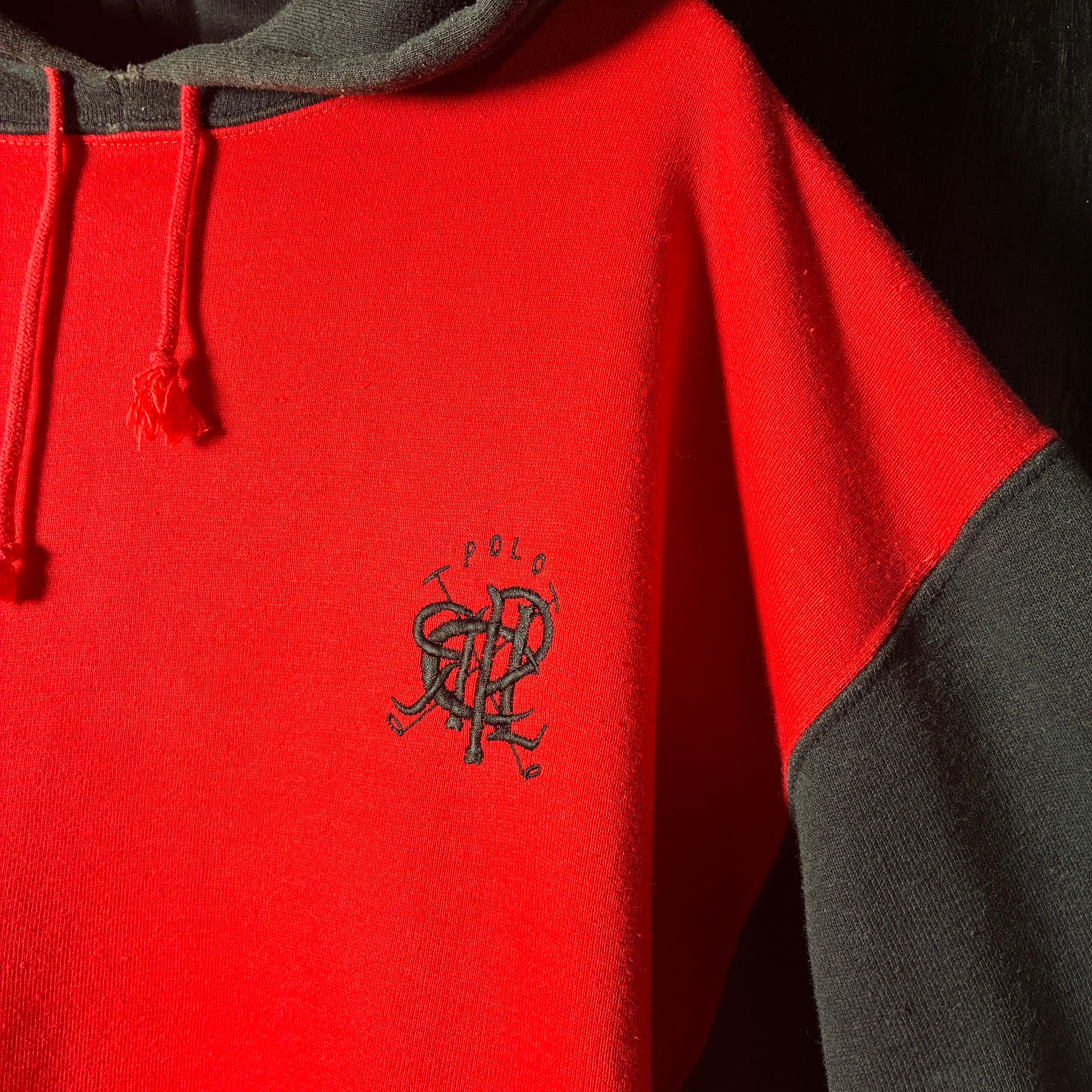 【90s USA製】POLO RALPH LAUREN プルオーバーパーカー 赤黒切替 XL ラルフ 刺繍ロゴ