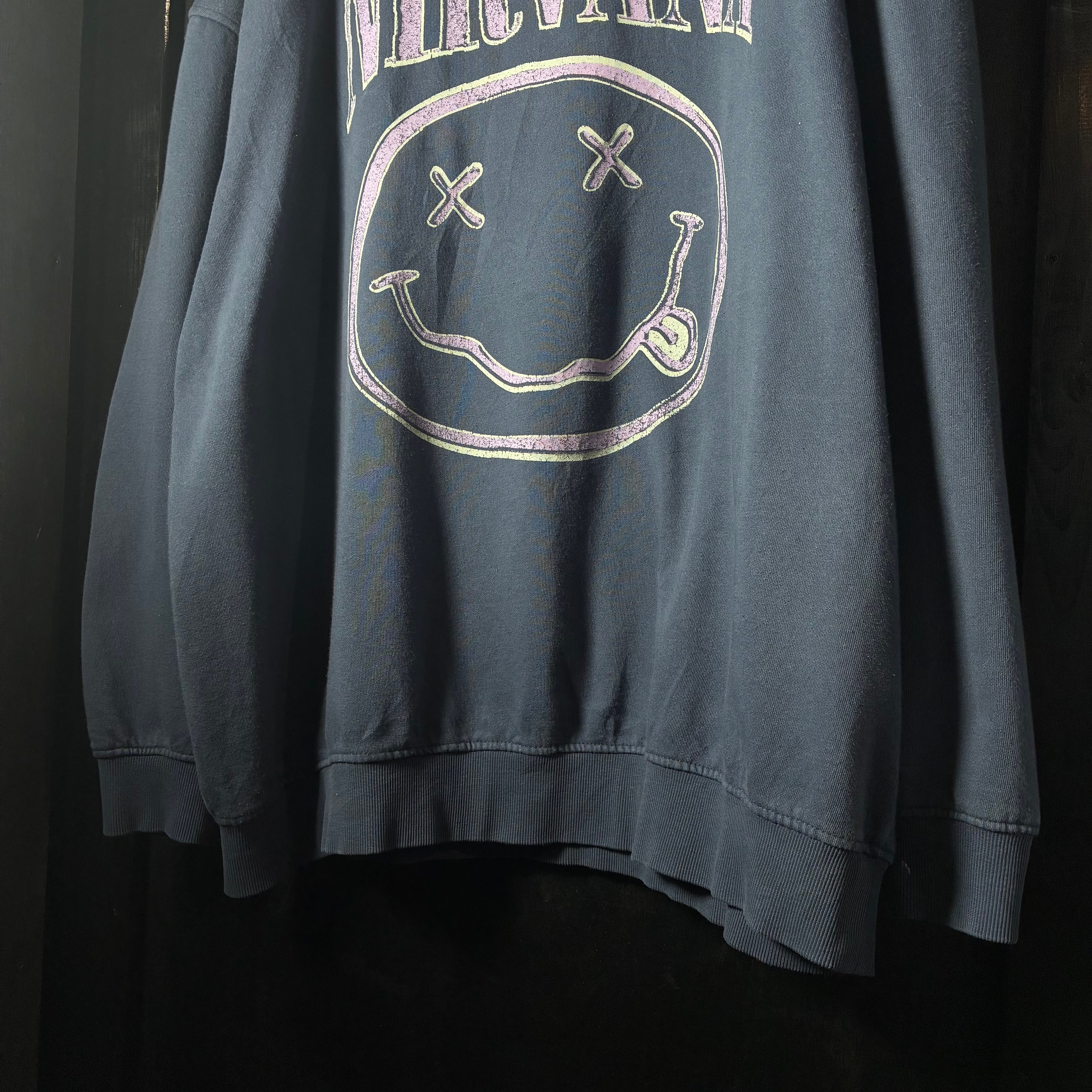 90sグランジを象徴するバンド「Nirvana」、アイコニックなスマイルロゴが大きくプリントされたスウェット。
