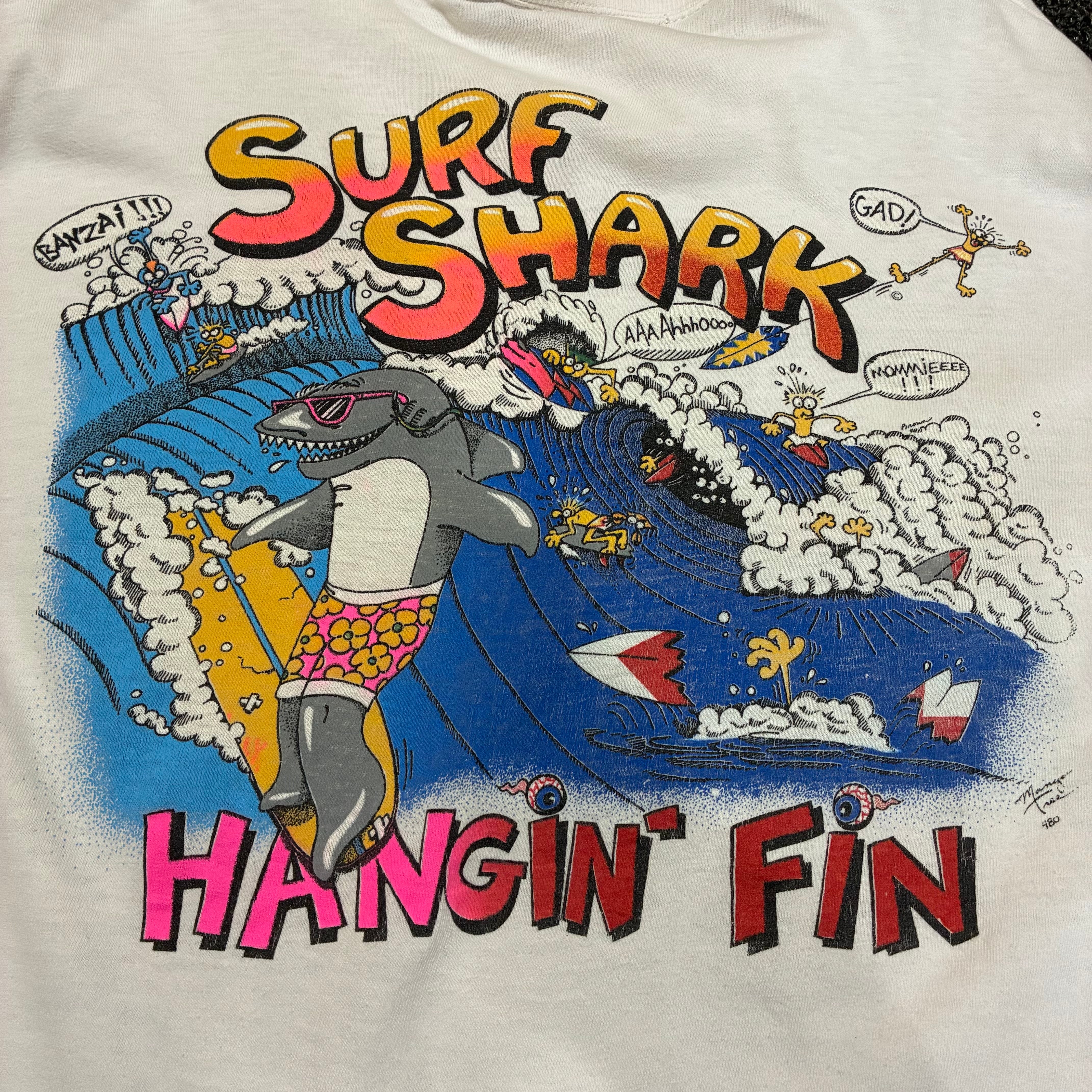 バックにはサメが波乗りするコミック調の「SURF SHARK / HANGIN’ FIN」グラフィック。