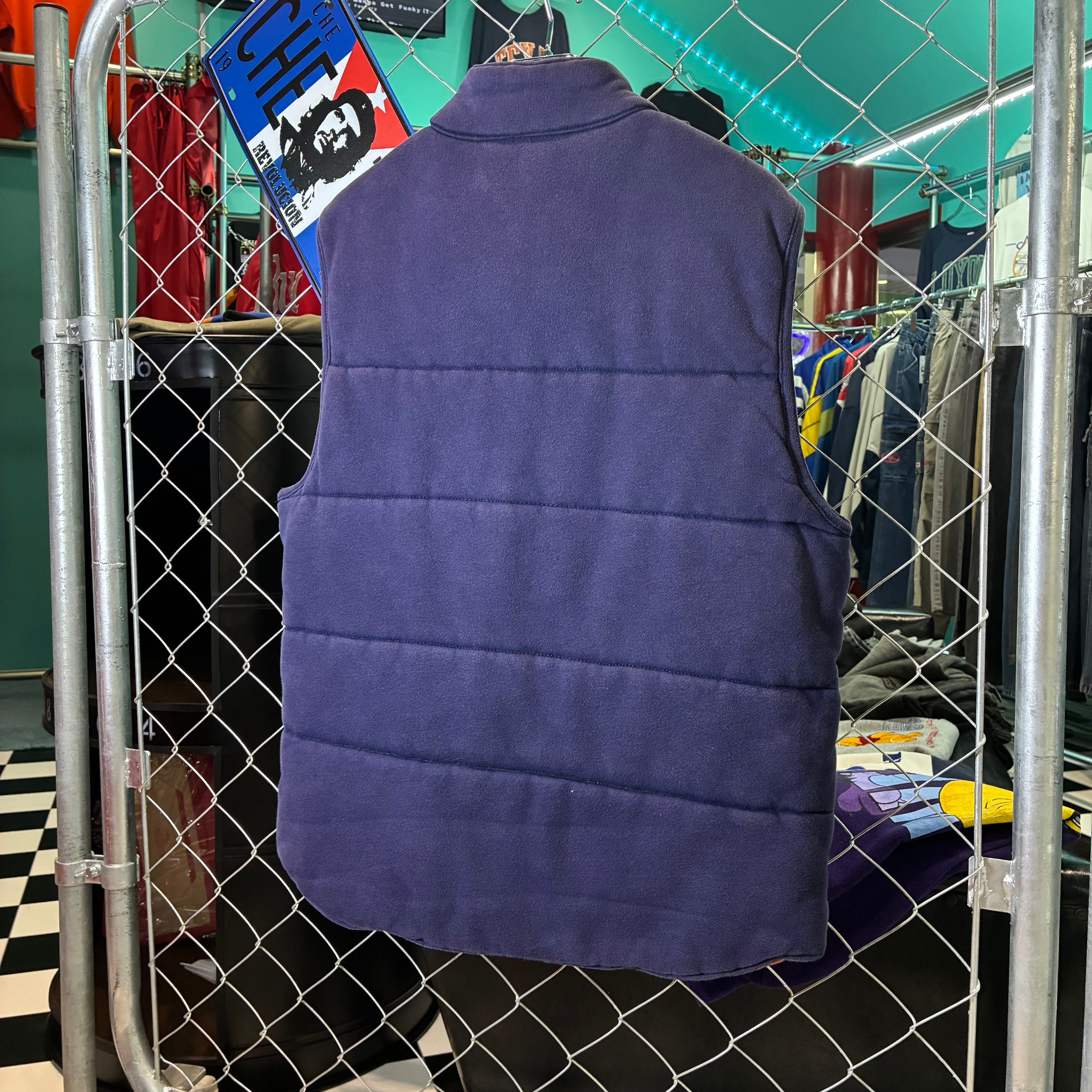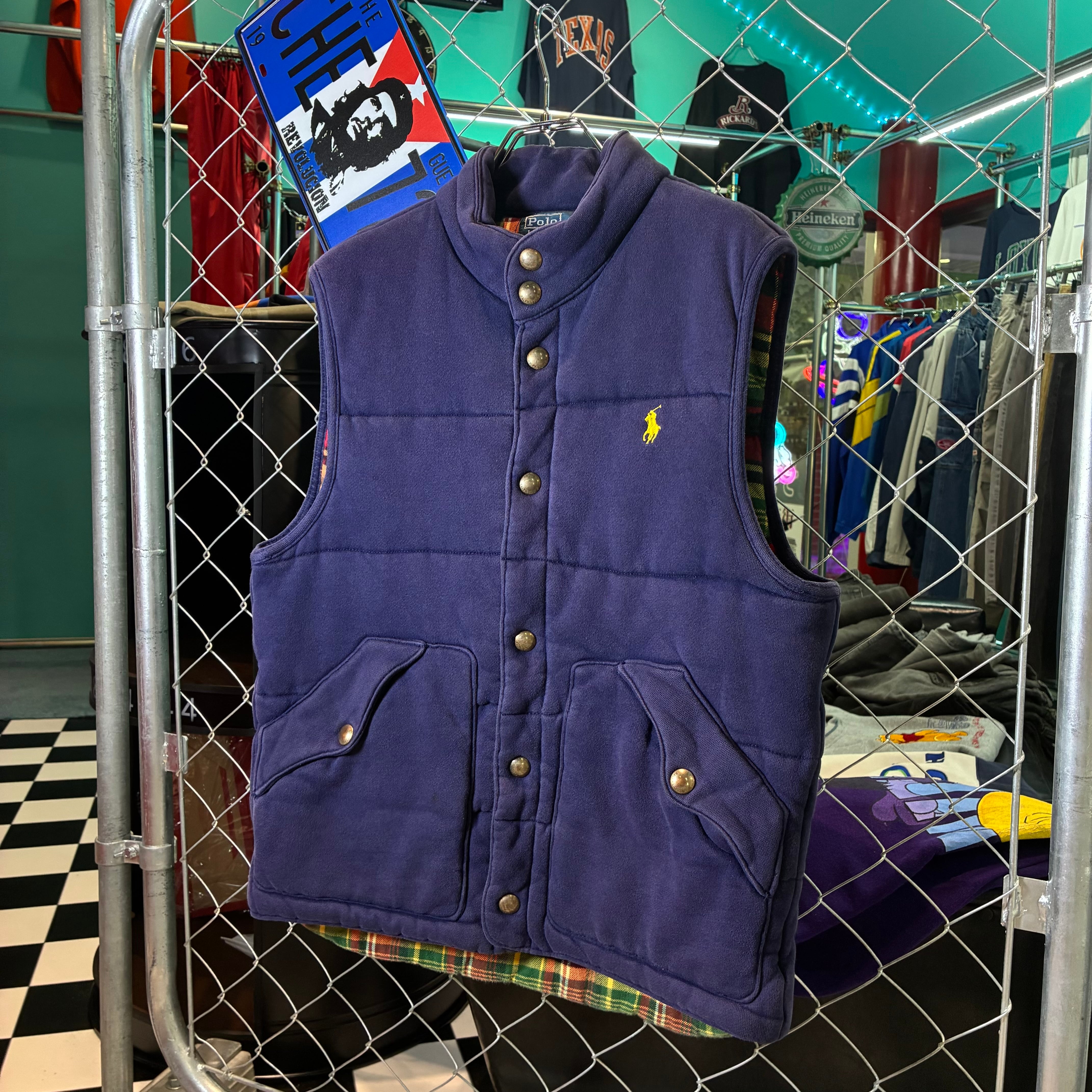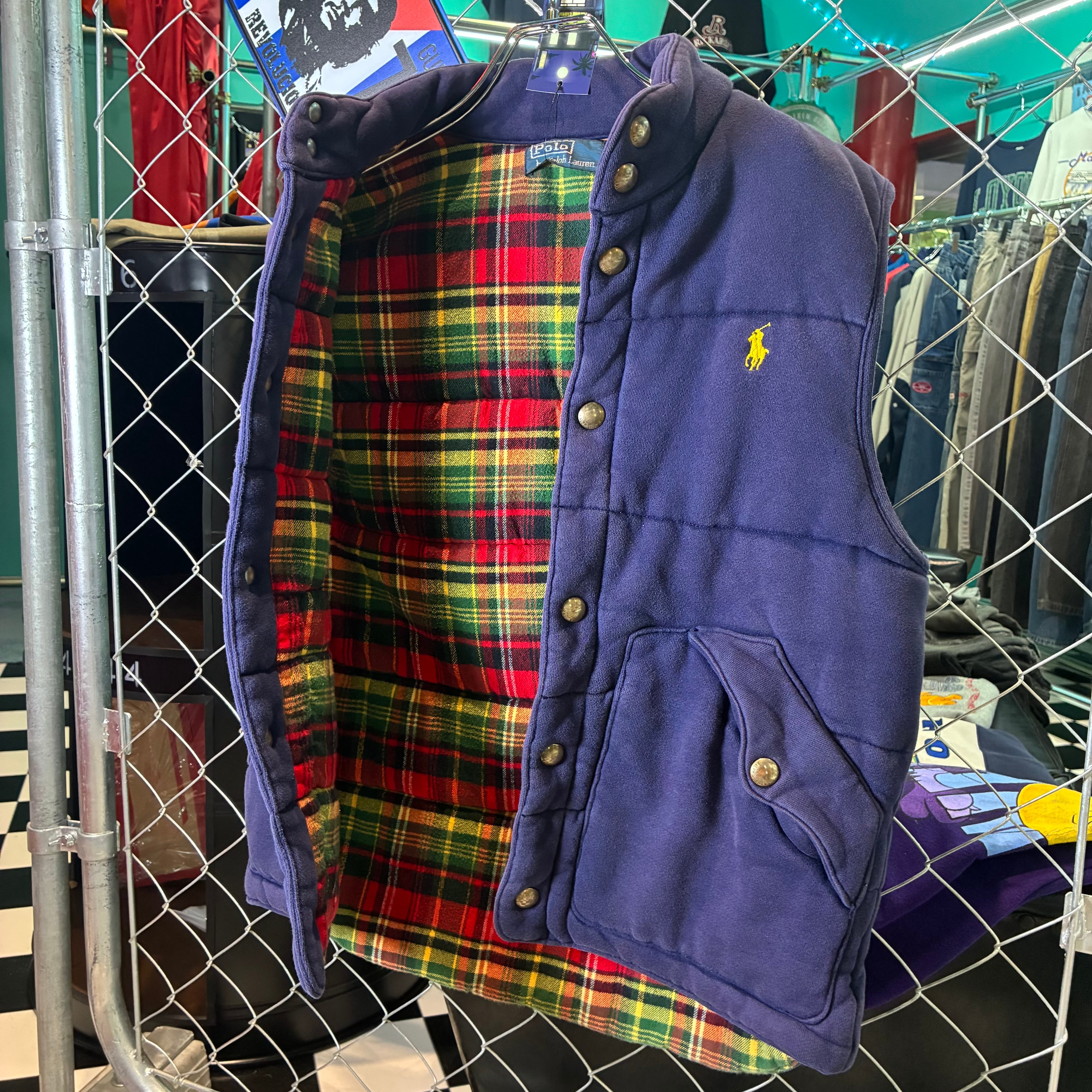 90s Polo Ralph Lauren コットンベスト 裏地チェック 中綿 ネイビー S