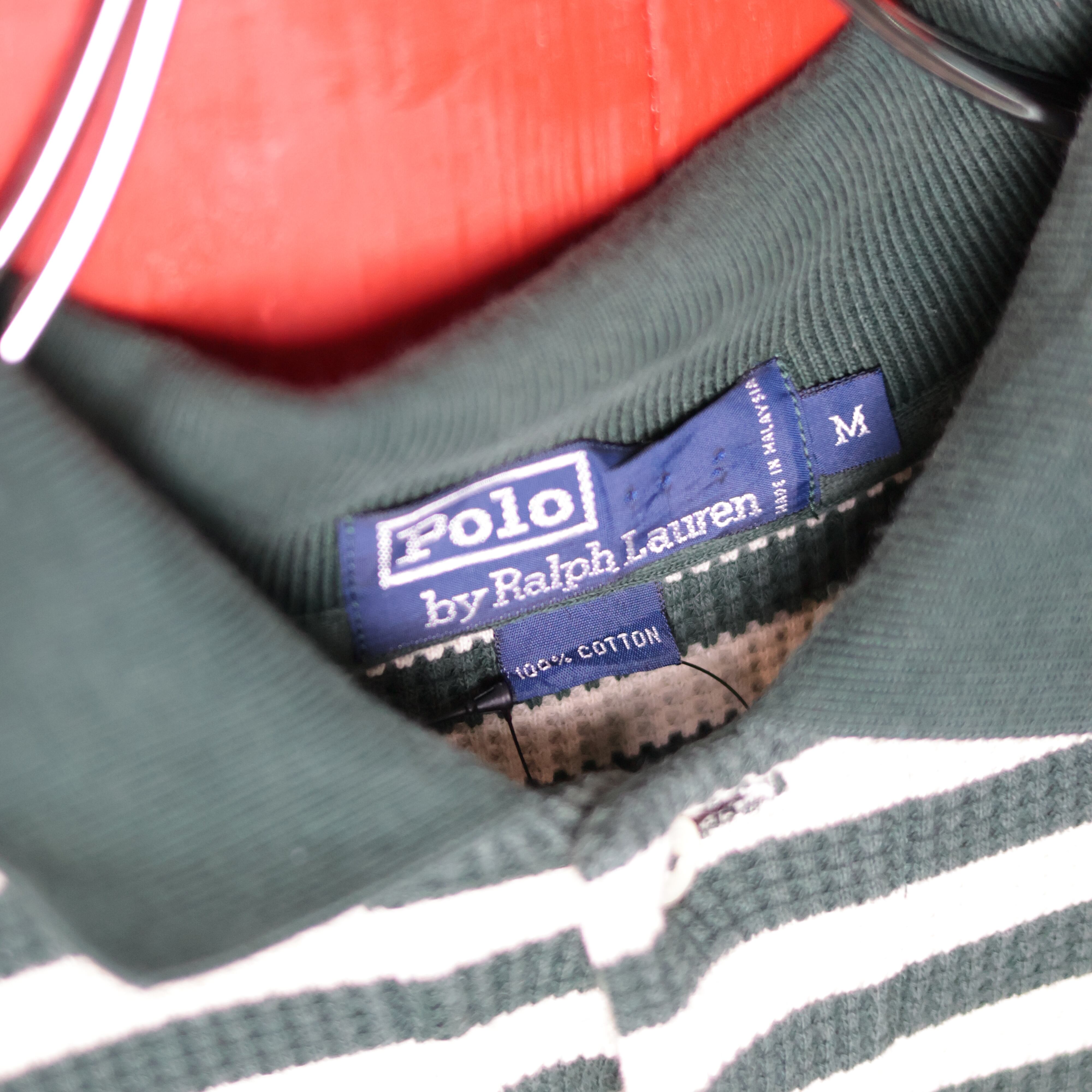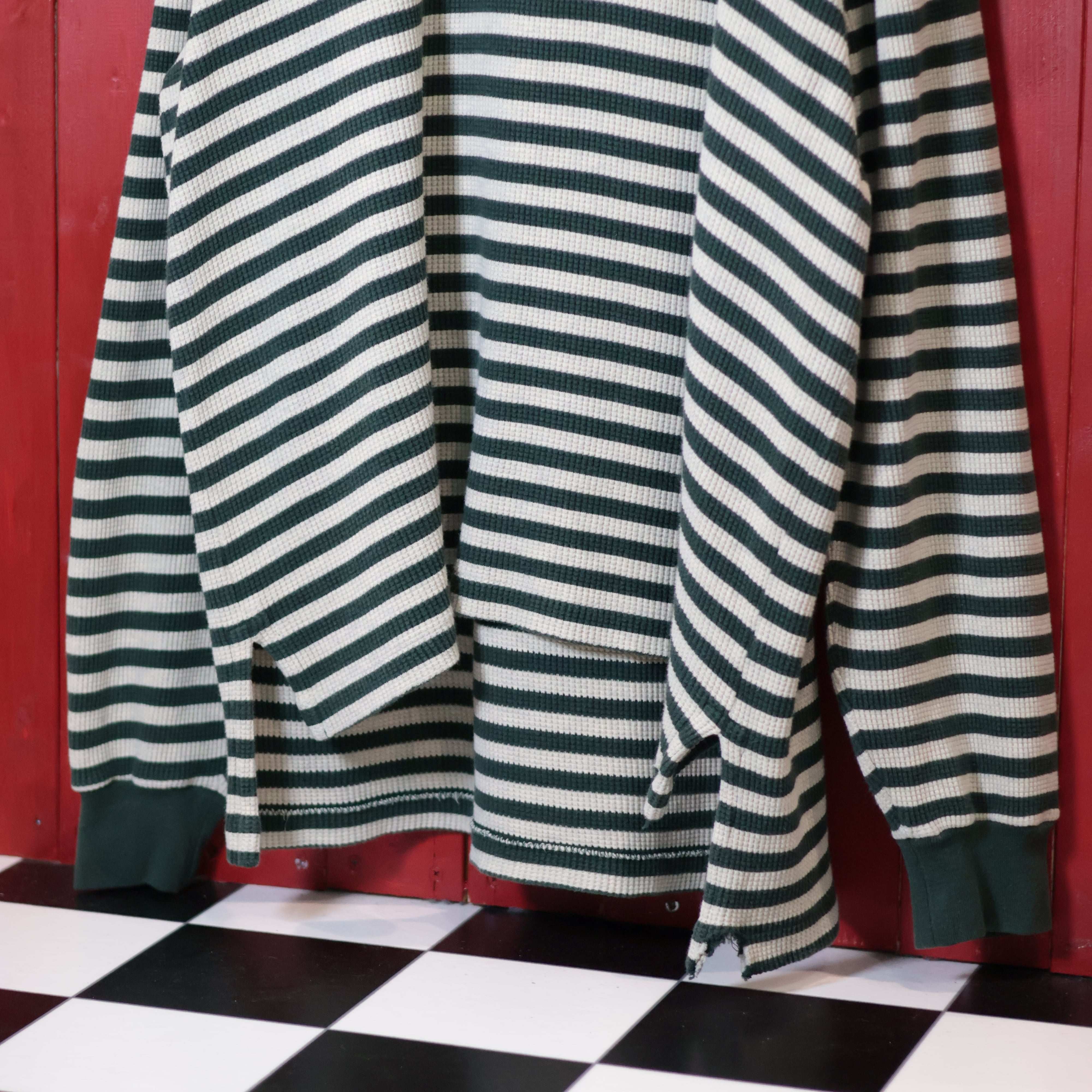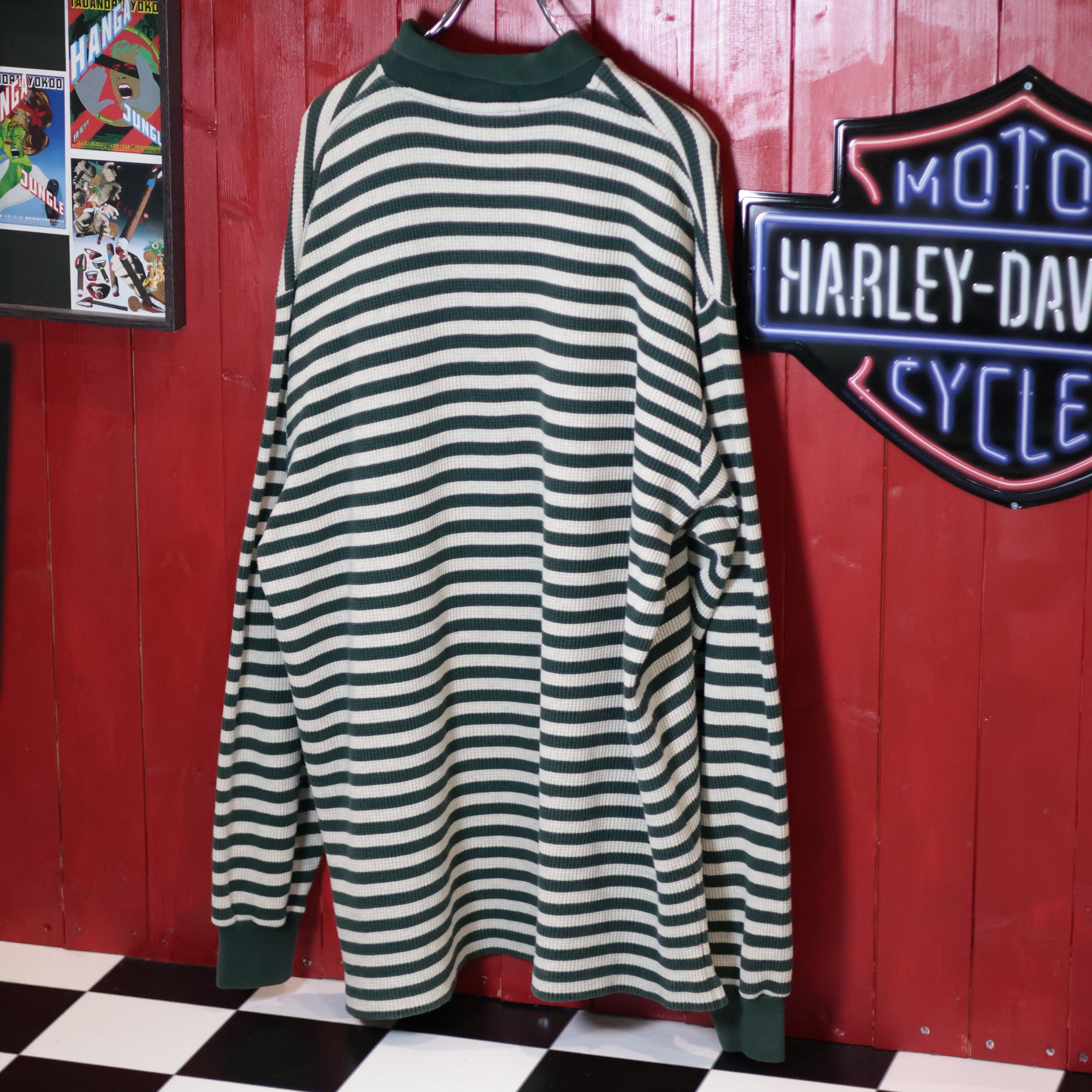 90s POLO RALPH LAUREN ワッフルボーダー 長袖ポロシャツ アイボリー×グリーン M