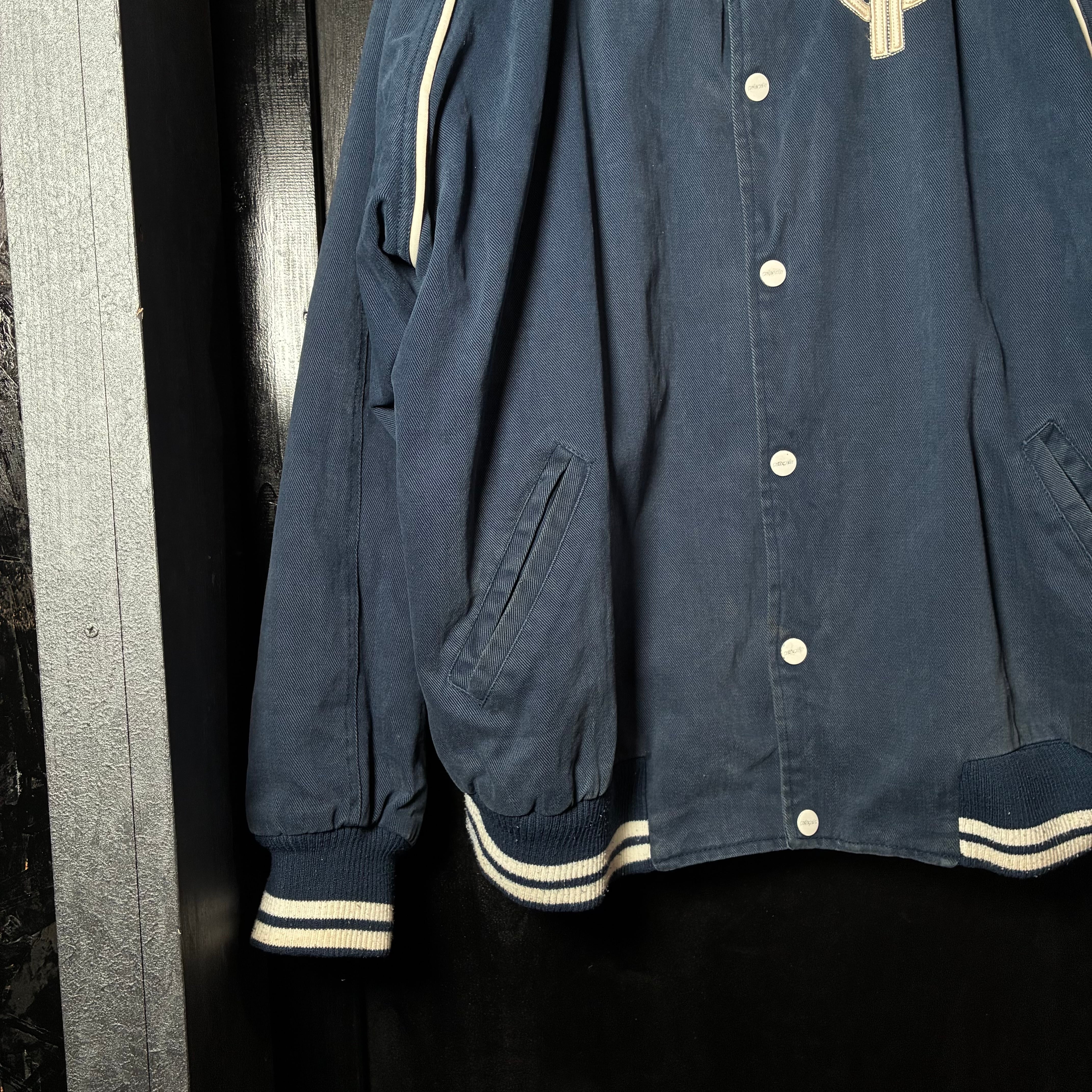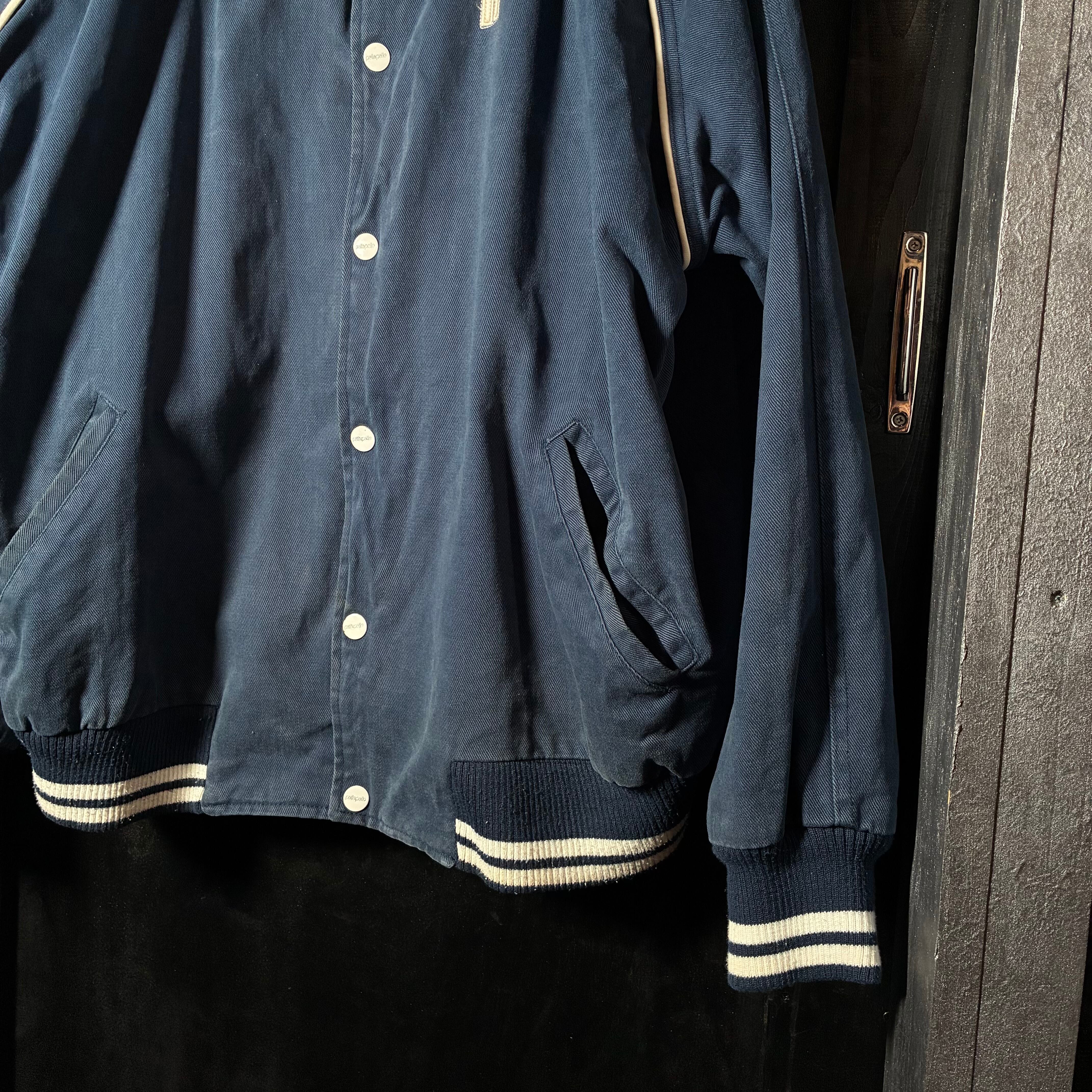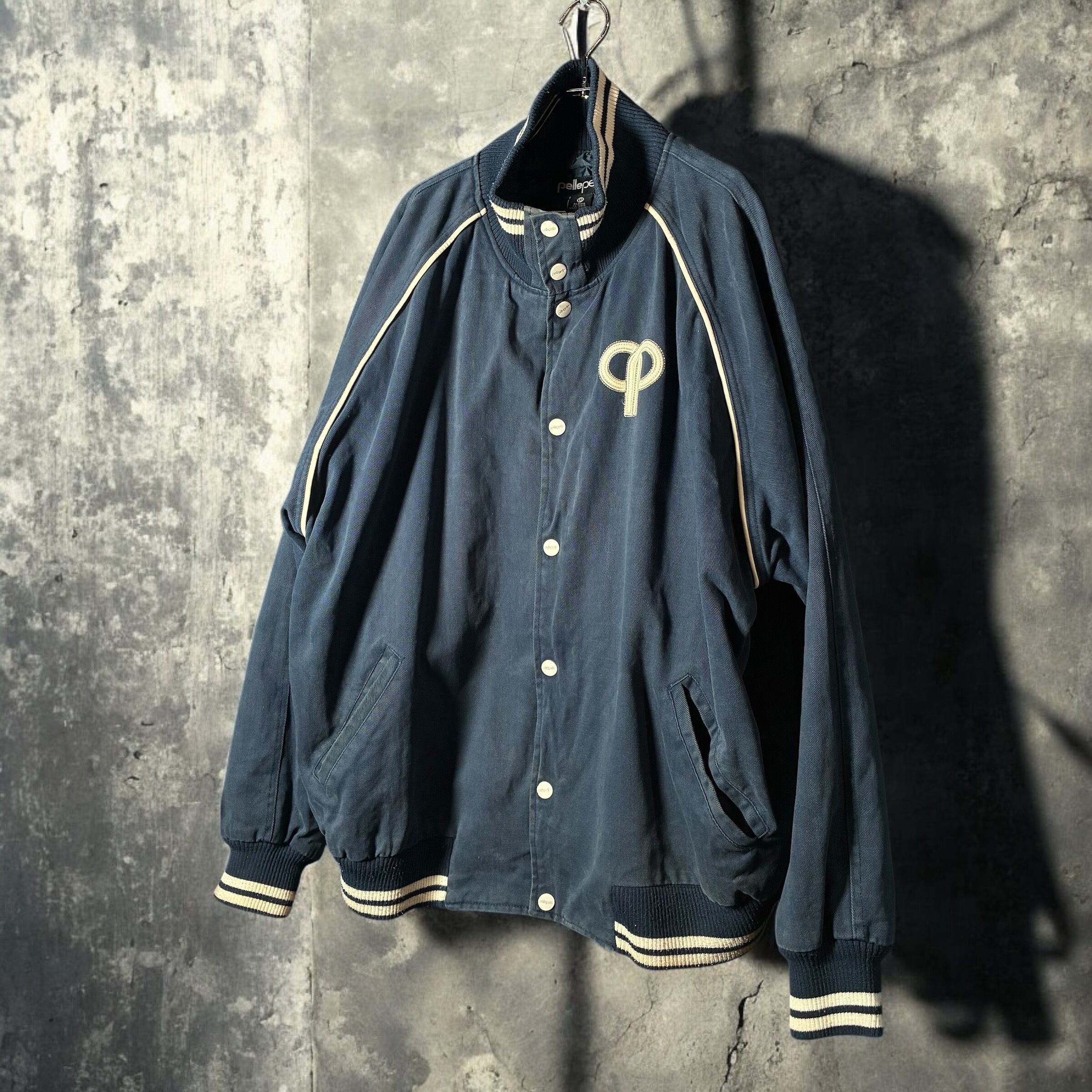 フロントの「P」ロゴワッペンと、配色ライン入りリブが映えるスタジャンライクな一着。