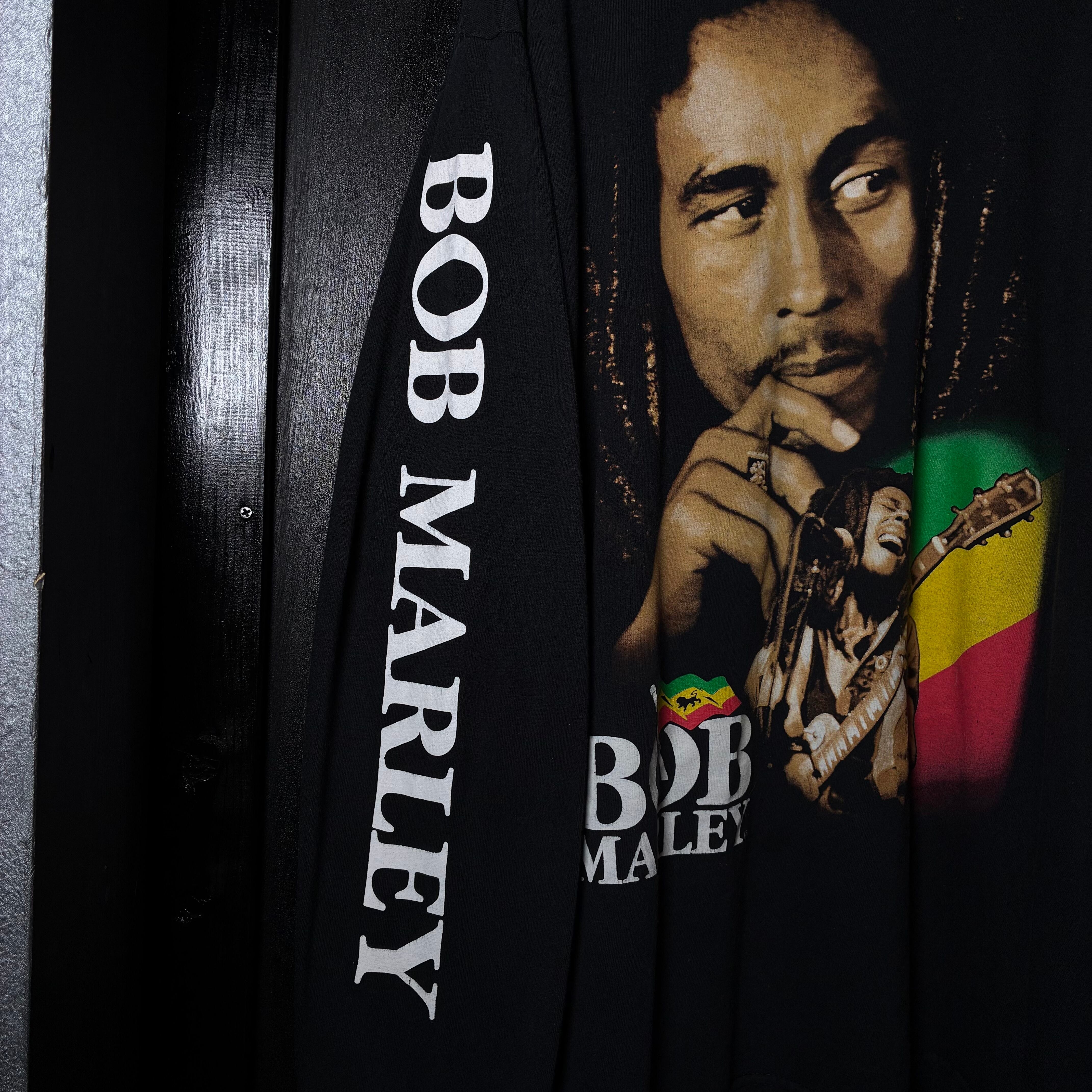フロントには象徴的なポートレートとラスタカラーのグラフィック、袖には縦に入った「BOB MARLEY」ロゴプリント。
