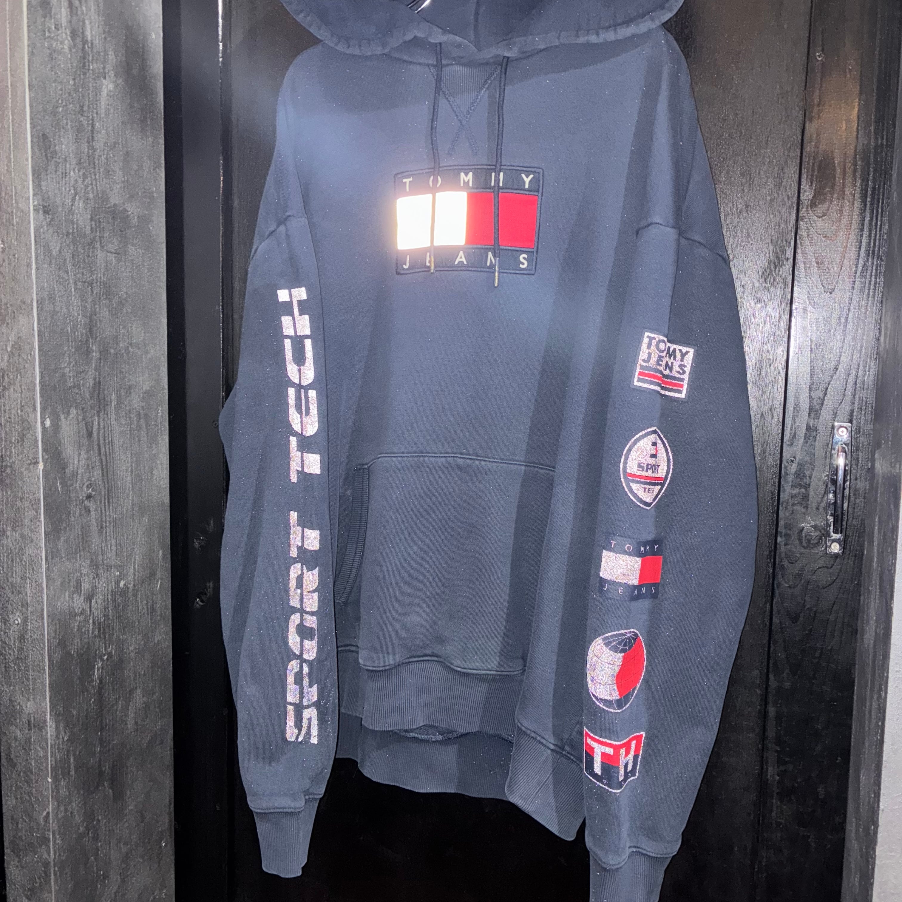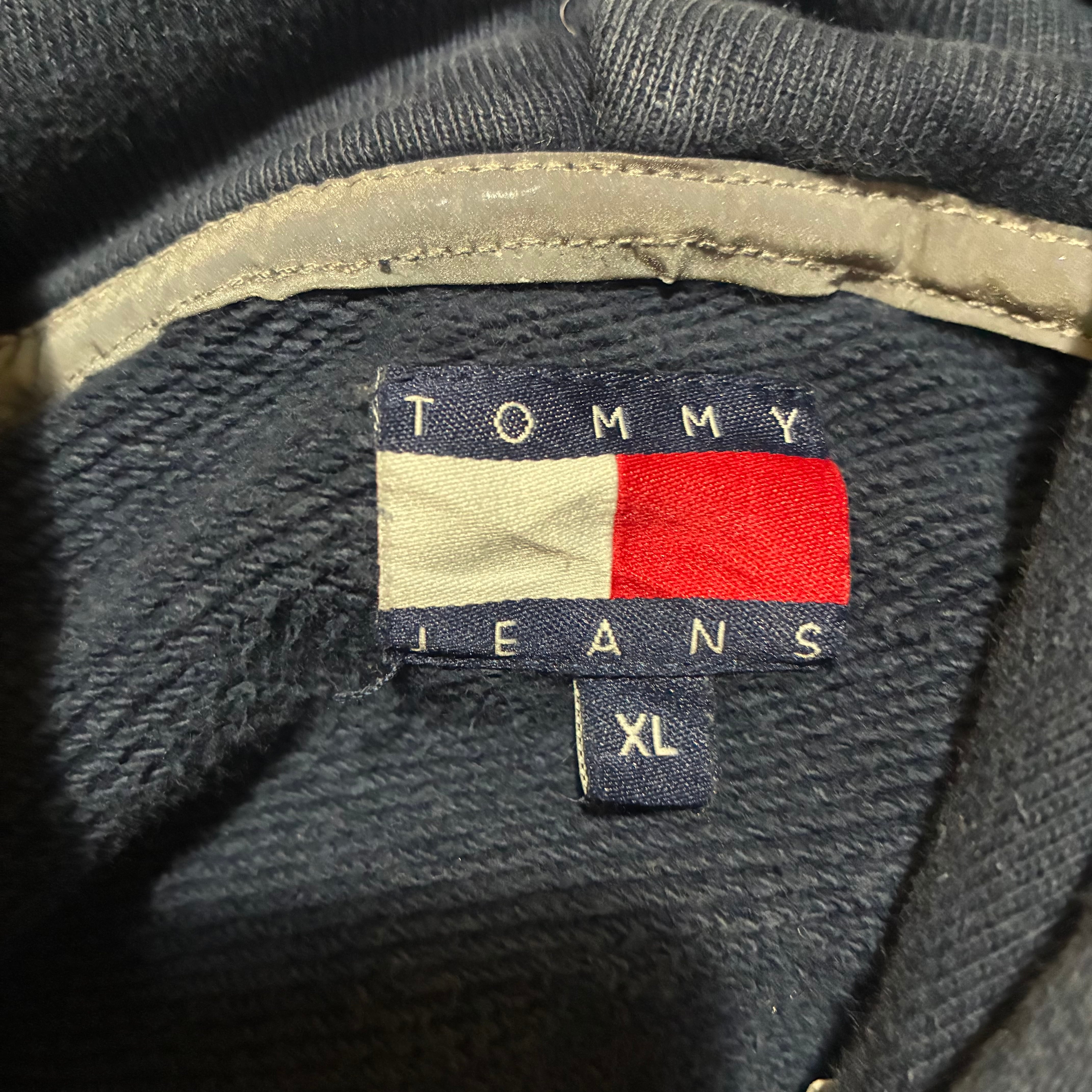 90s TOMMY JEANS プルオーバーパーカー リフレクター 袖プリント ネイビー XL トミー