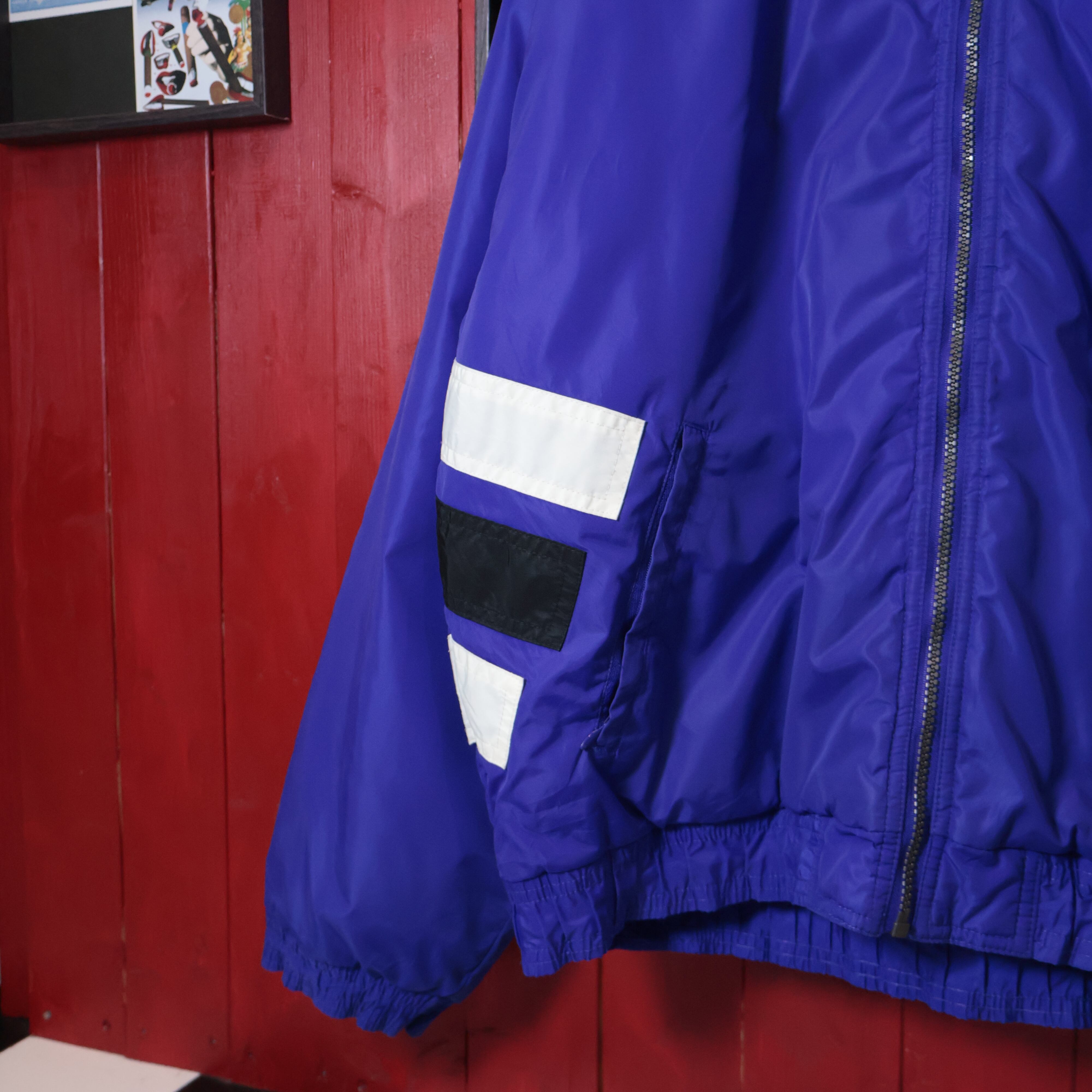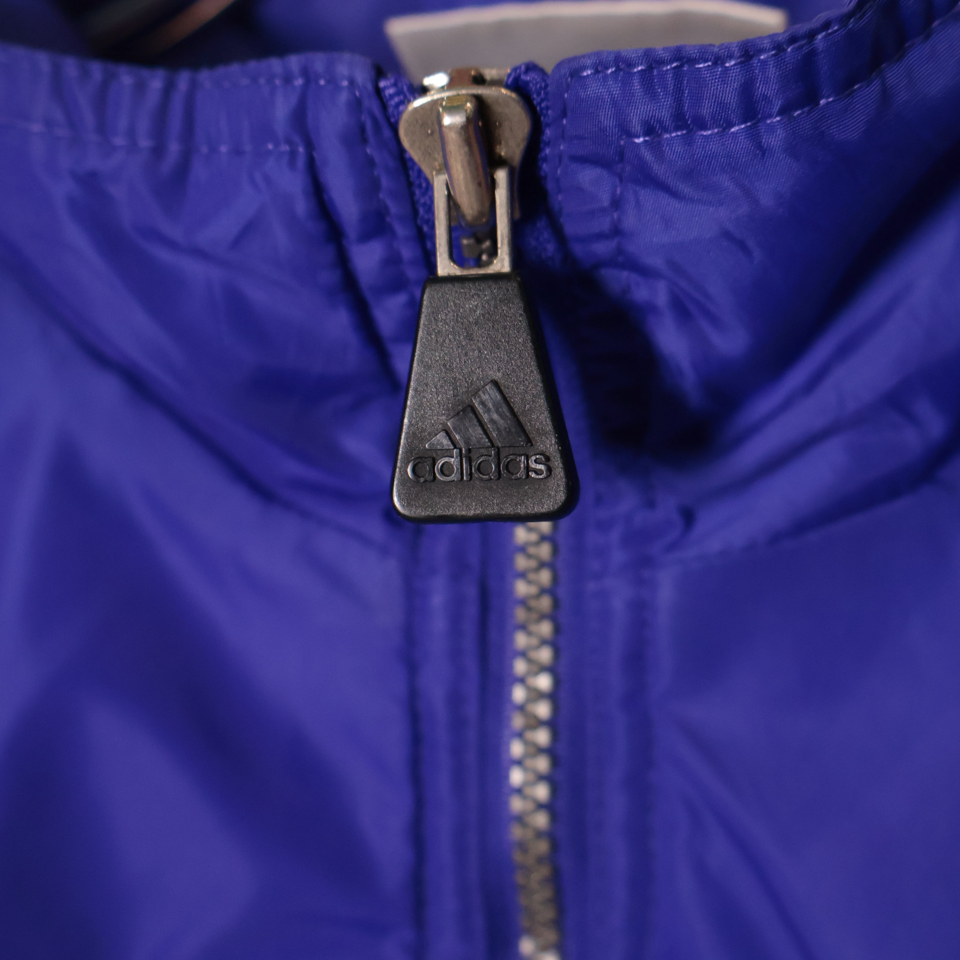 深みのあるパープル×ホワイト×ブラックのカラーリングが目を惹く、90年代アディダスの中綿ジャケット。