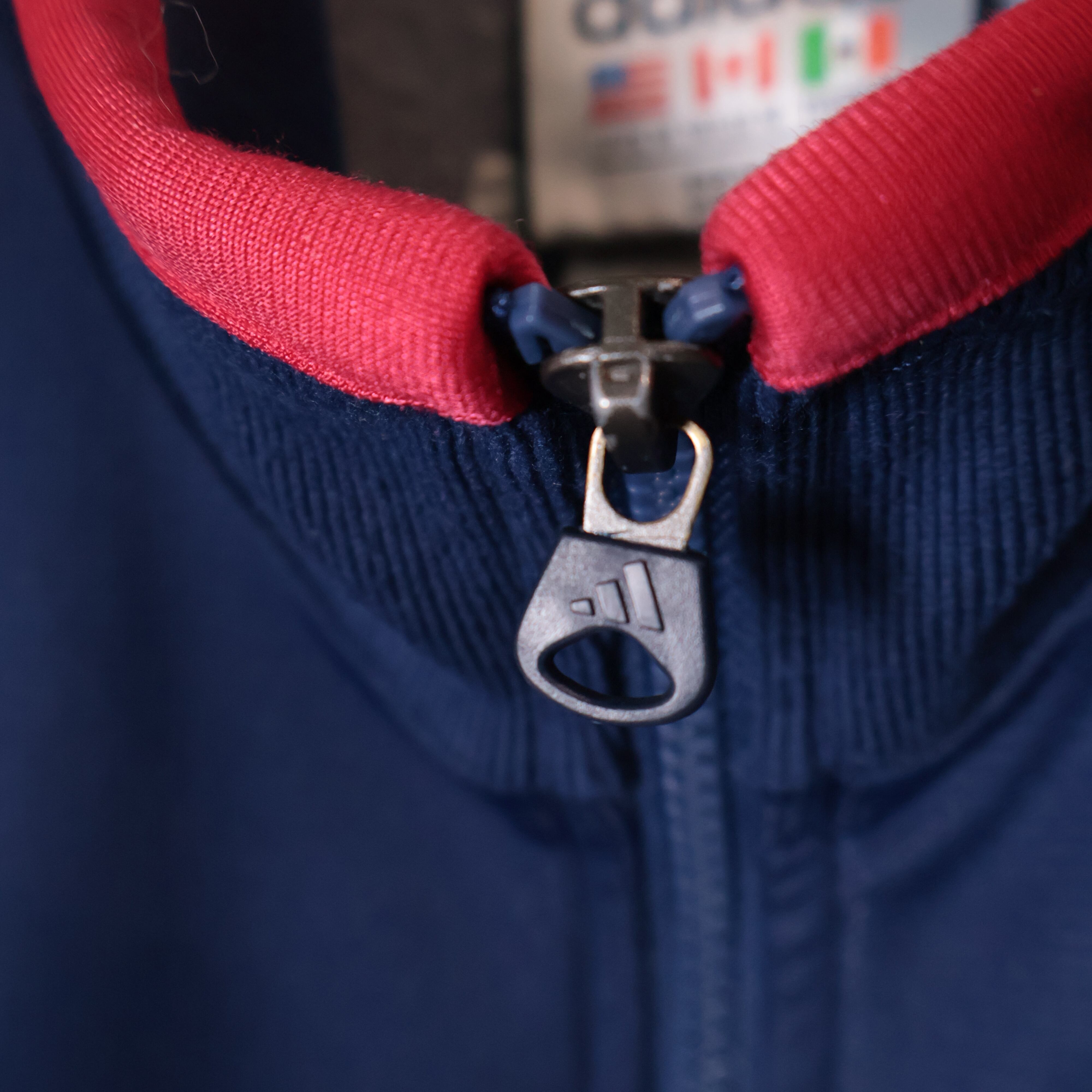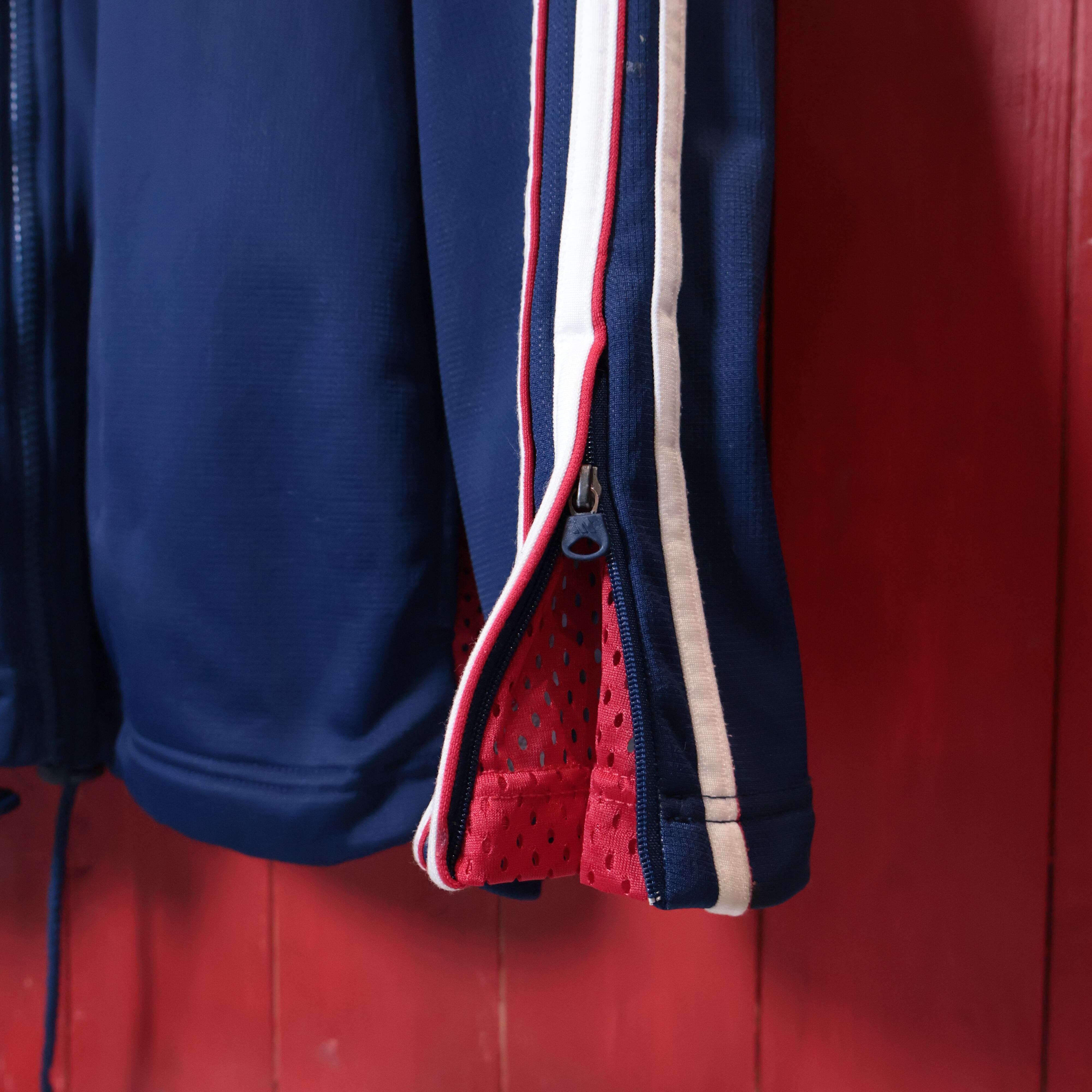 ネイビーベースにレッドの差し色、そして袖の3本ラインが映える一着。