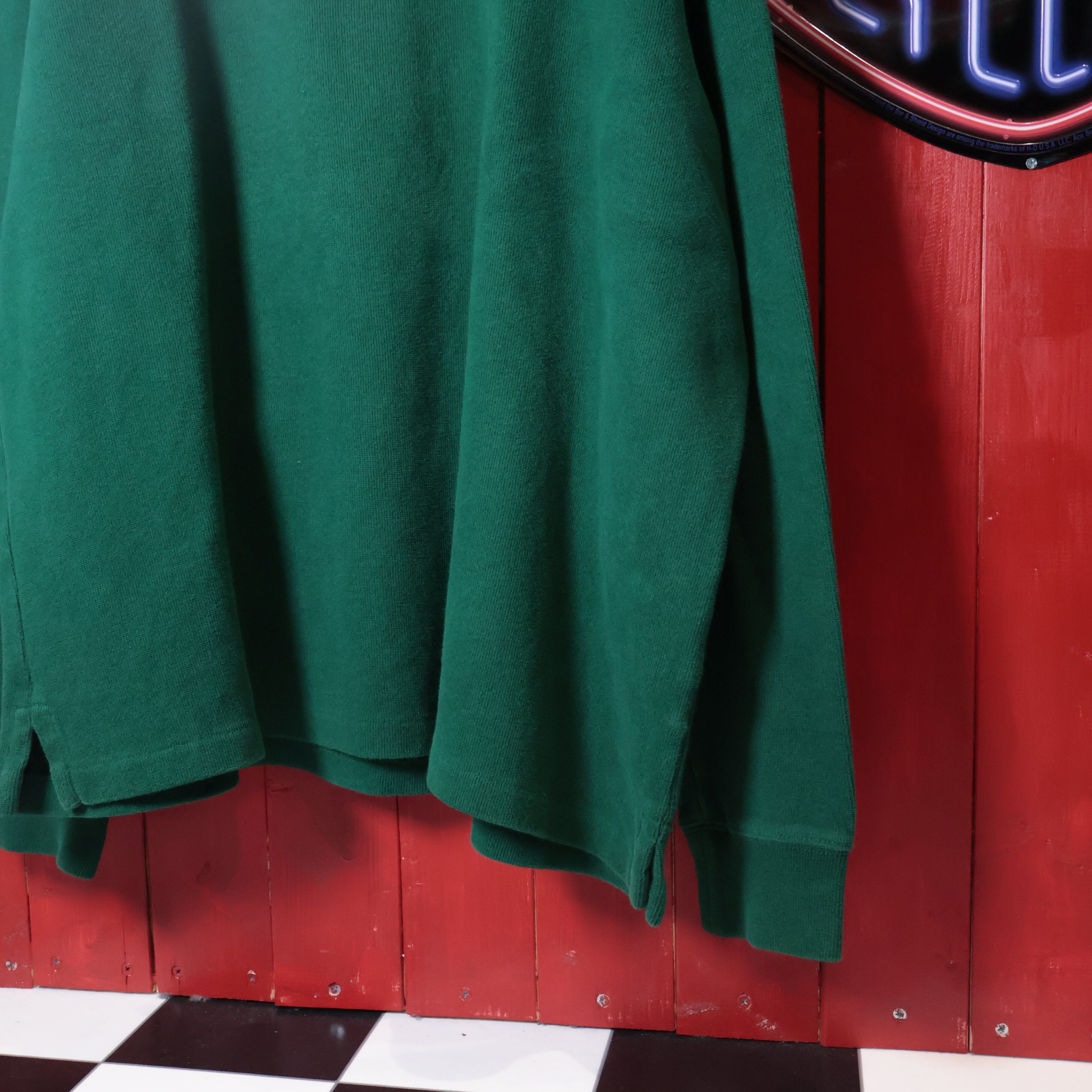 深みのあるグリーンボディにパープルのポニーロゴ刺繍が映える一着。