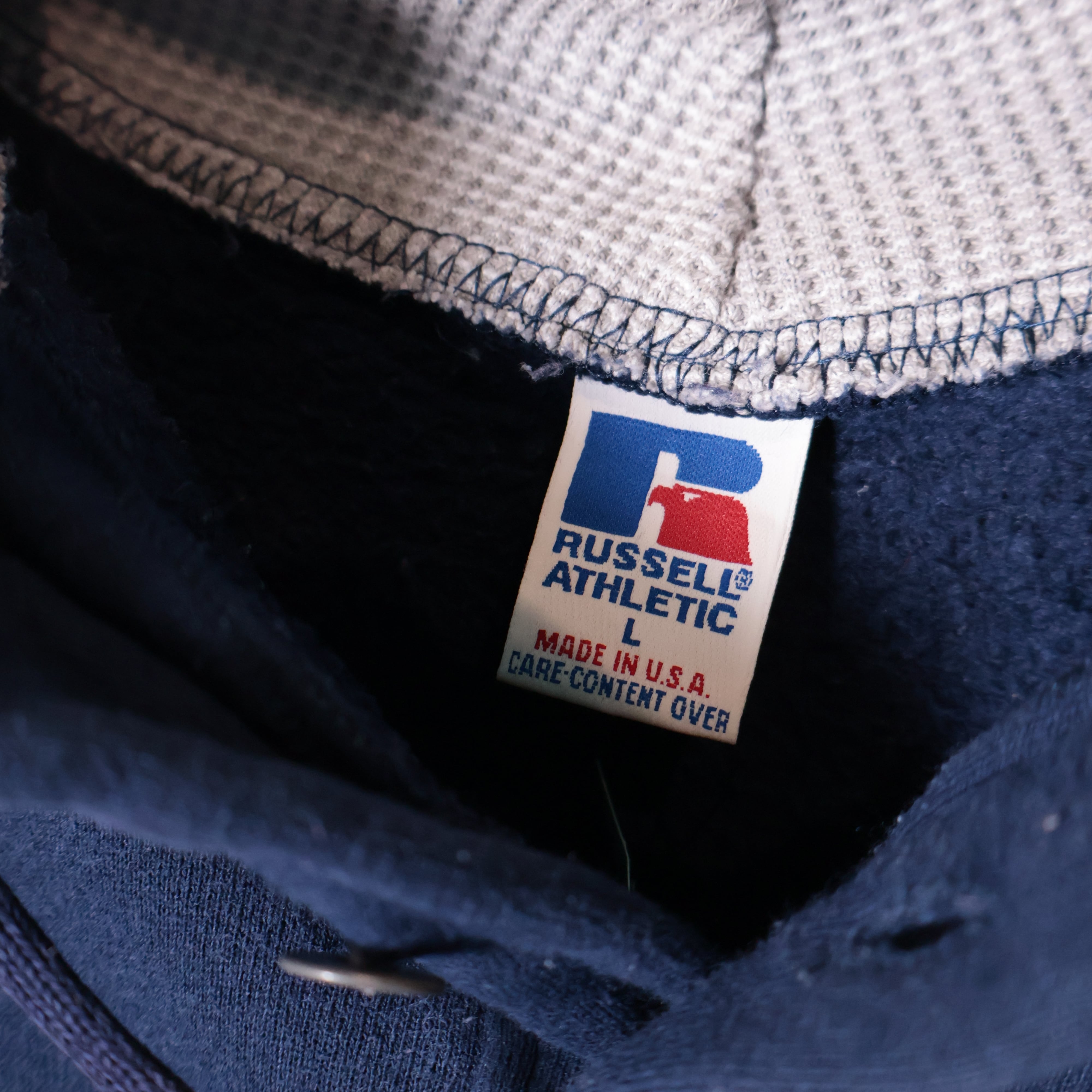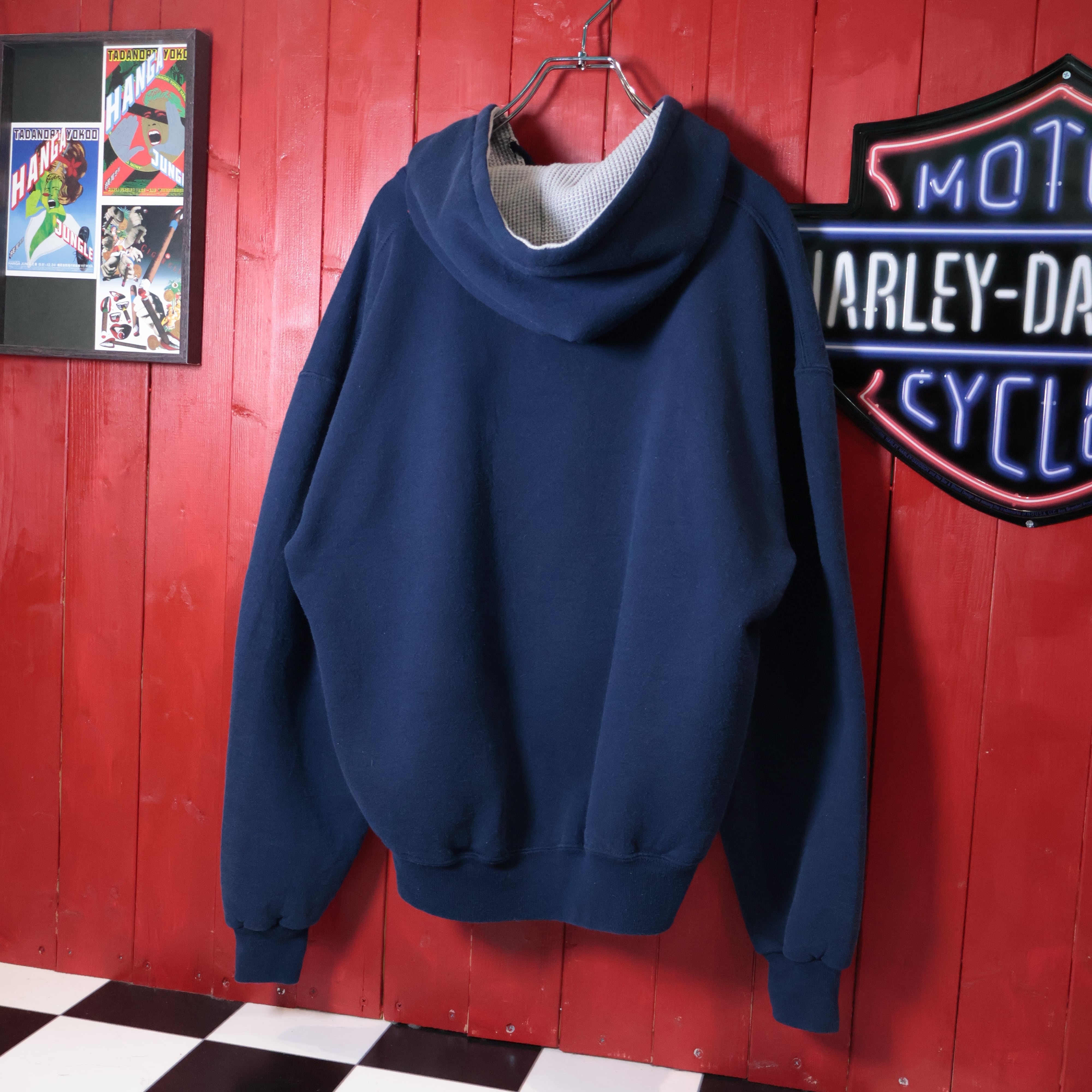 【90s USA製】RUSSELL ATHLETIC ハーフスナップフーディー ネイビー 刺繍 L ラッセル