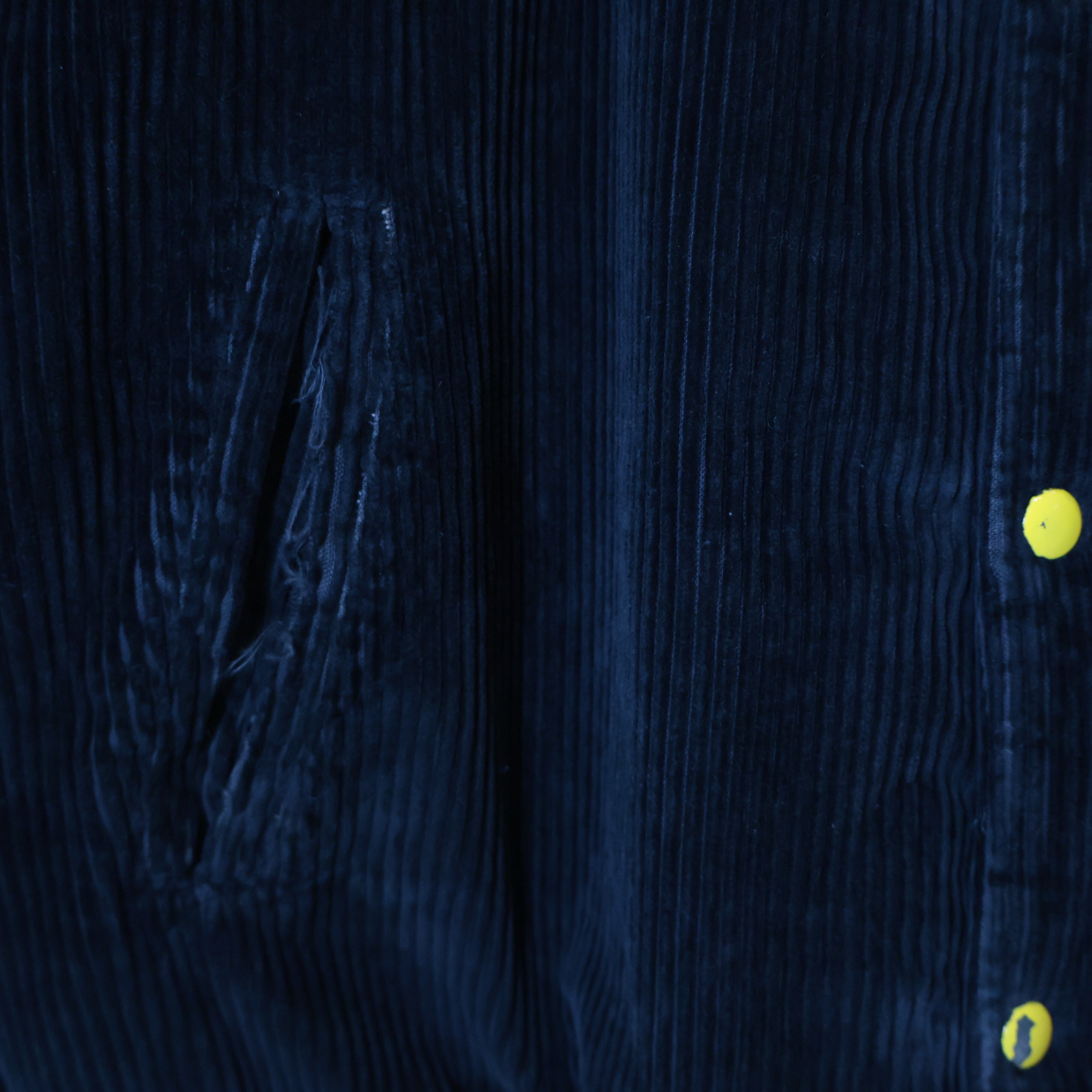 深いブラックのコーデュロイに、イエローの刺繍とスナップボタンが映える一着。胸・袖バックの刺繍が本気でカッコいい 。