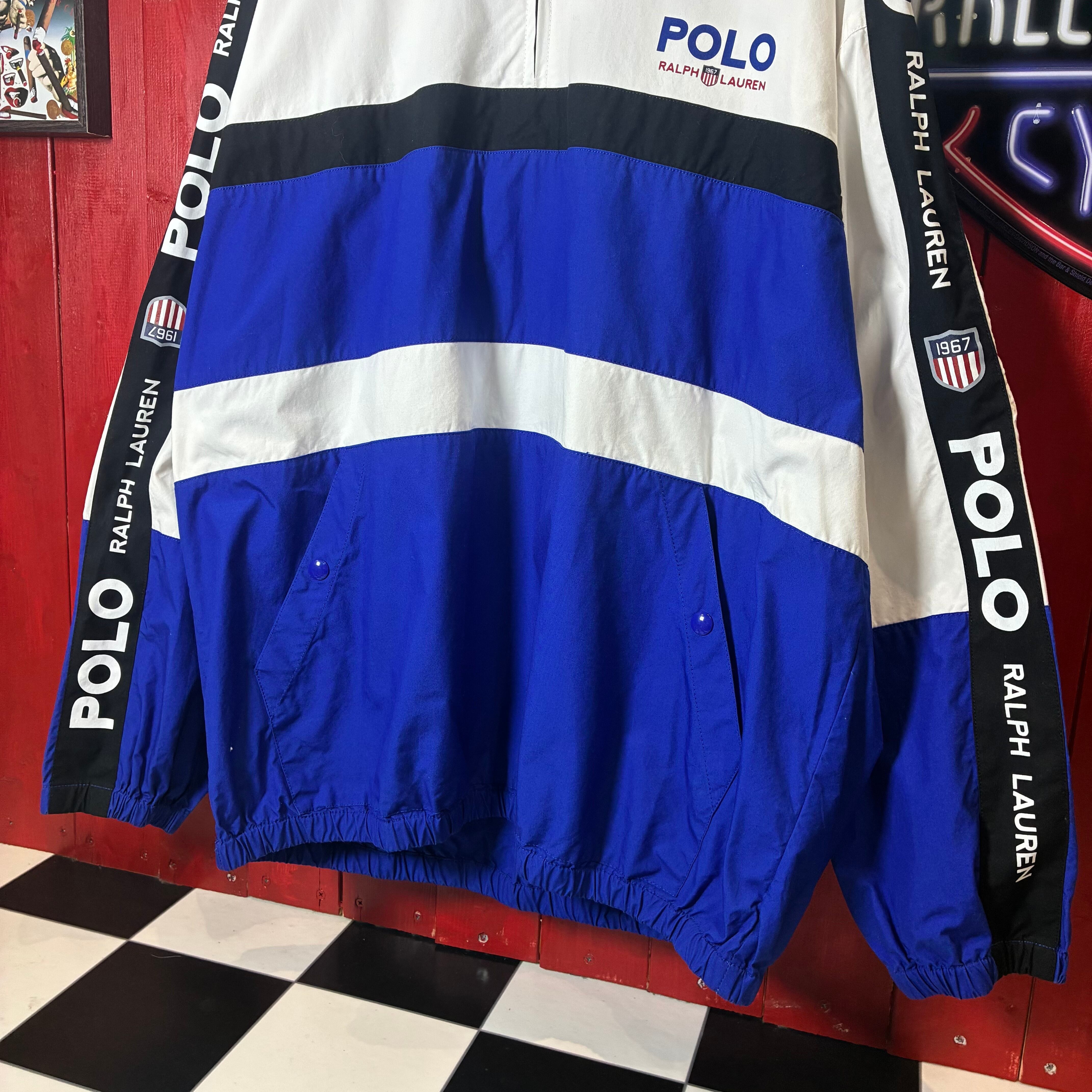 ホワイト×ブルー×ブラックのスポーツ配色に、袖の“POLO RALPH LAUREN”テープロゴが走る一着で、90sポロスポーツのムードをしっかり感じるデザイン。