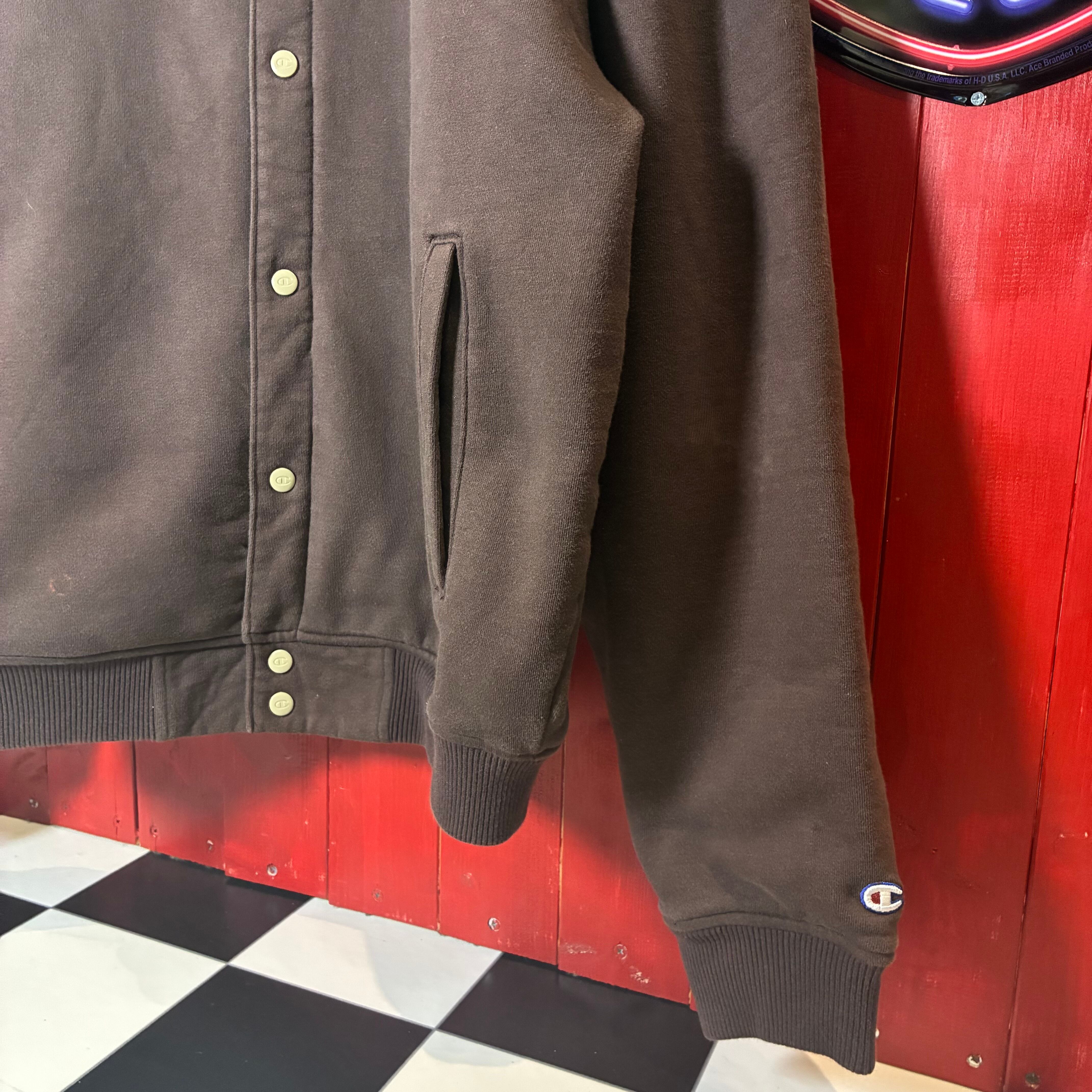 落ち着きのあるブラウンカラーに、フロントのビッグCロゴ、バックのアーチCHAMPIONロゴがしっかり主張。スウェット特有の柔らかい着心地で、“スタジャンのシルエット × スウェットのラフさ”が絶妙にハマったデザインです。
