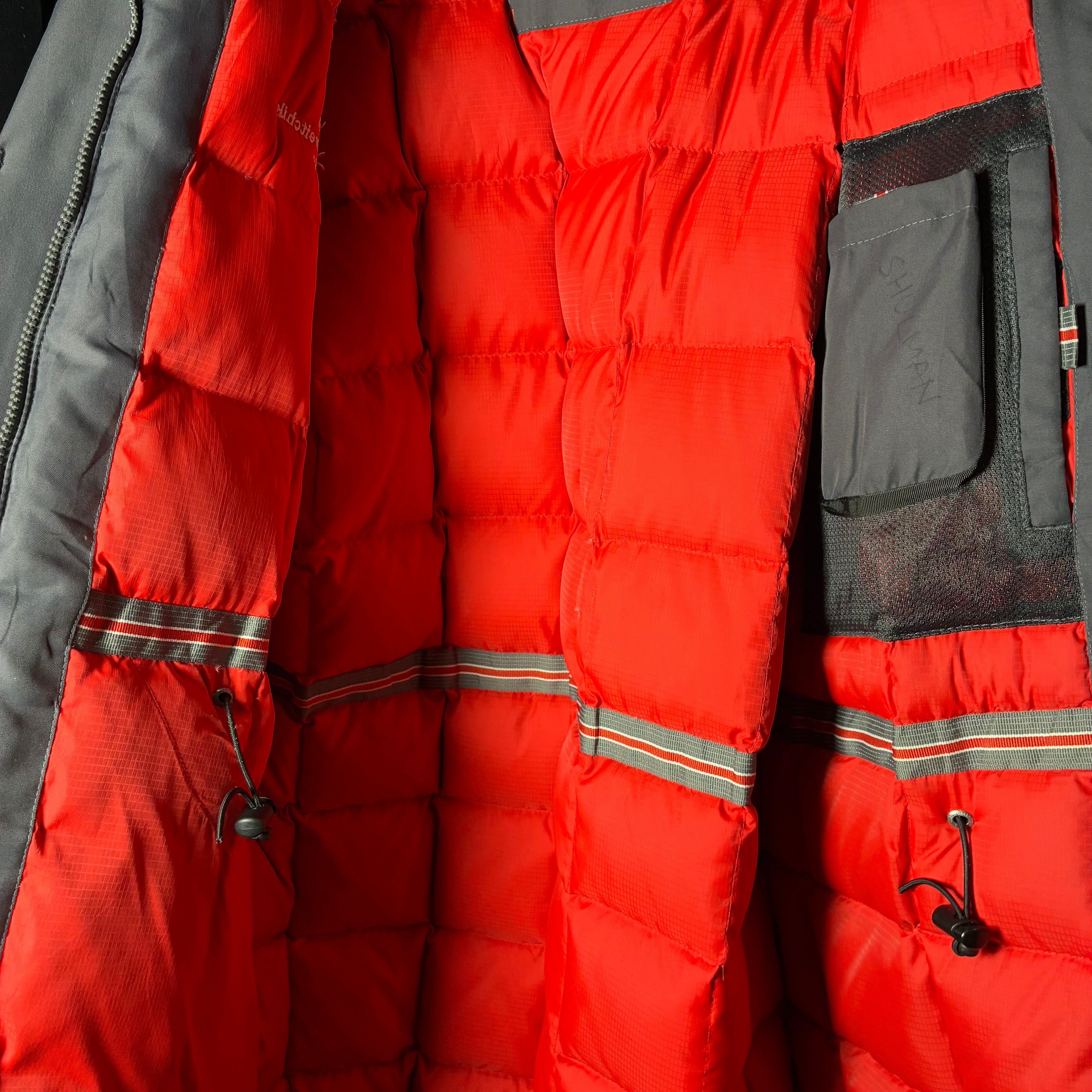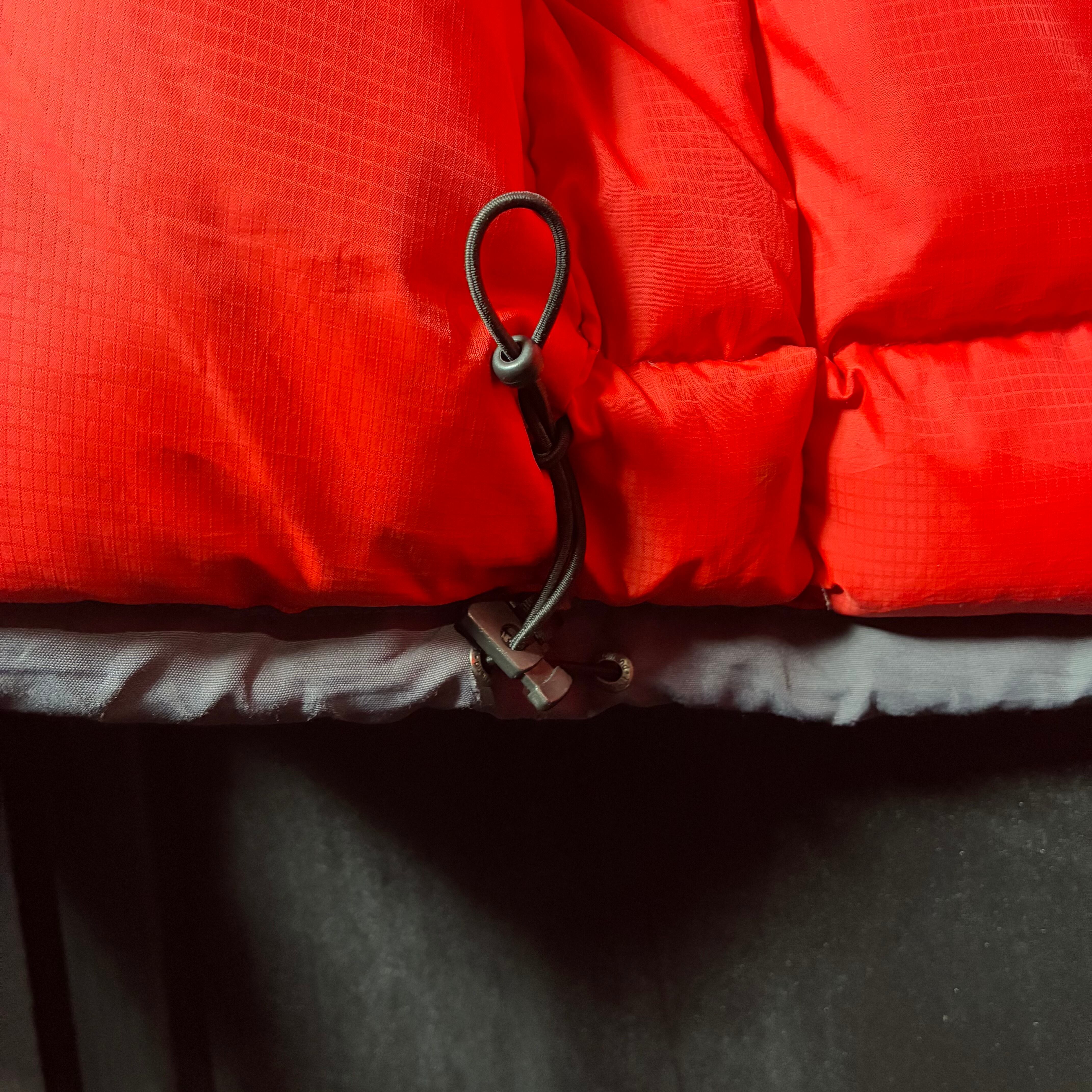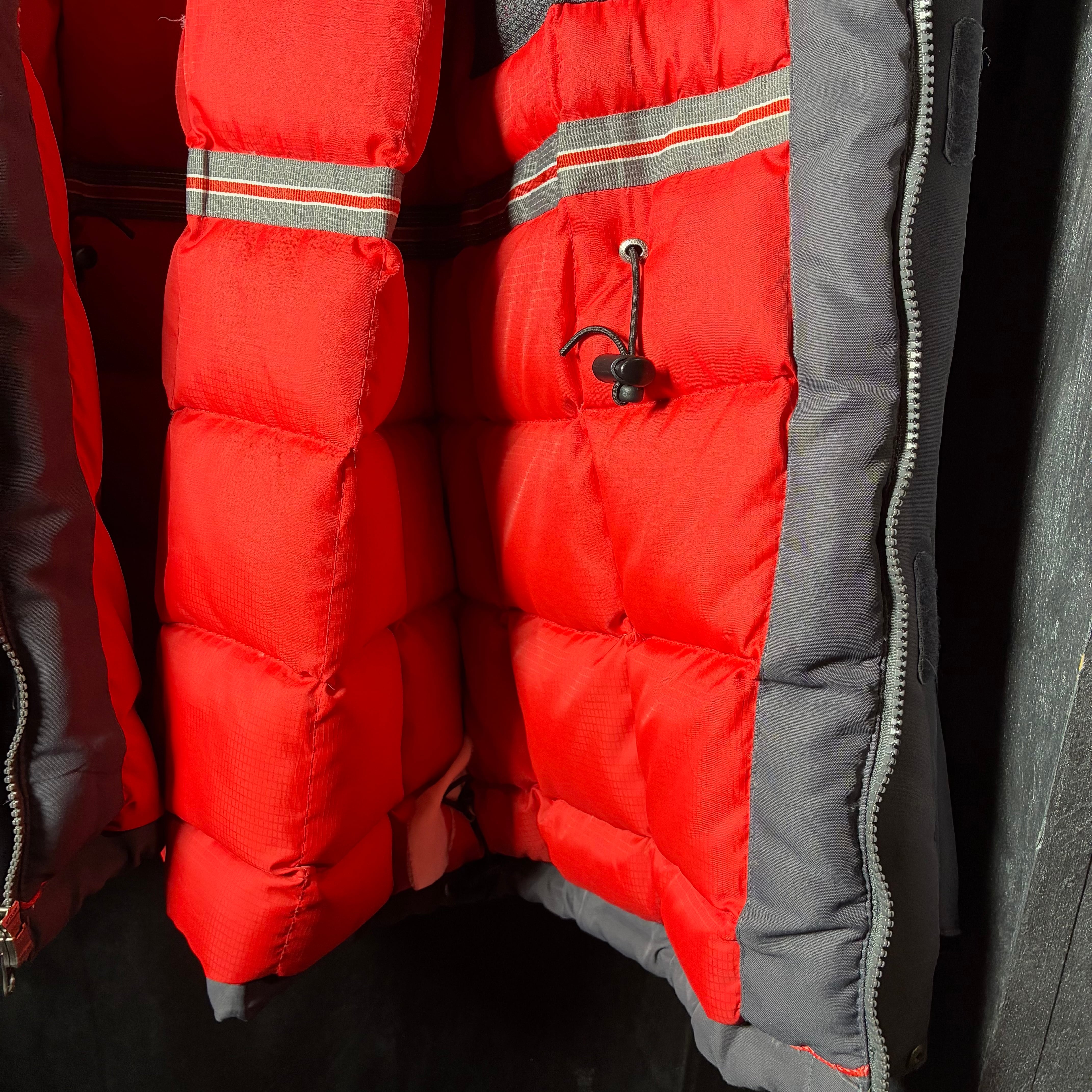 当時のアウトドア最前線らしいタフなナイロンシェルに、**ダックダウン80%+フェザー20%**の本格仕様で、保温性は申し分なし。