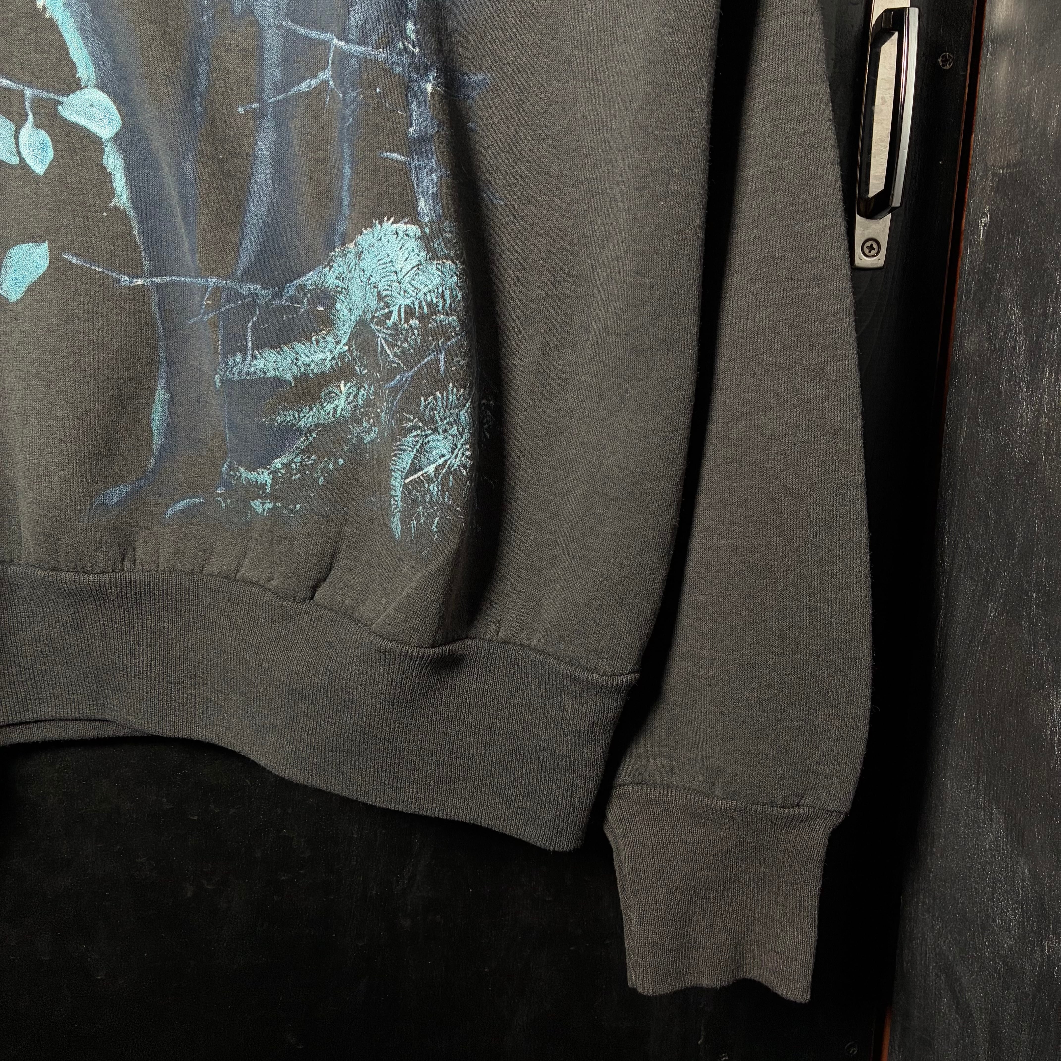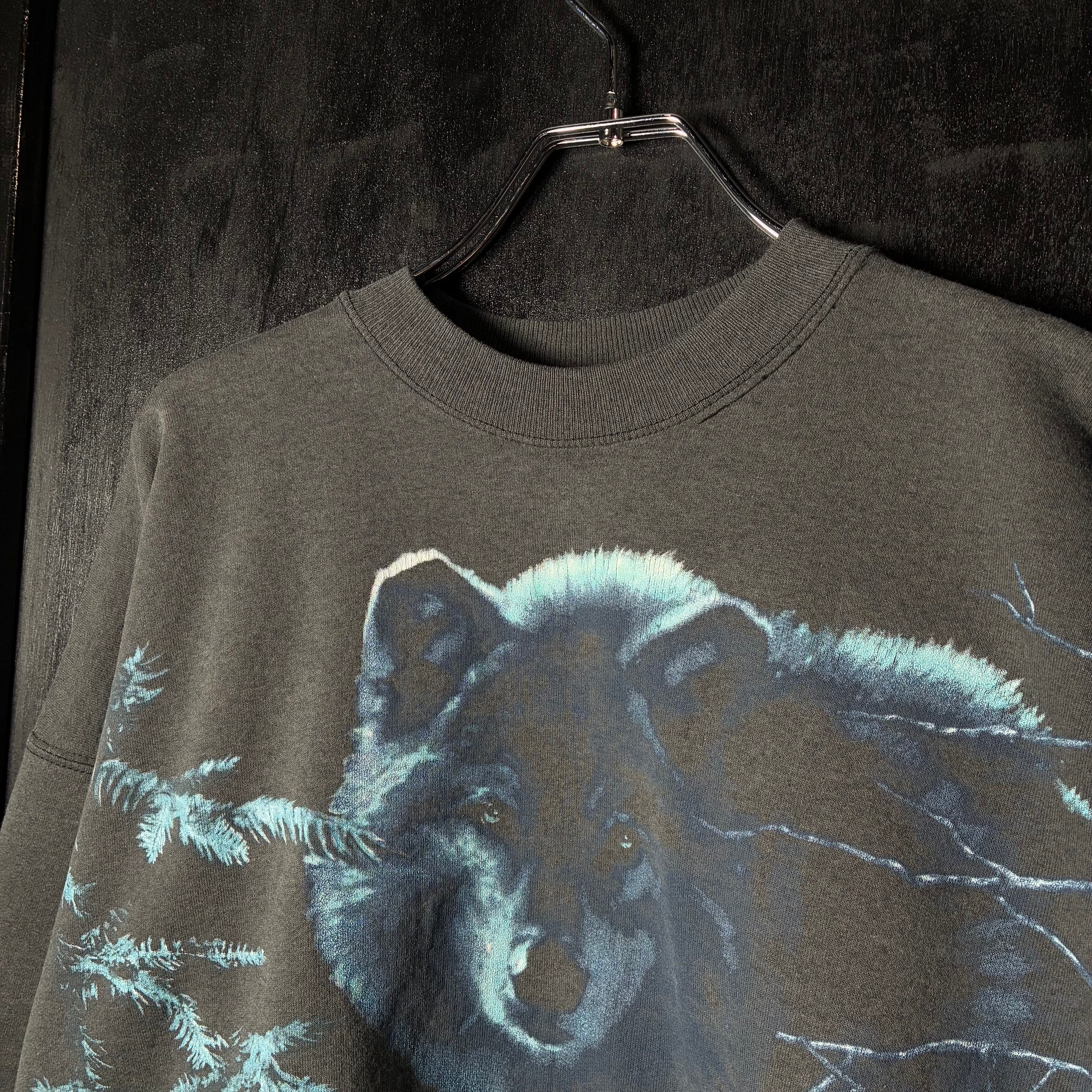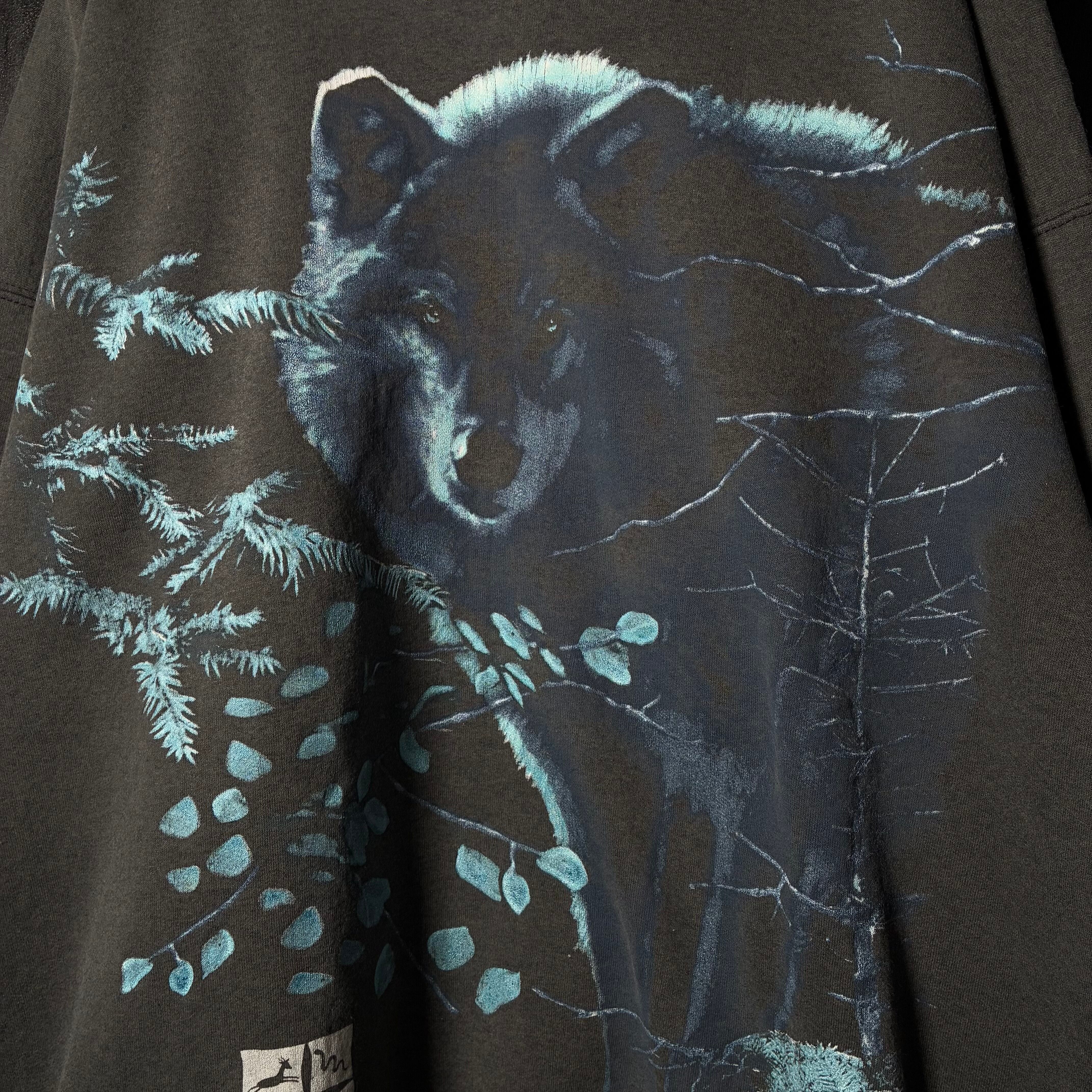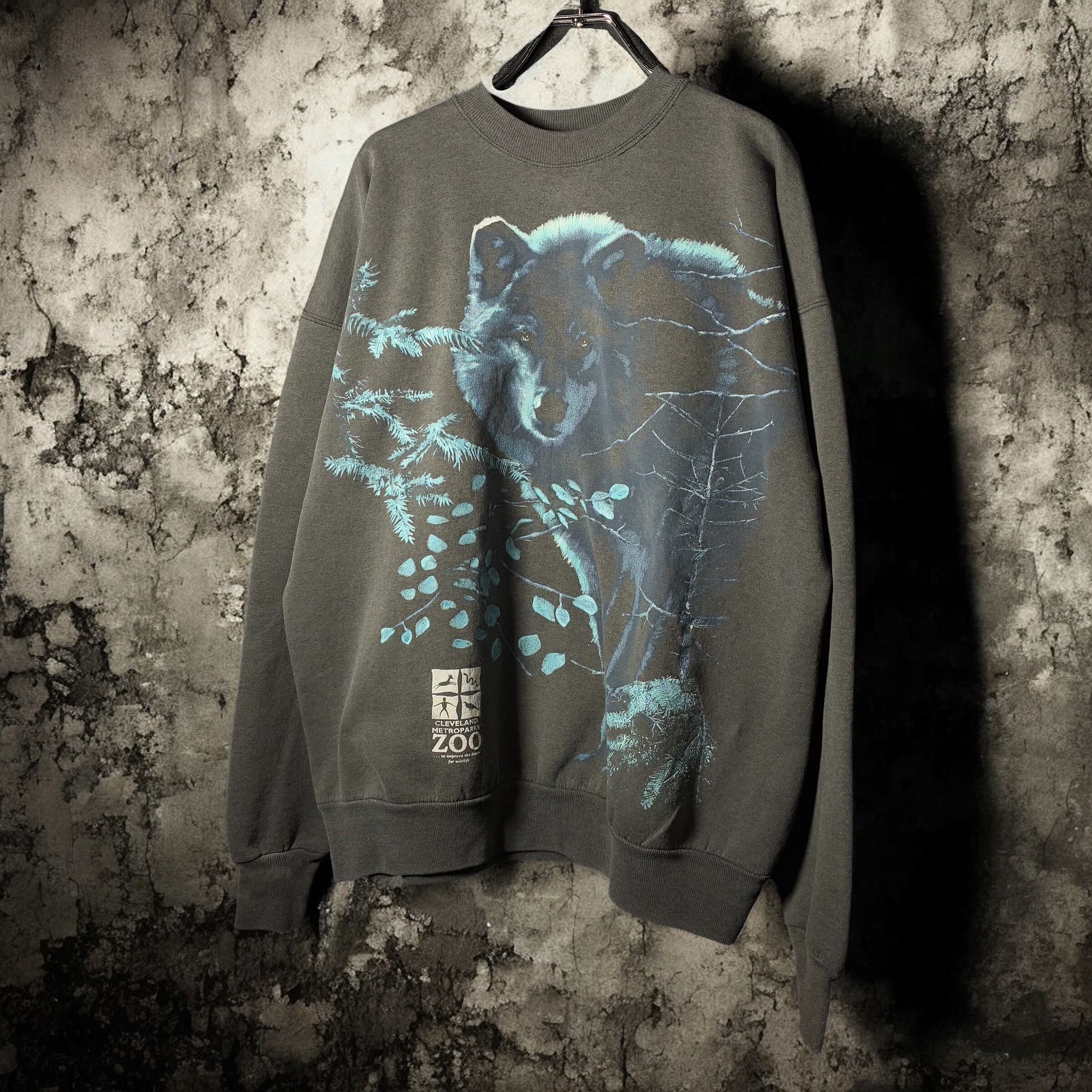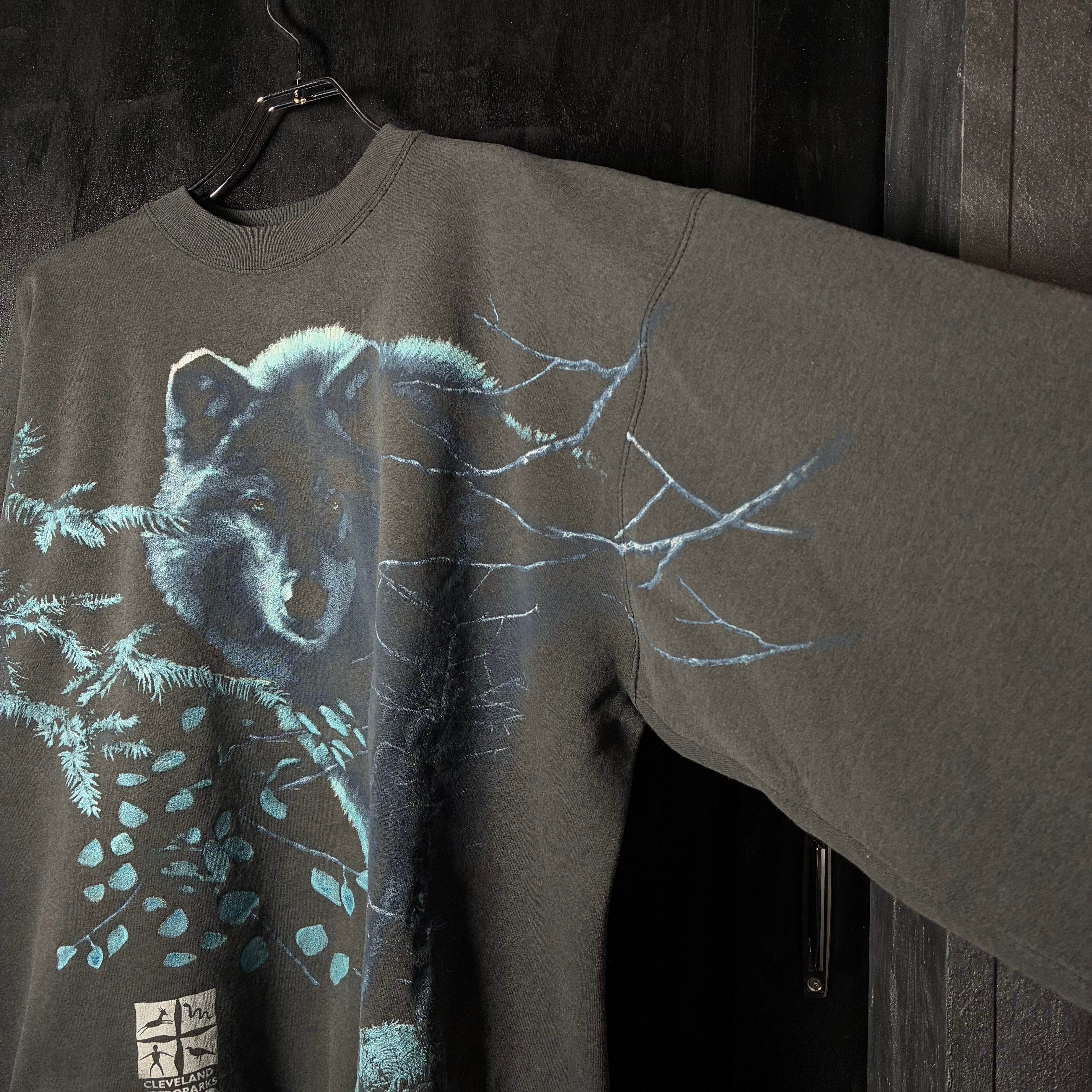 90s USA製 Hanes スウェット Cleveland Metroparks Zoo 動物園 ウルフ 狼 アニマルプリント ブラックフェード ビンテージ