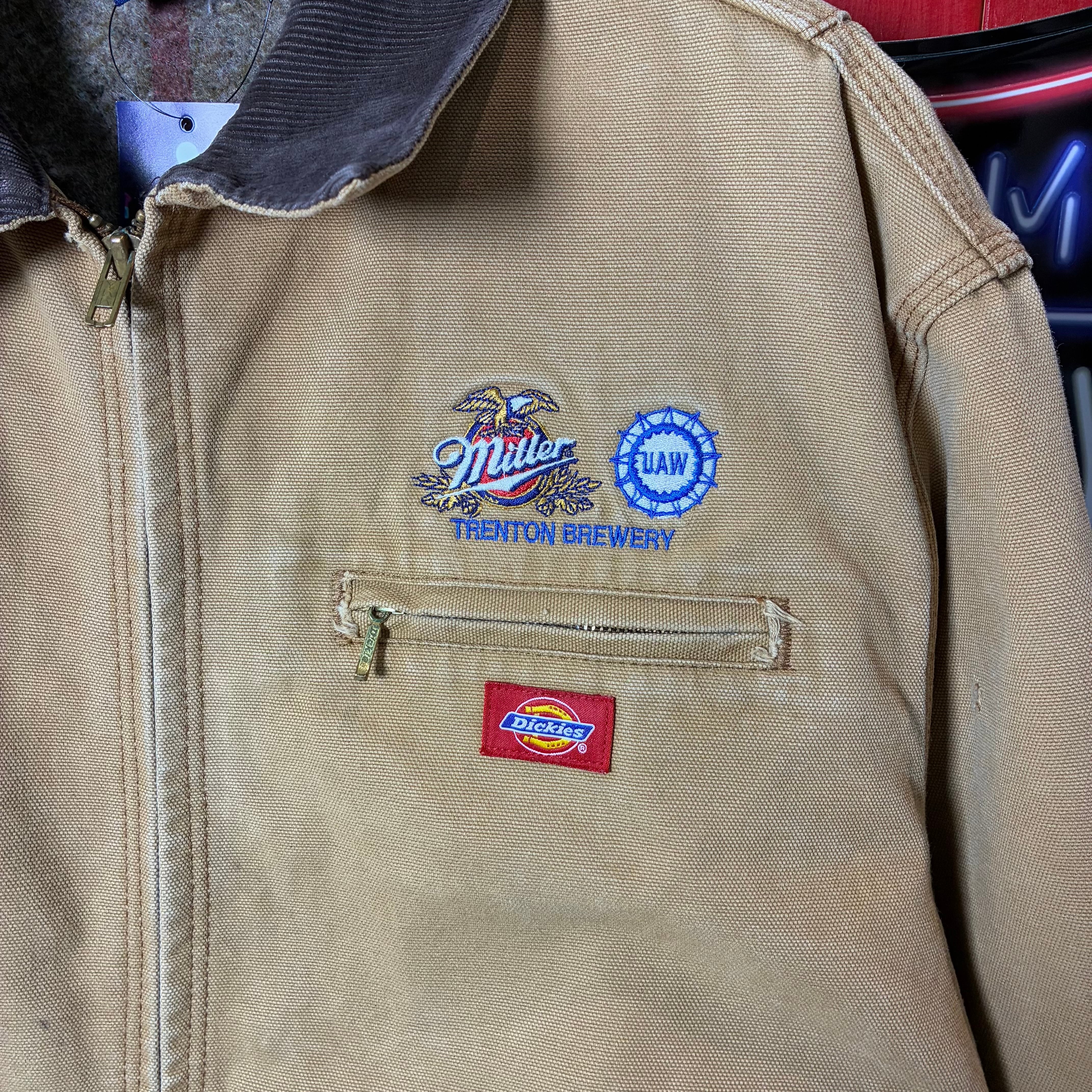 武骨なダック地ボディに、Miller Beer / Trenton Brewery と UAW の刺繍が入る、完全に“企業モノ×ワーク”な一着。