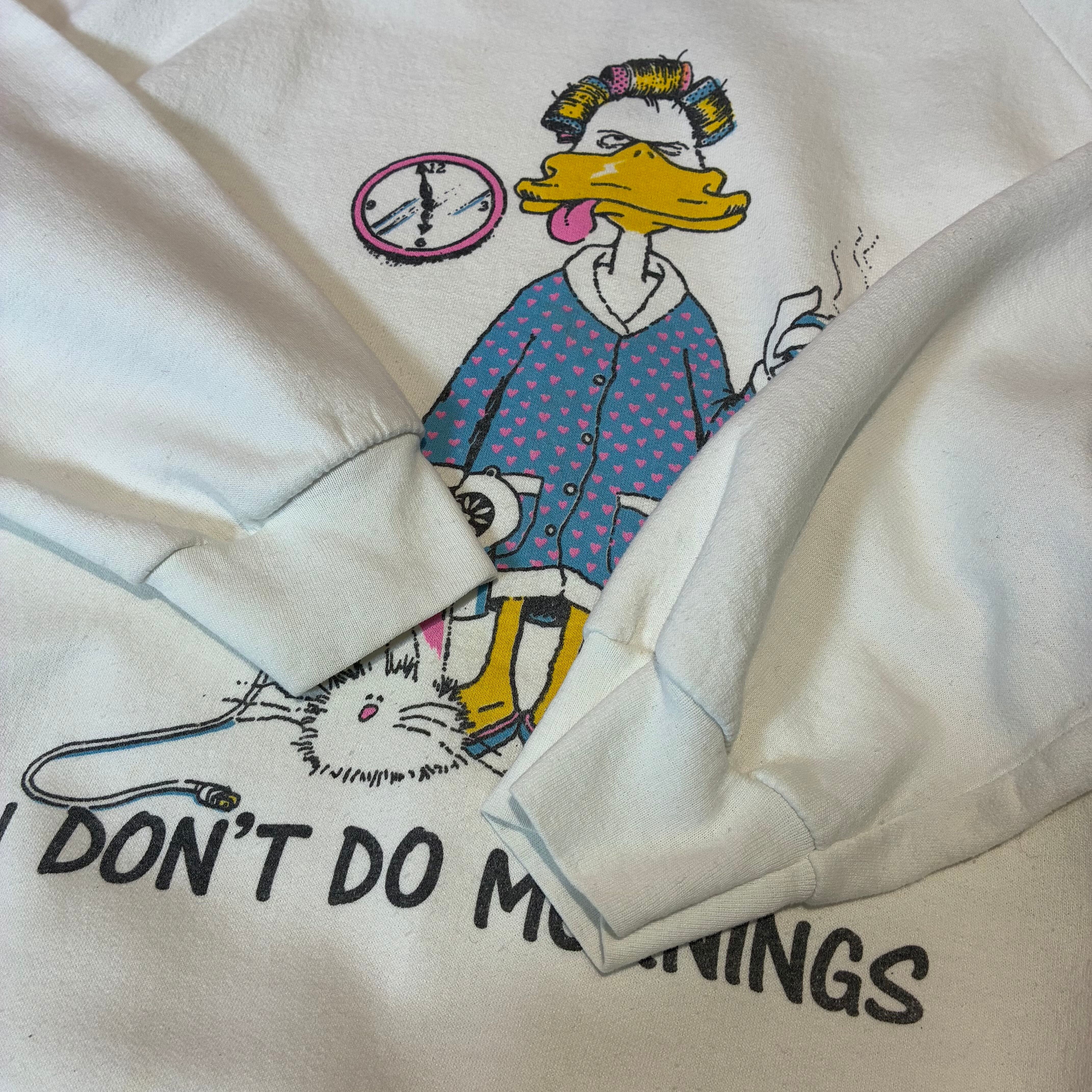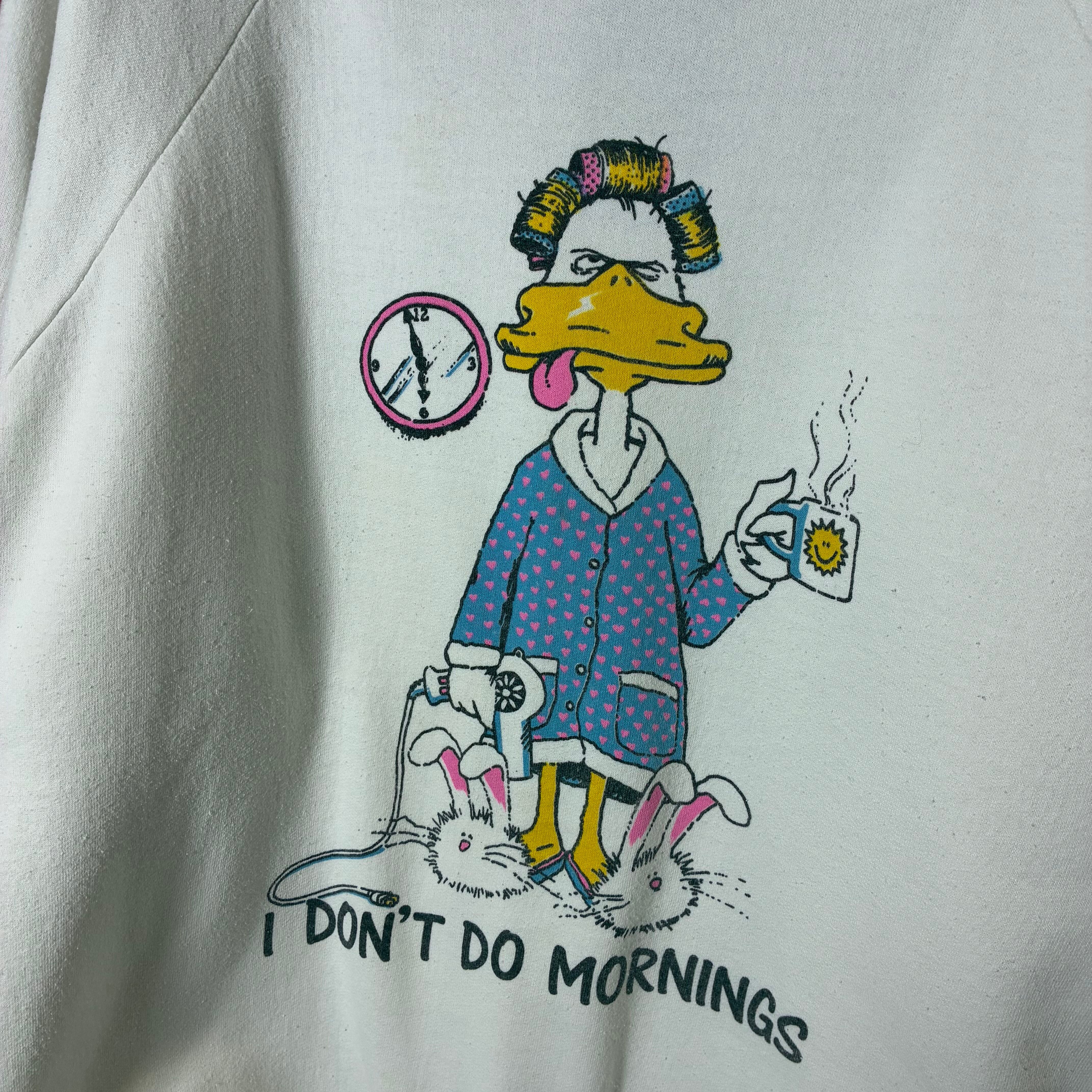 「I DON’T DO MORNINGS(朝は無理。)」というメッセージに、寝起き感全開のアヒルのキャラクターが描かれた、アメリカらしいユーモアたっぷりの一枚。