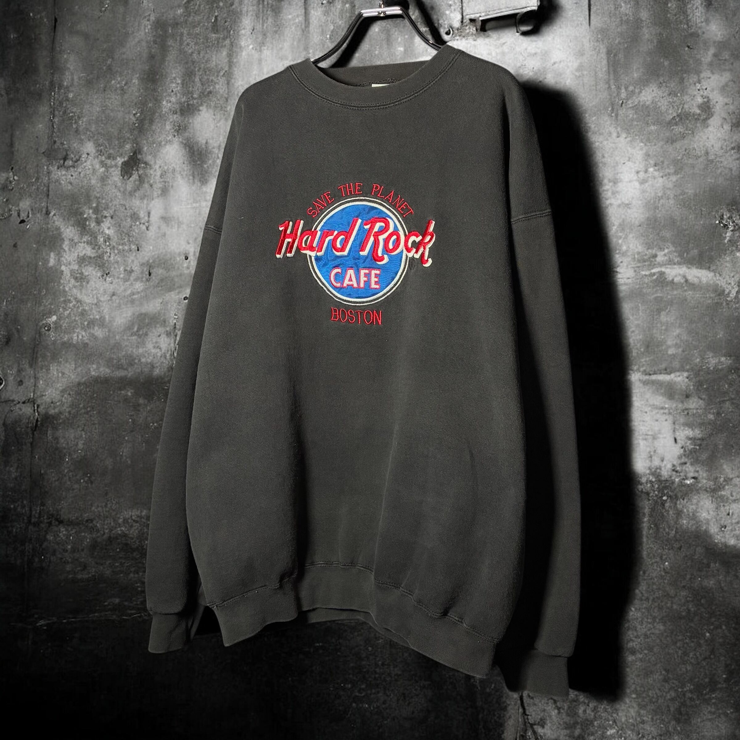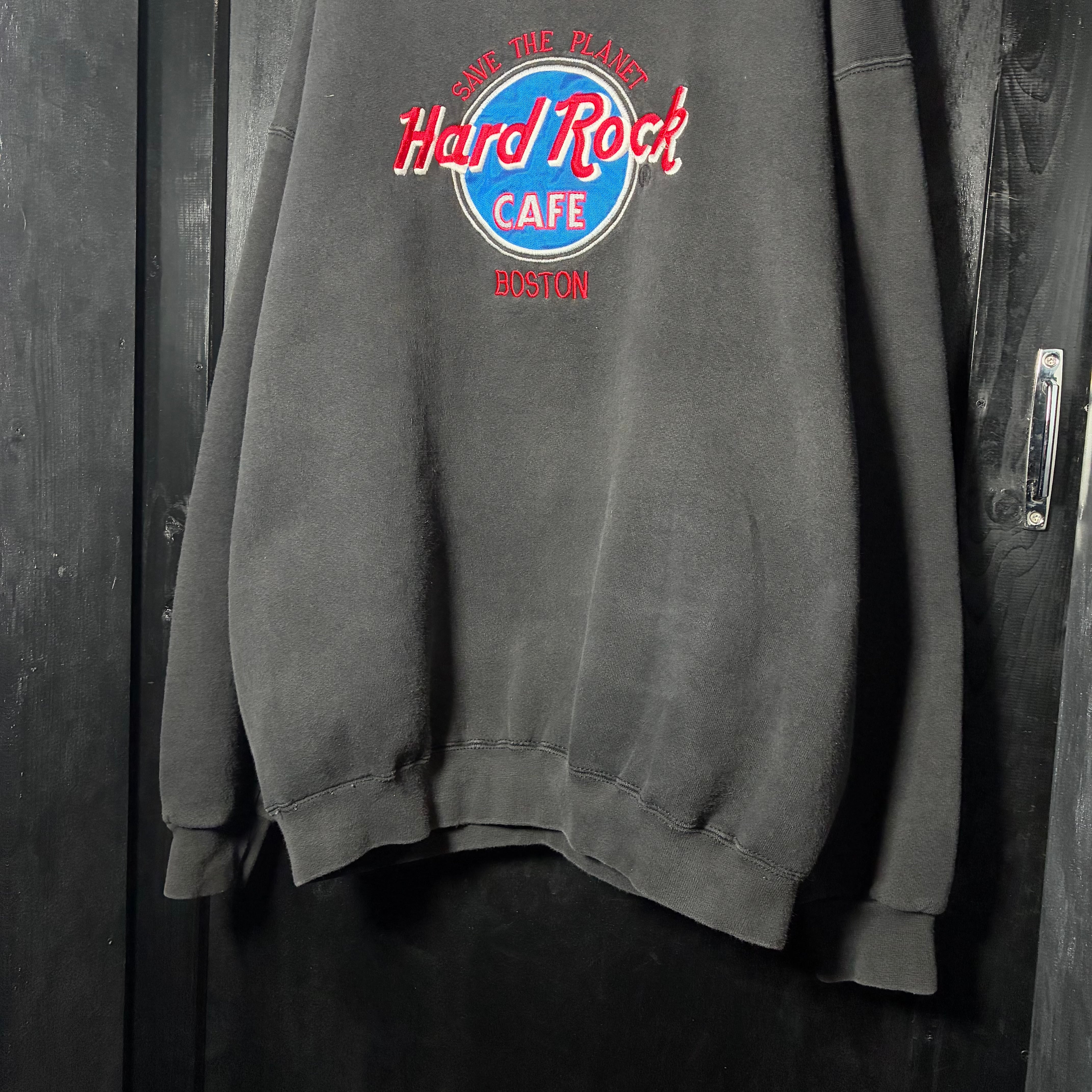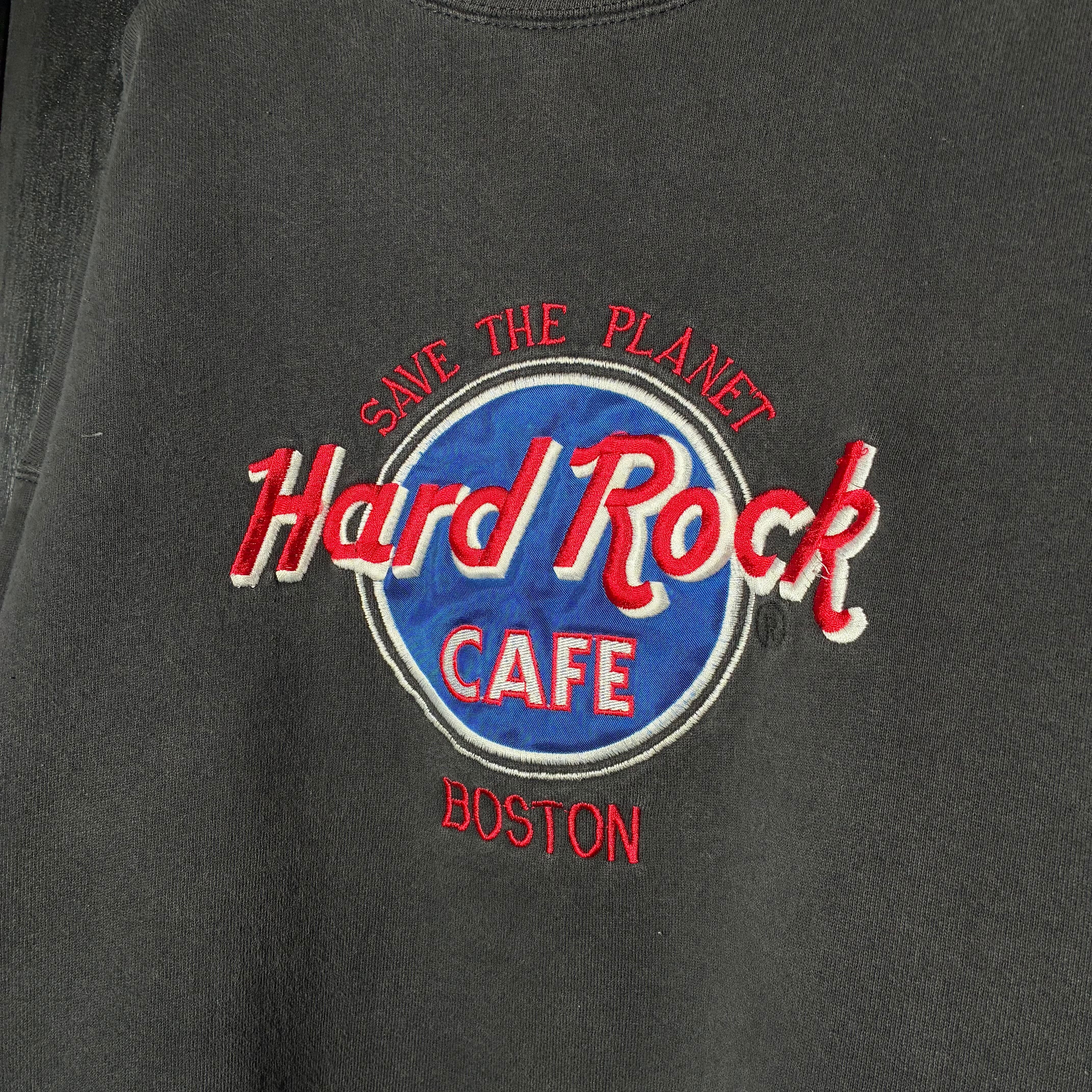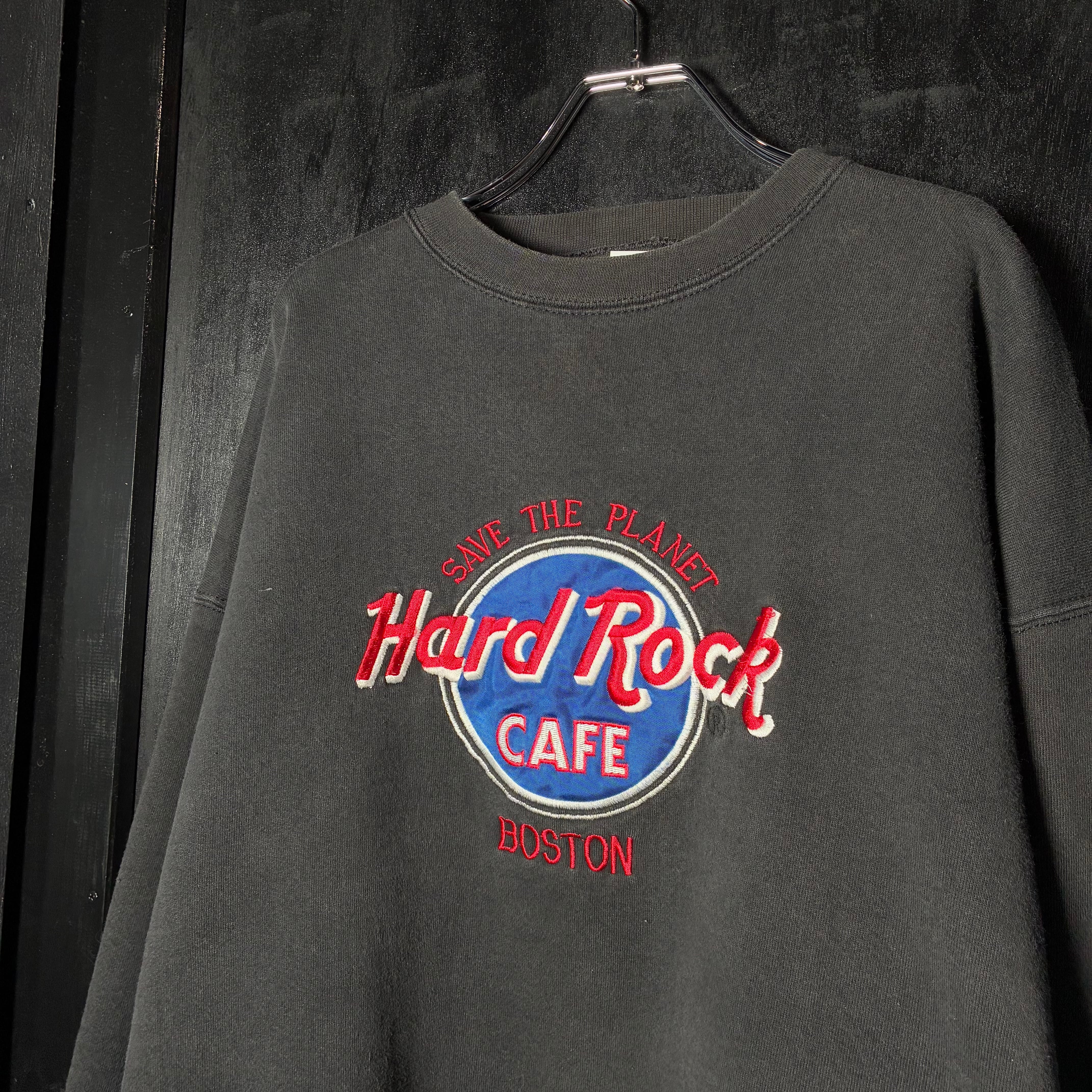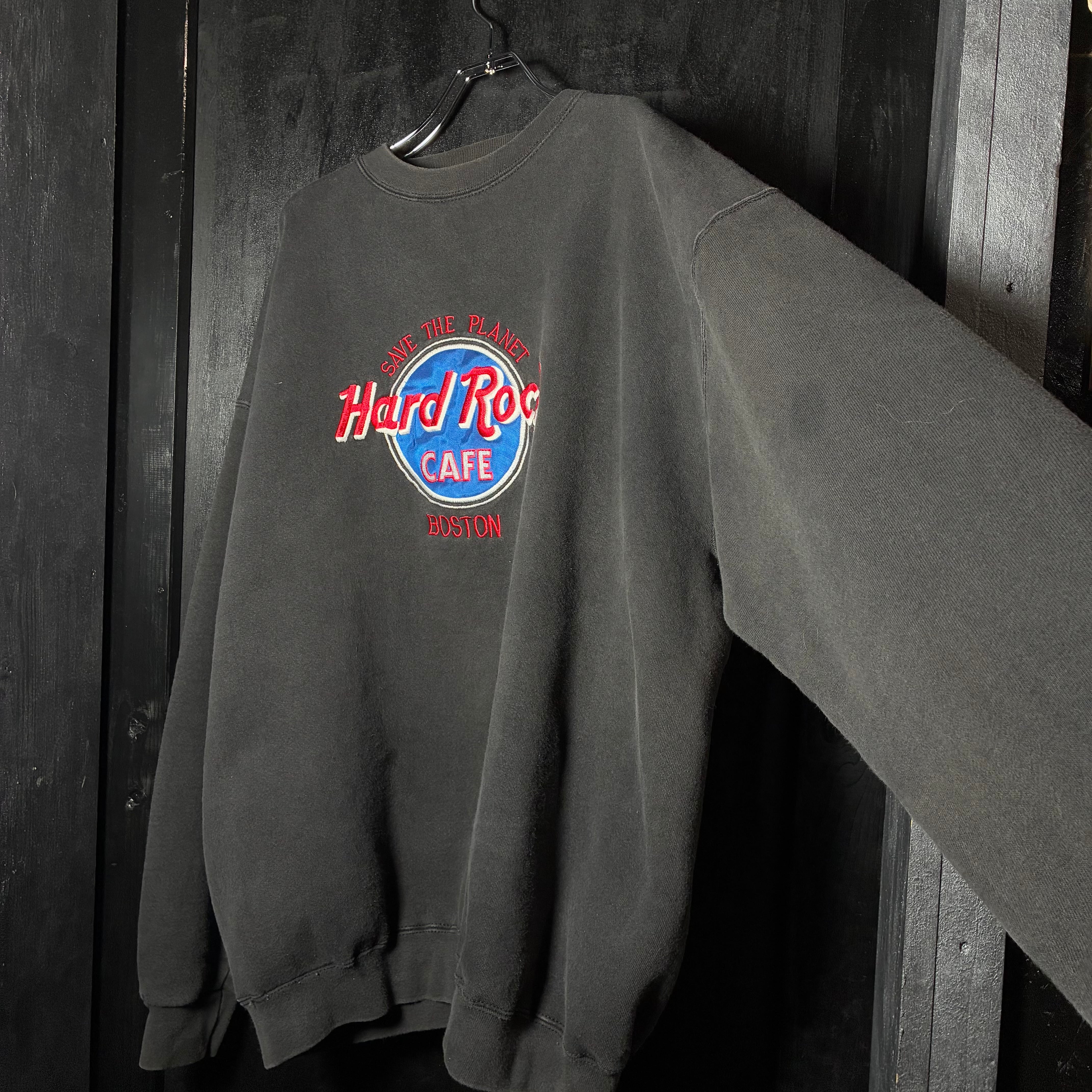90s USA製 Hard Rock Cafe スウェット ハードロック BOSTON フェード ブラック 刺繍 ヴィンテージ 古着