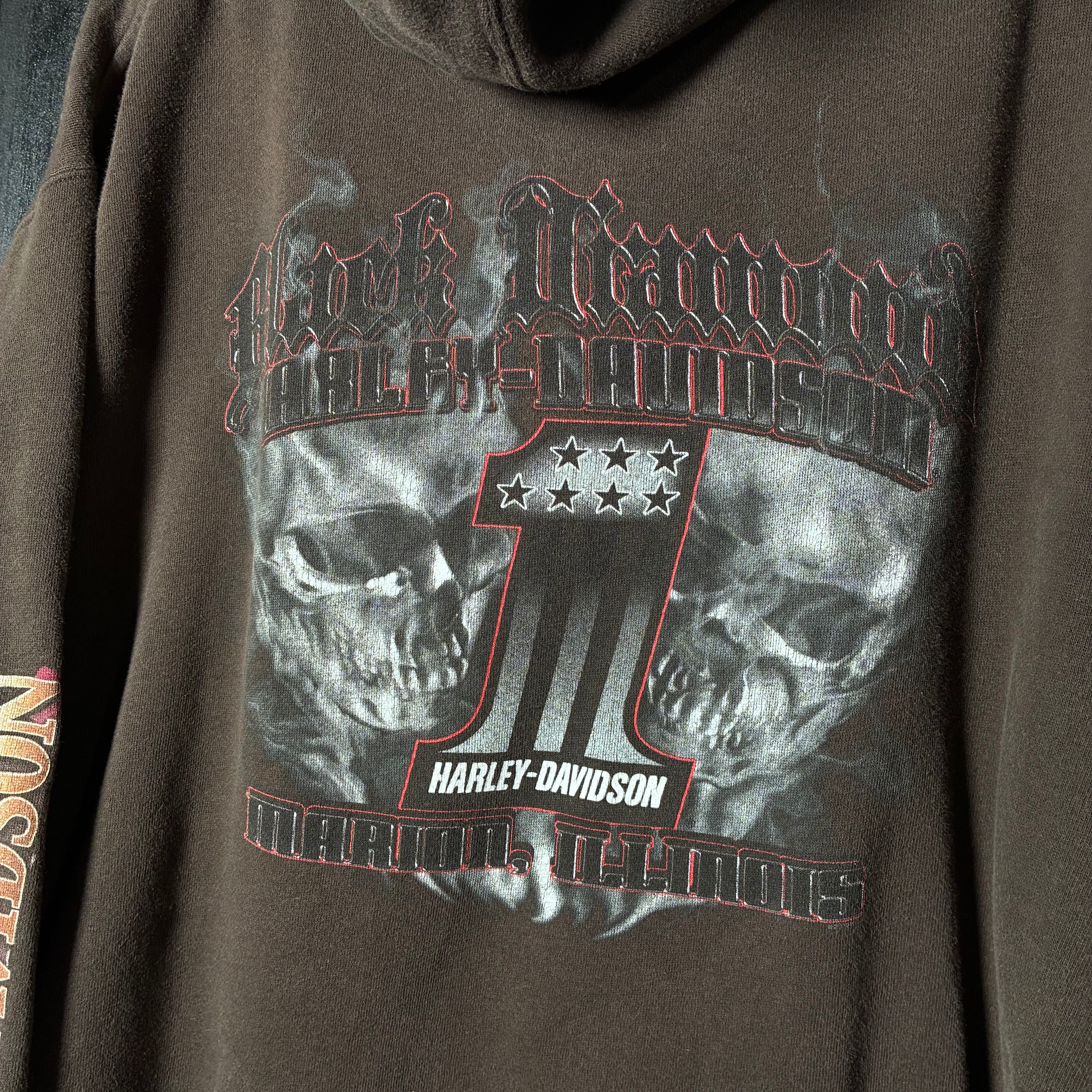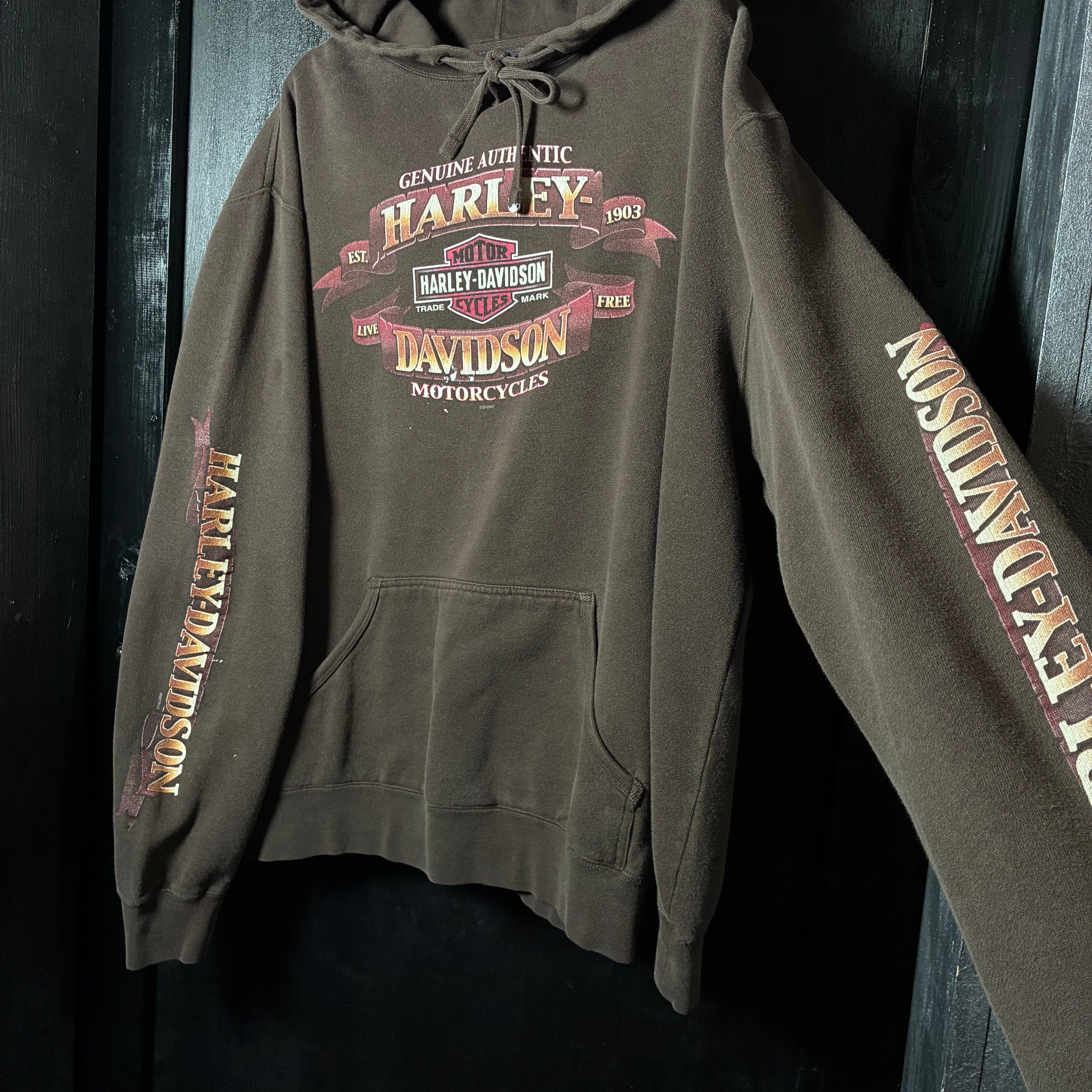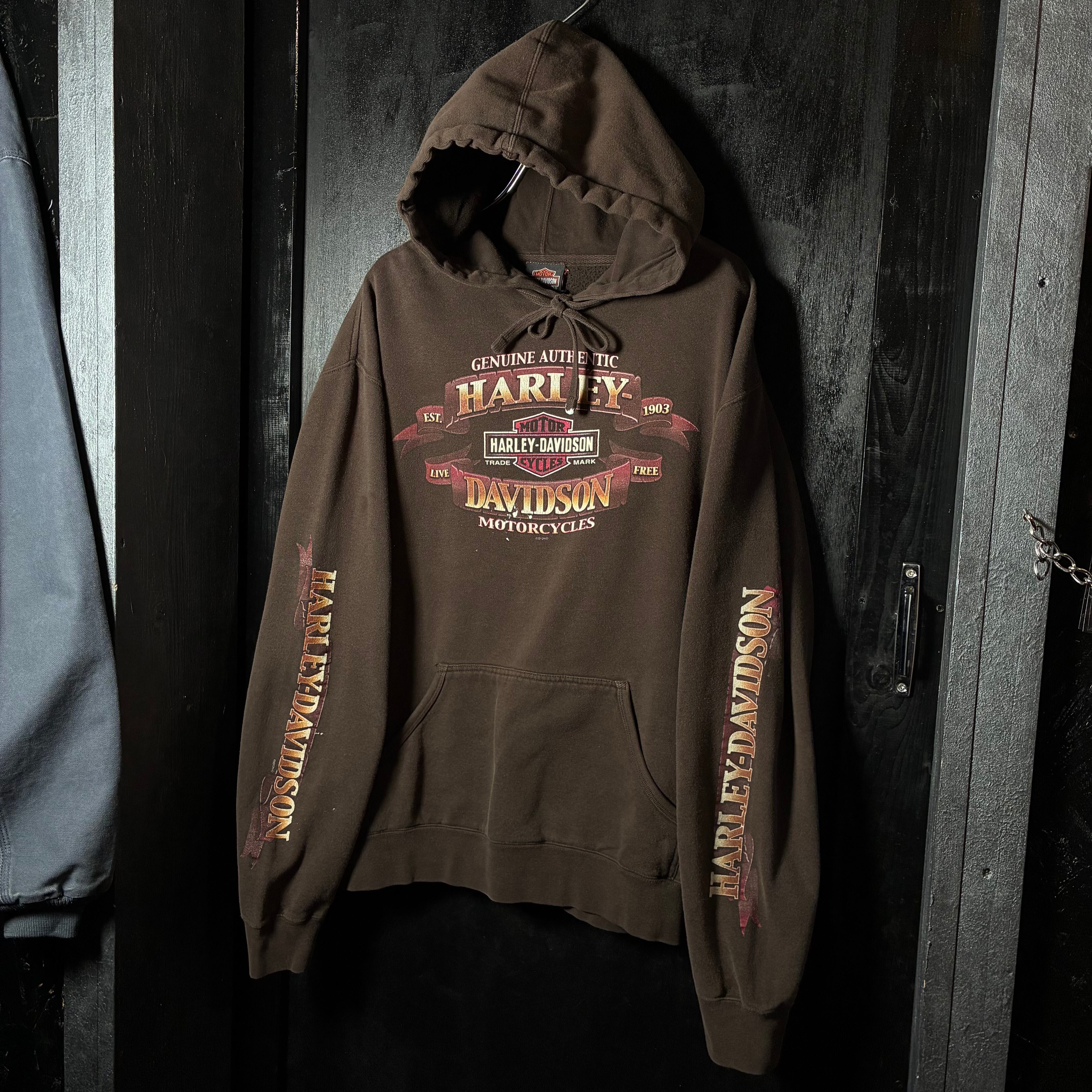 HARLEY-DAVIDSON プルオーバーパーカー 袖プリント No1 スカル ブラウン ハーレー