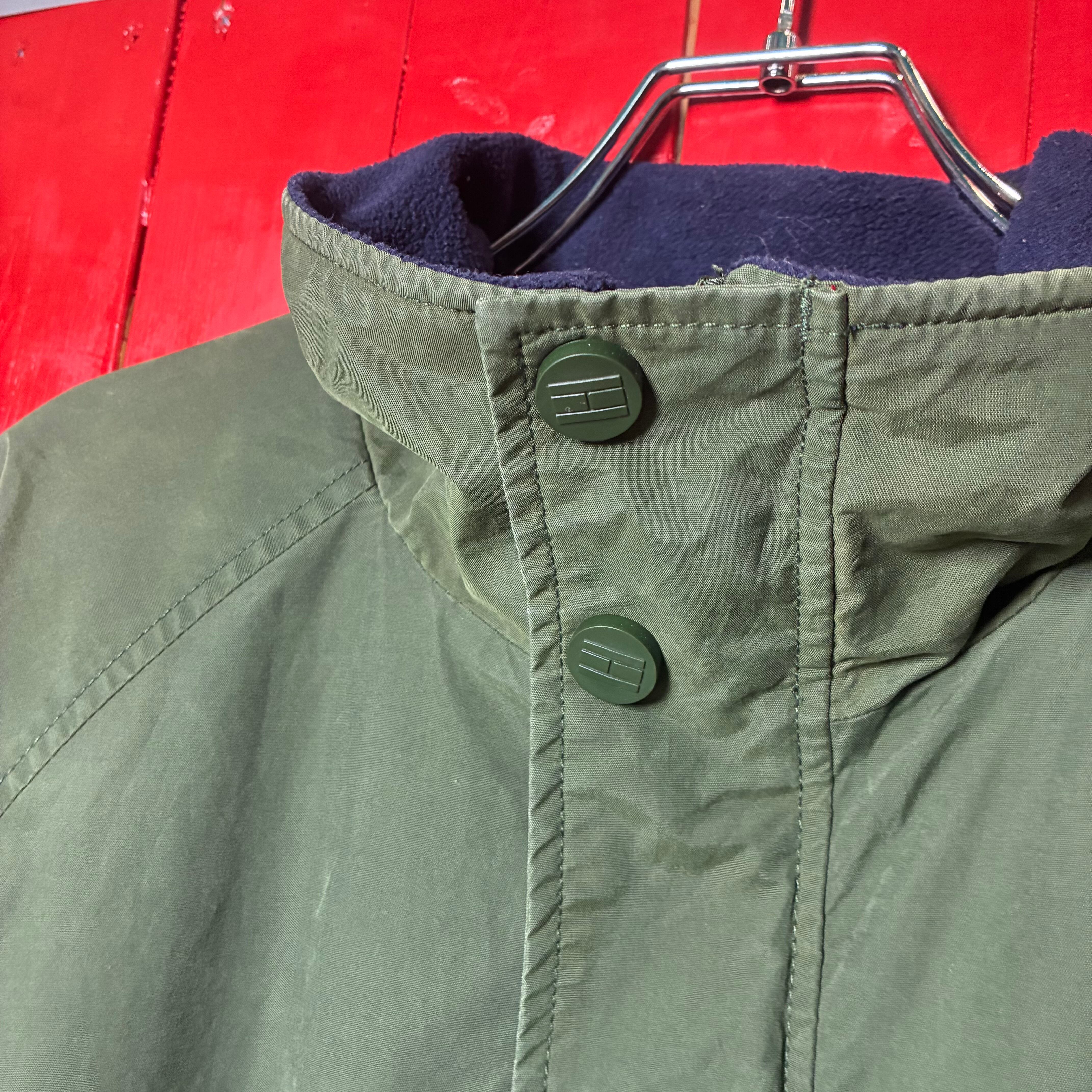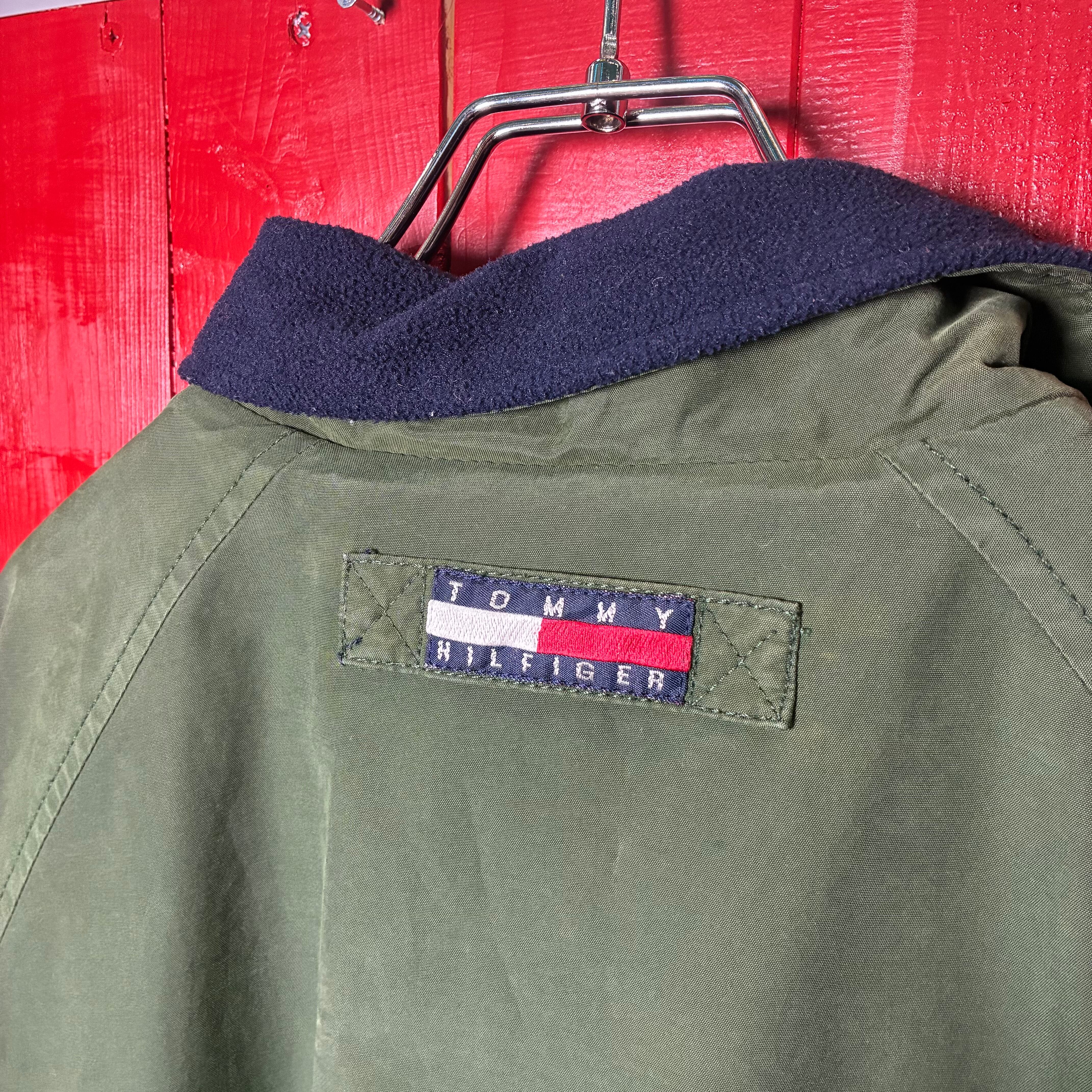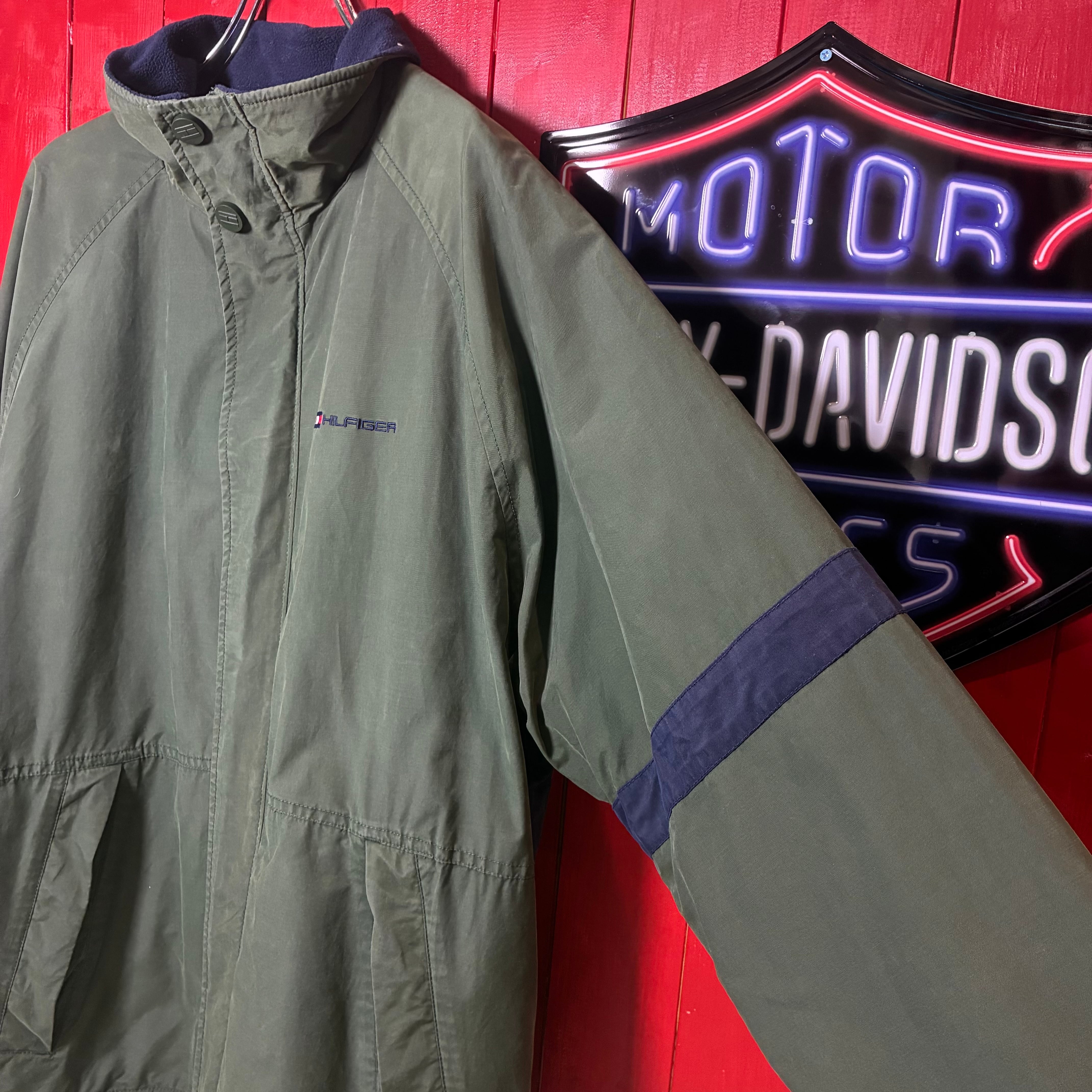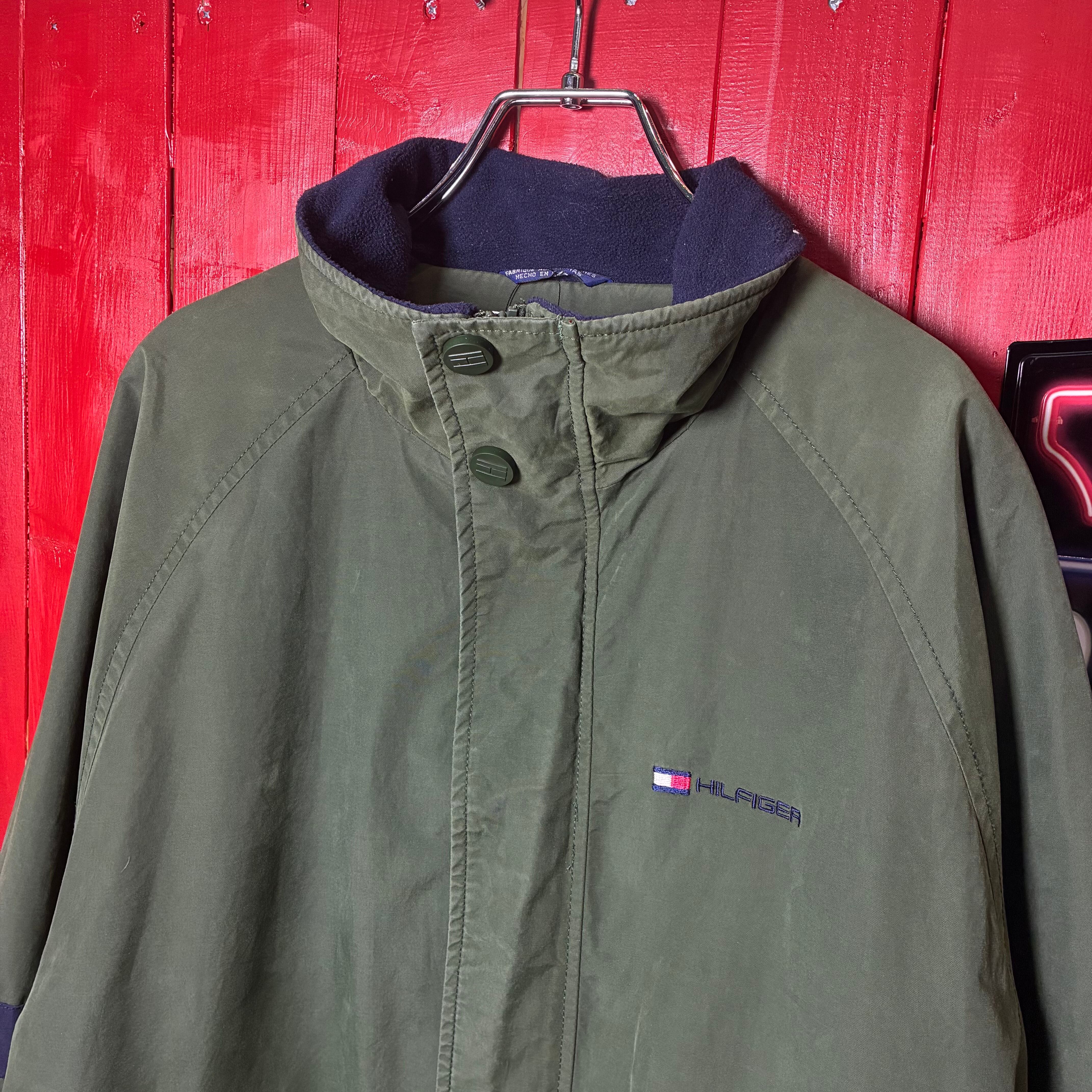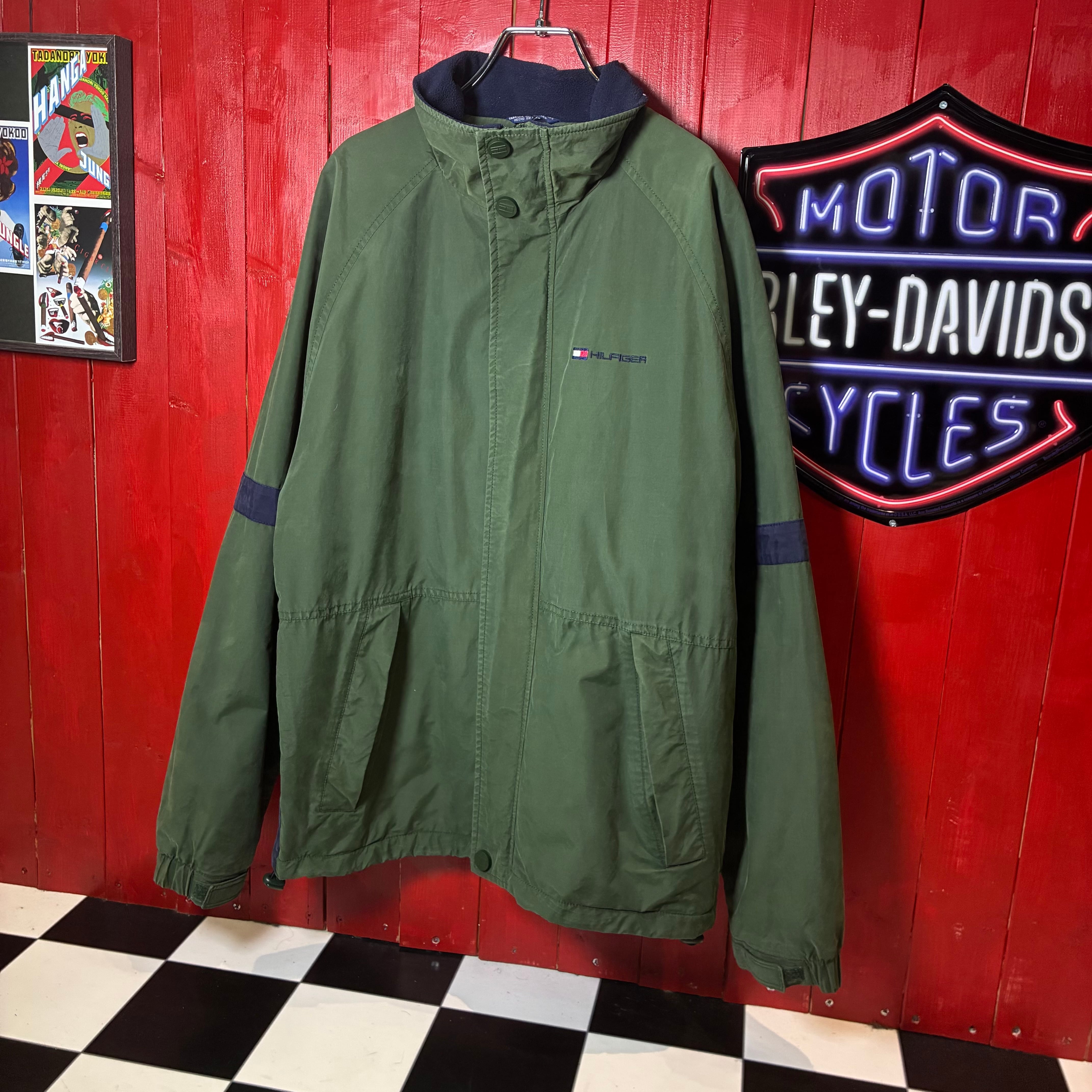 90s TOMMY HILFIGER ウォームアップジャケット トミーヒルフィガー カーキ ネイビー 裏フリース ナイロンジャケット ヴィンテージ 古着