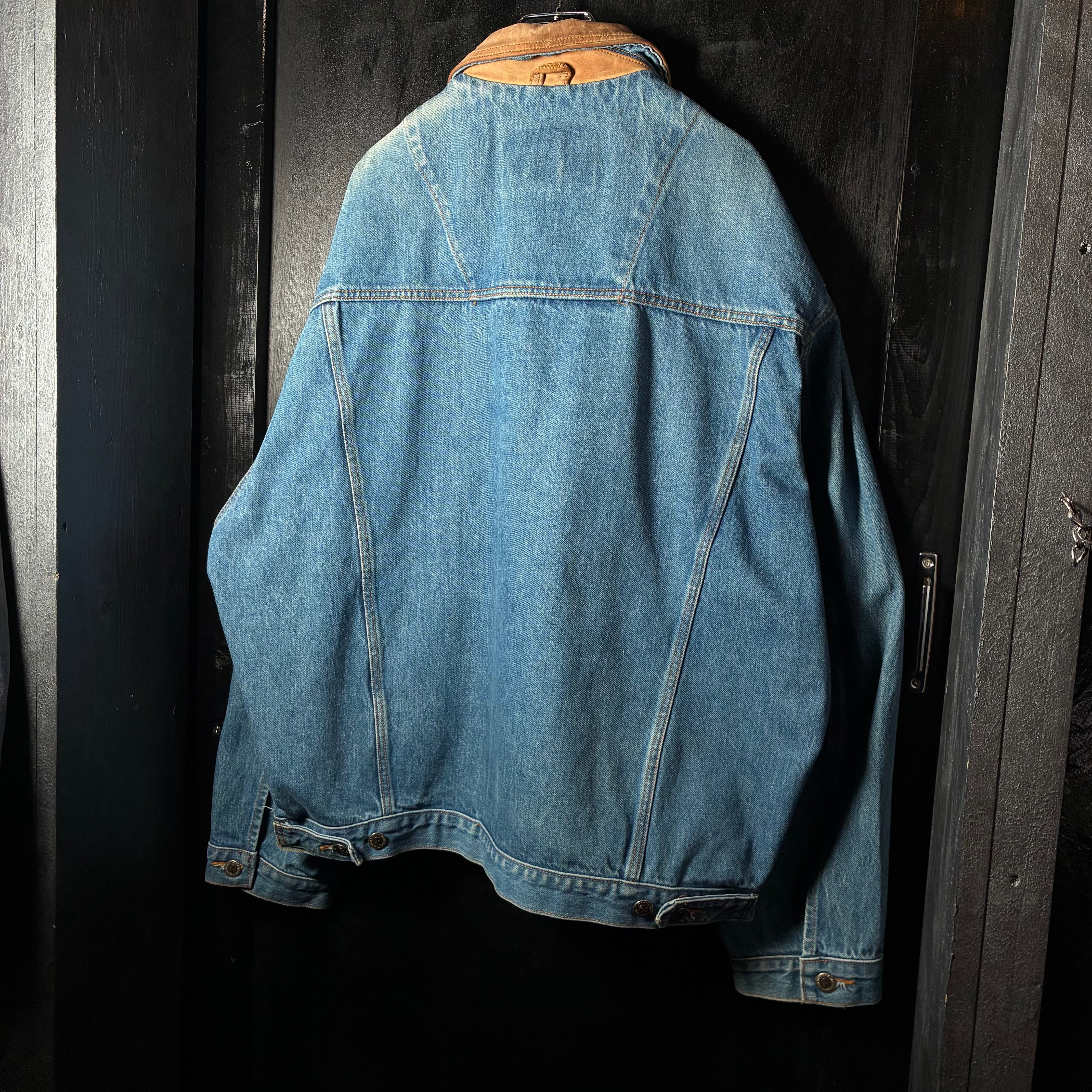 90s USA製 Timberland デニムジャケット 襟本革 ブルー ティンバーランド