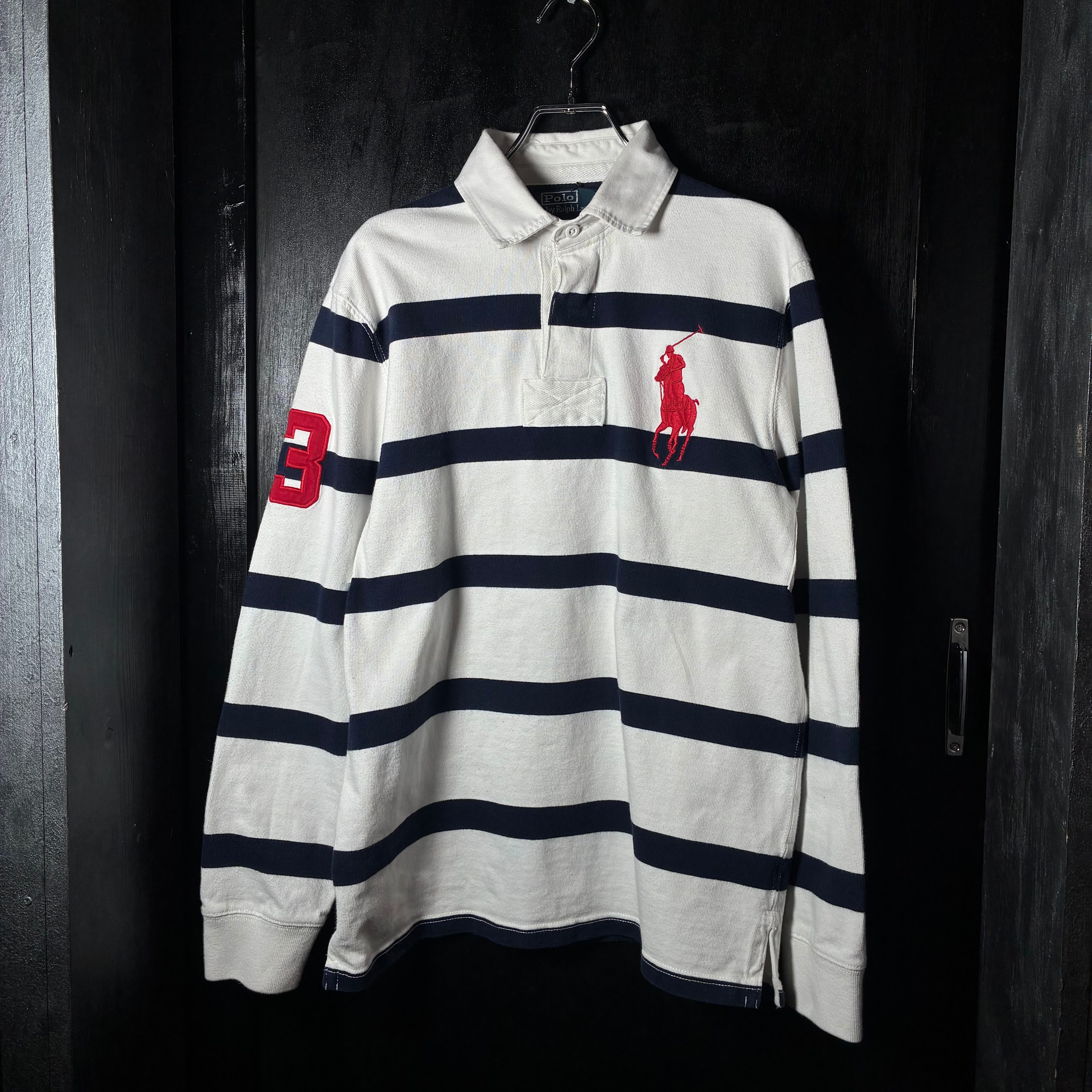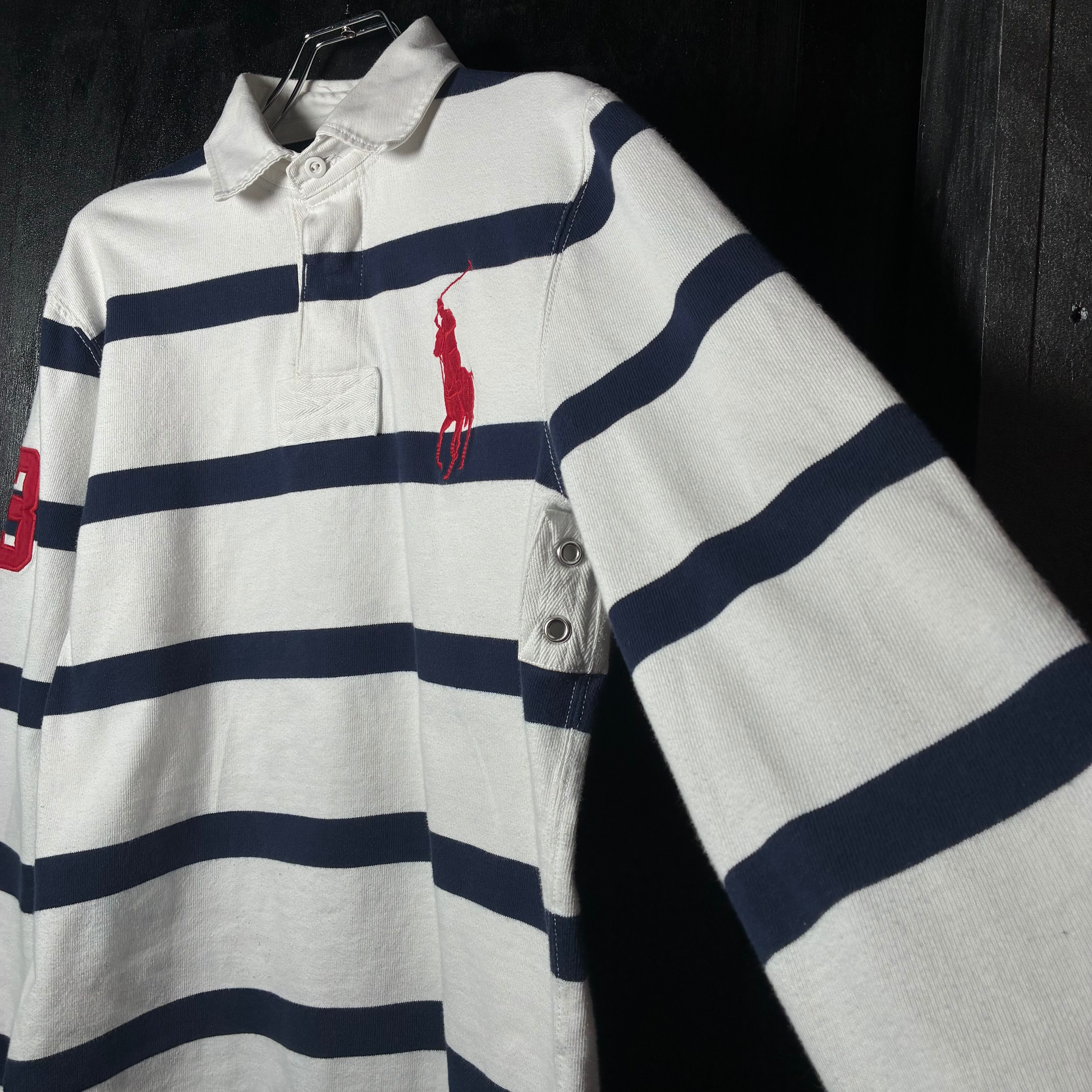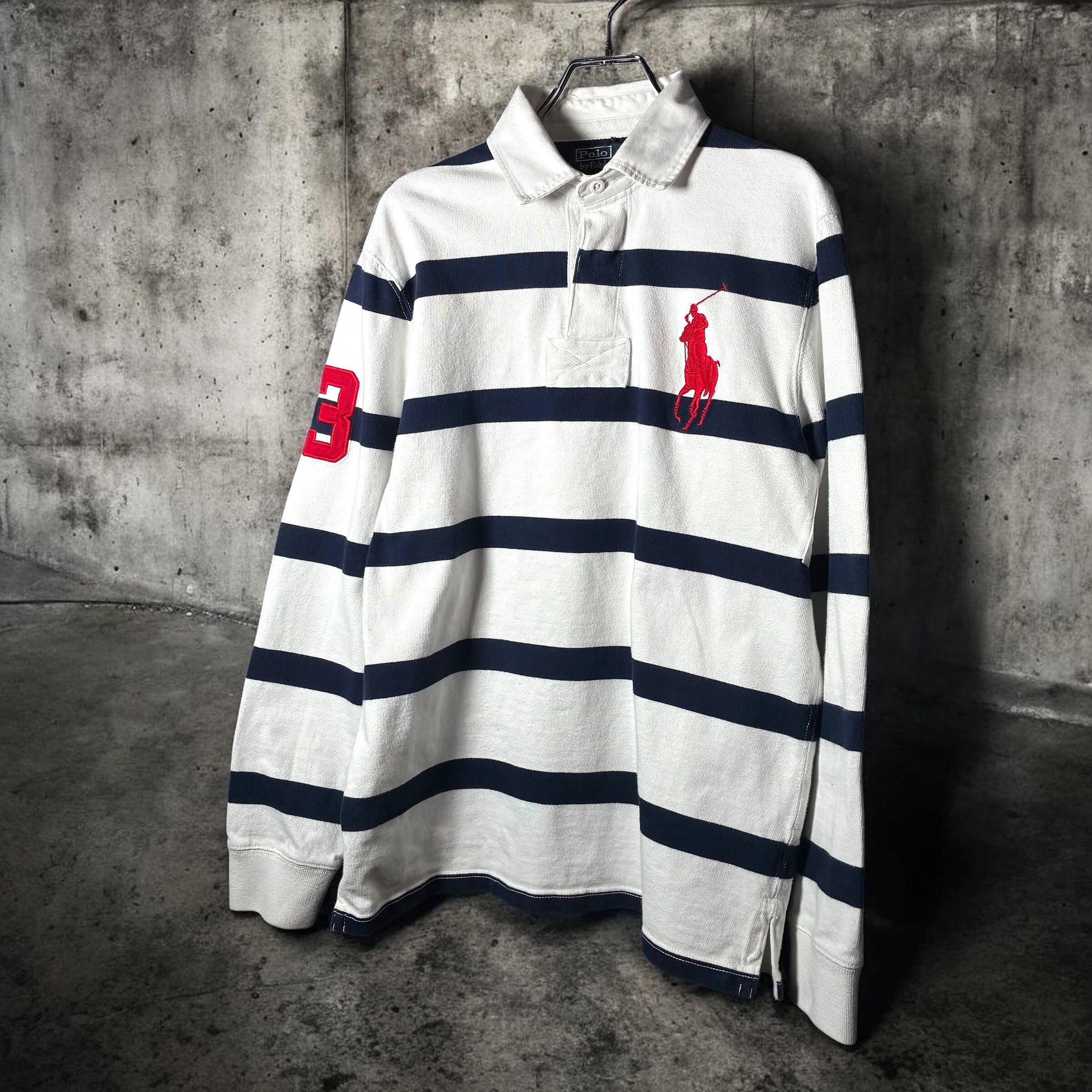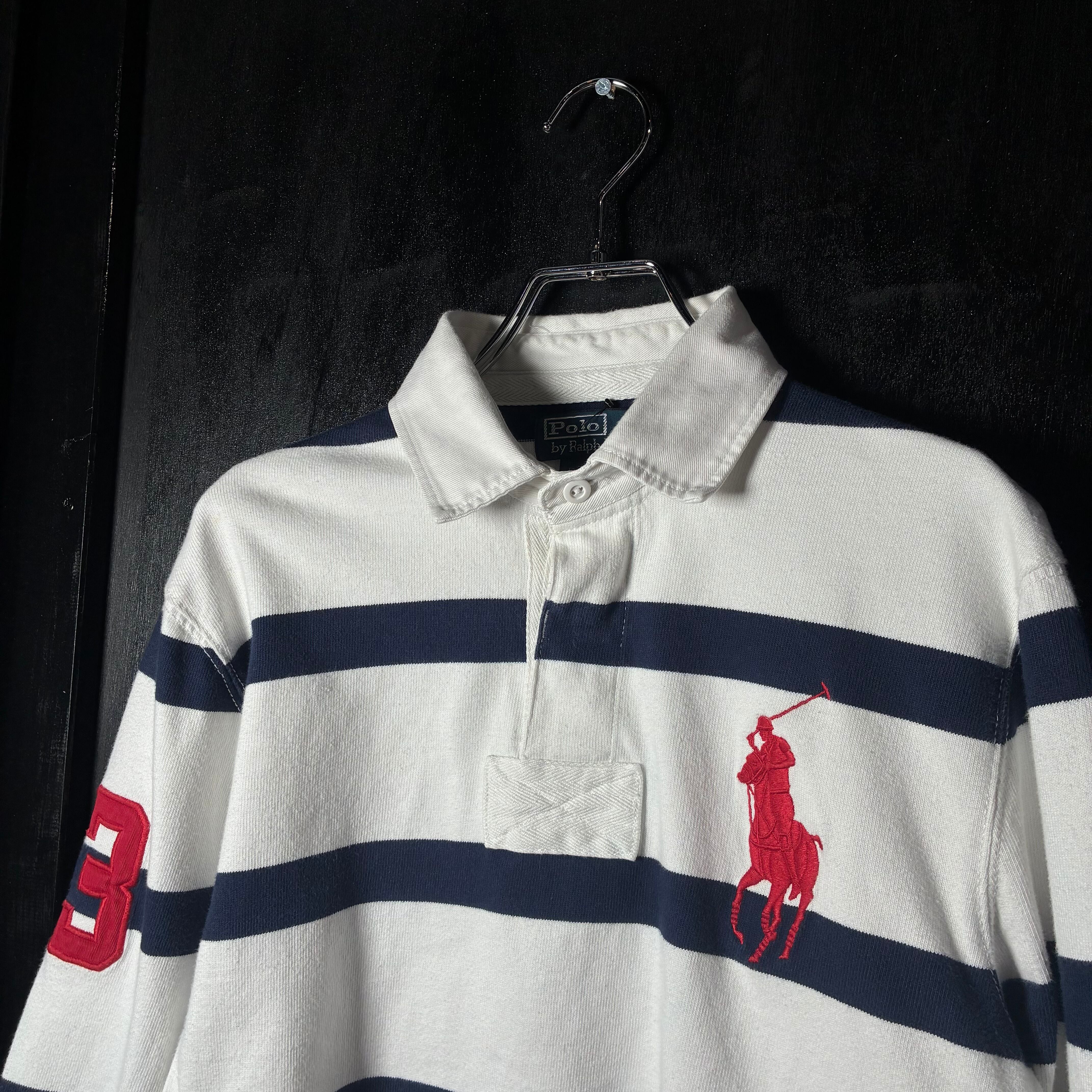 90s Polo Ralph Lauren ラルフローレン ラガーシャツ ビッグポニー ナンバリング ボーダーシャツ ホワイト ネイビー 長袖ポロシャツ ヴィンテージラルフ