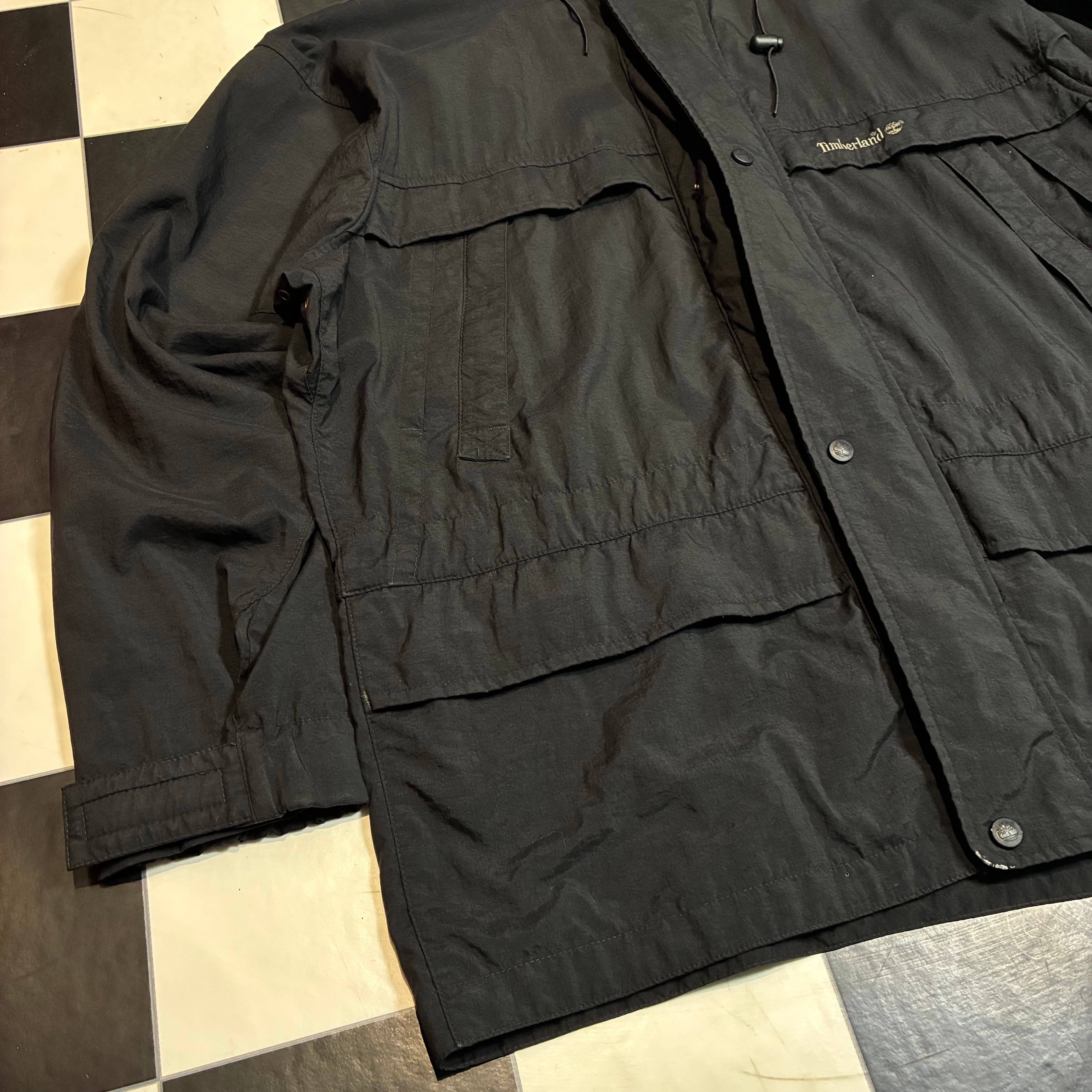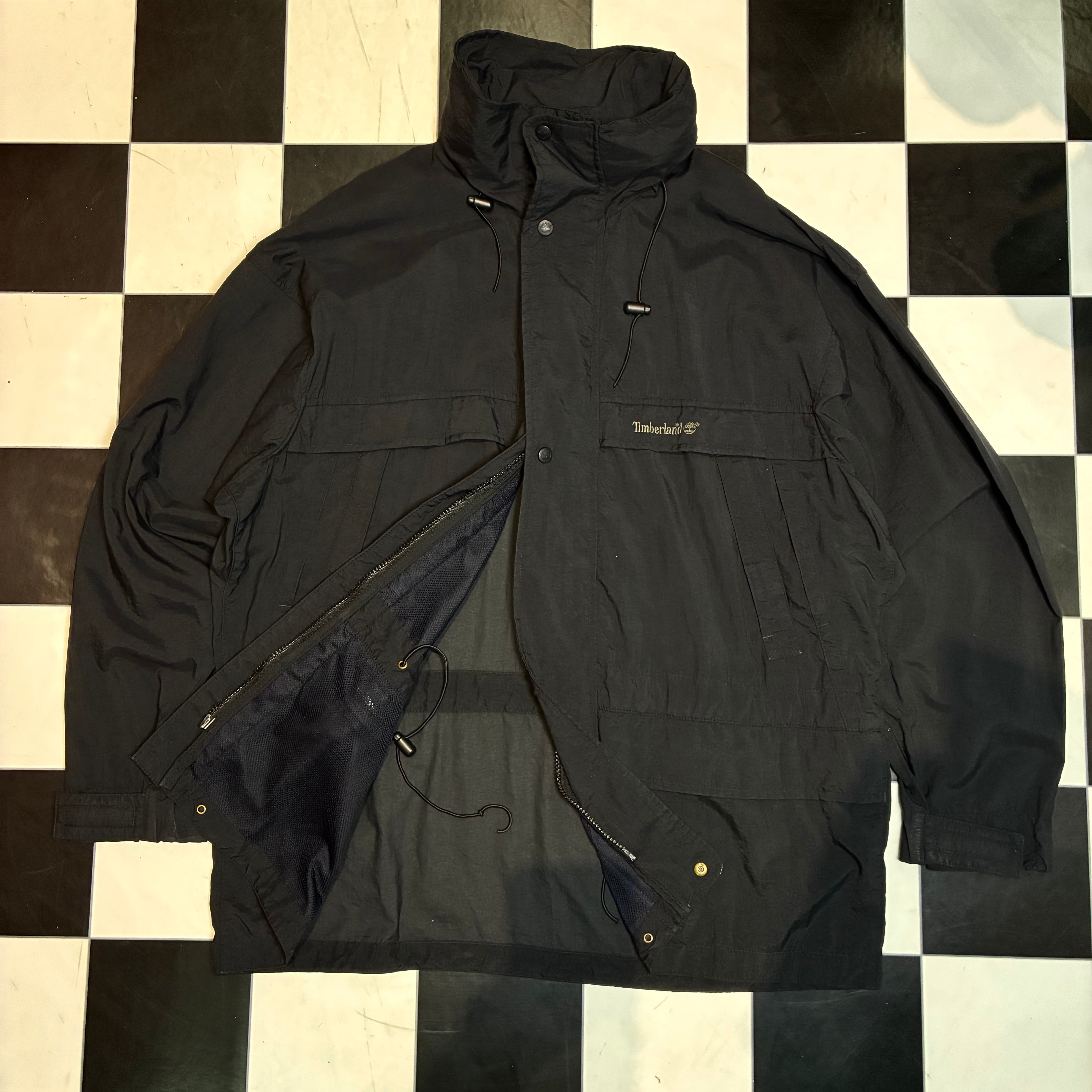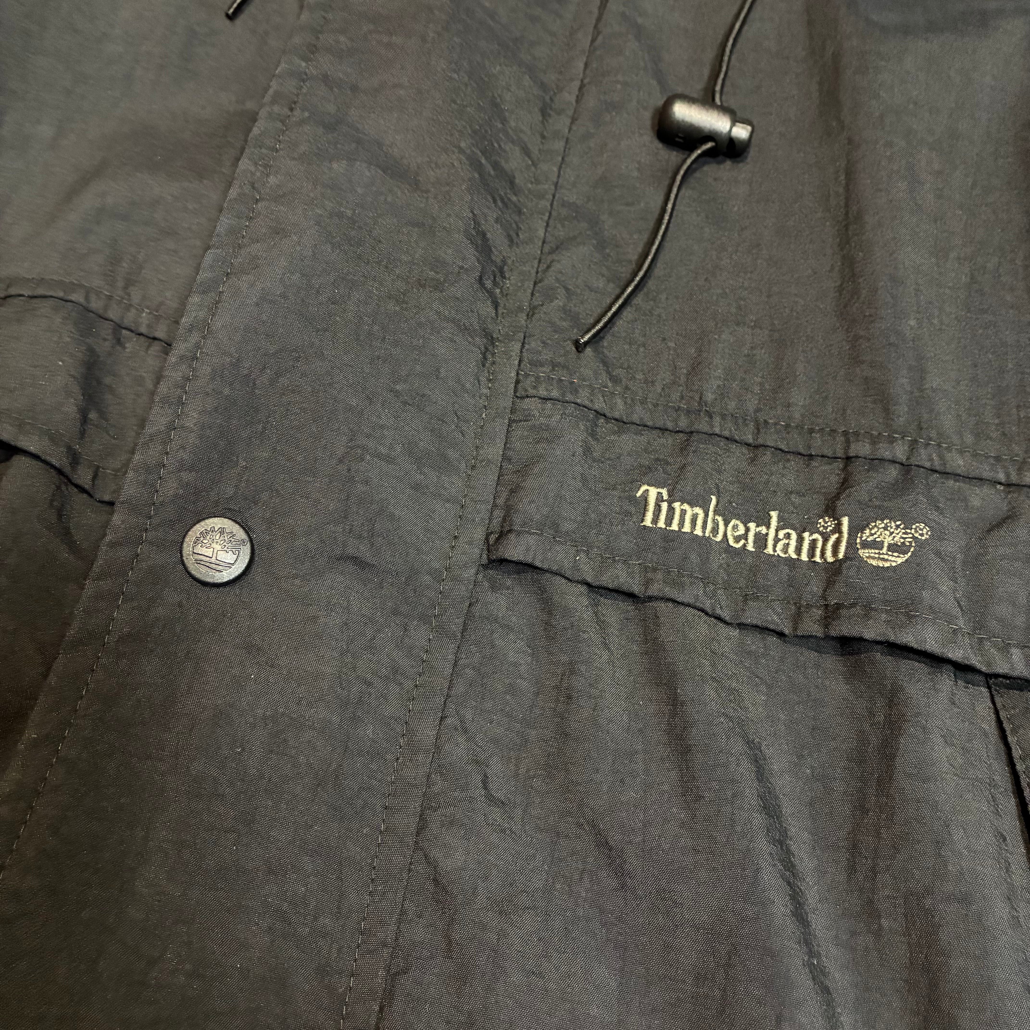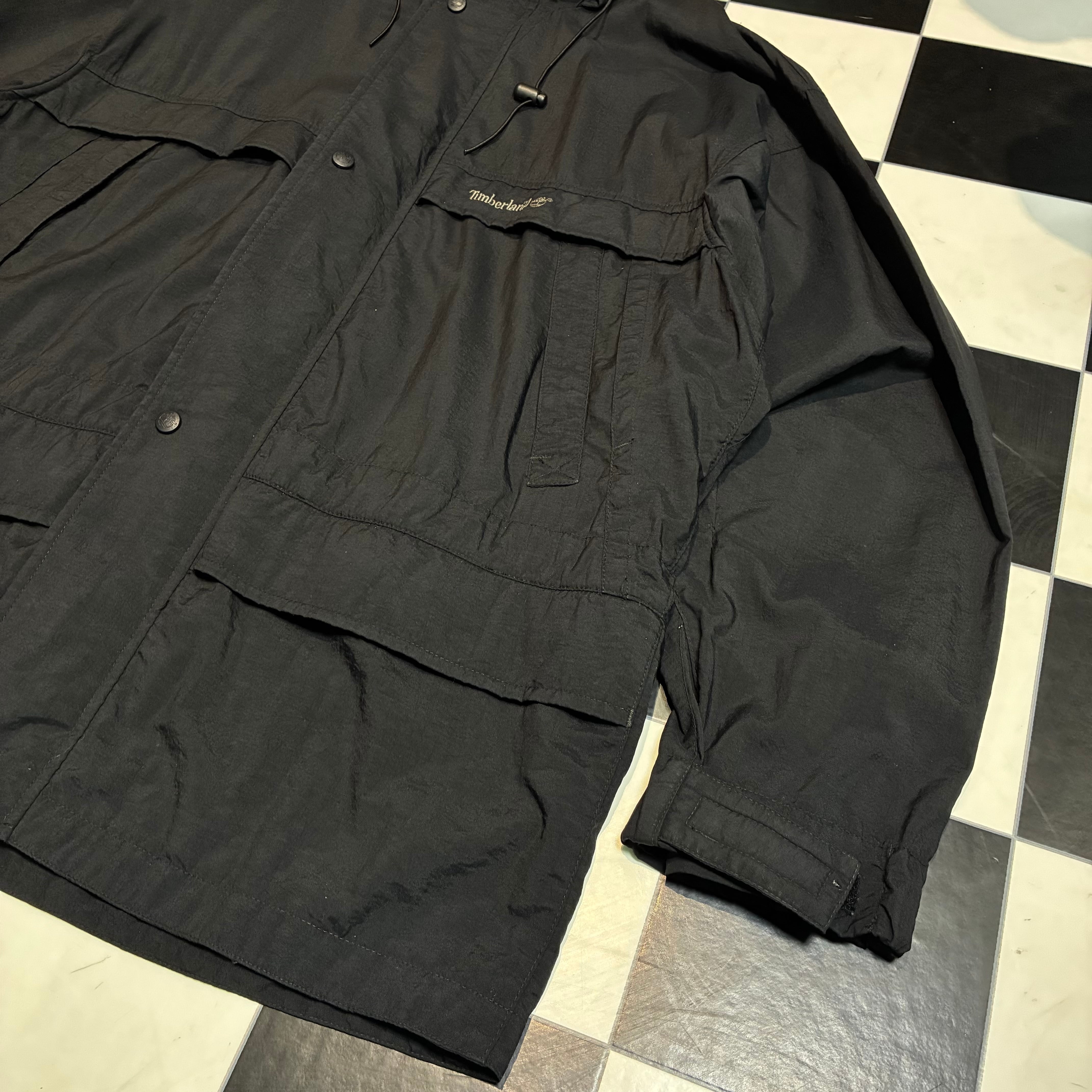 Timberland WEATHERGEAR 90sティンバーランド マウンテンパーカー ブラックジャケット ナイロンジャケット ダブルジップ 格納式フード ドローコード付き テック系古着 メンズ古着 アウトドア古着