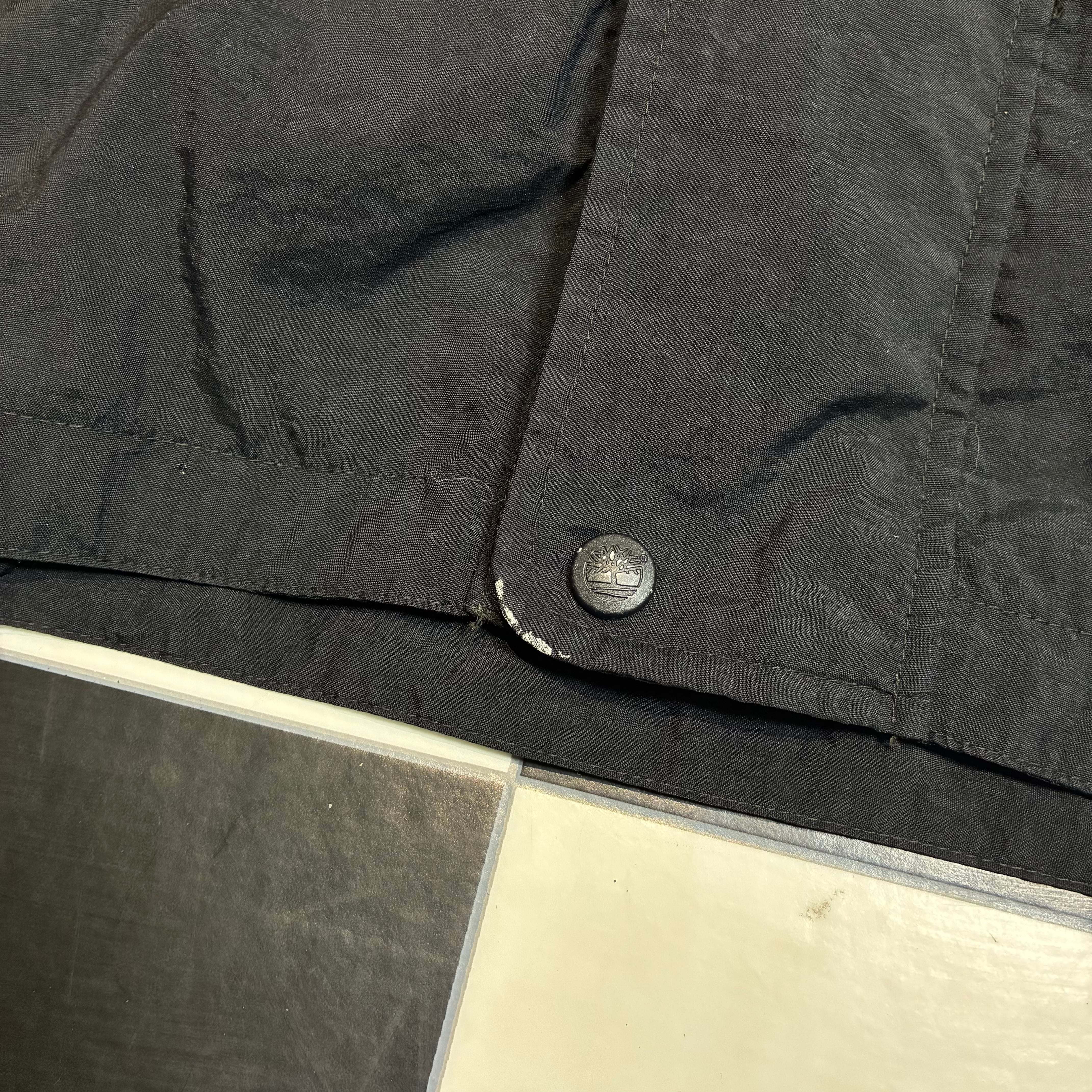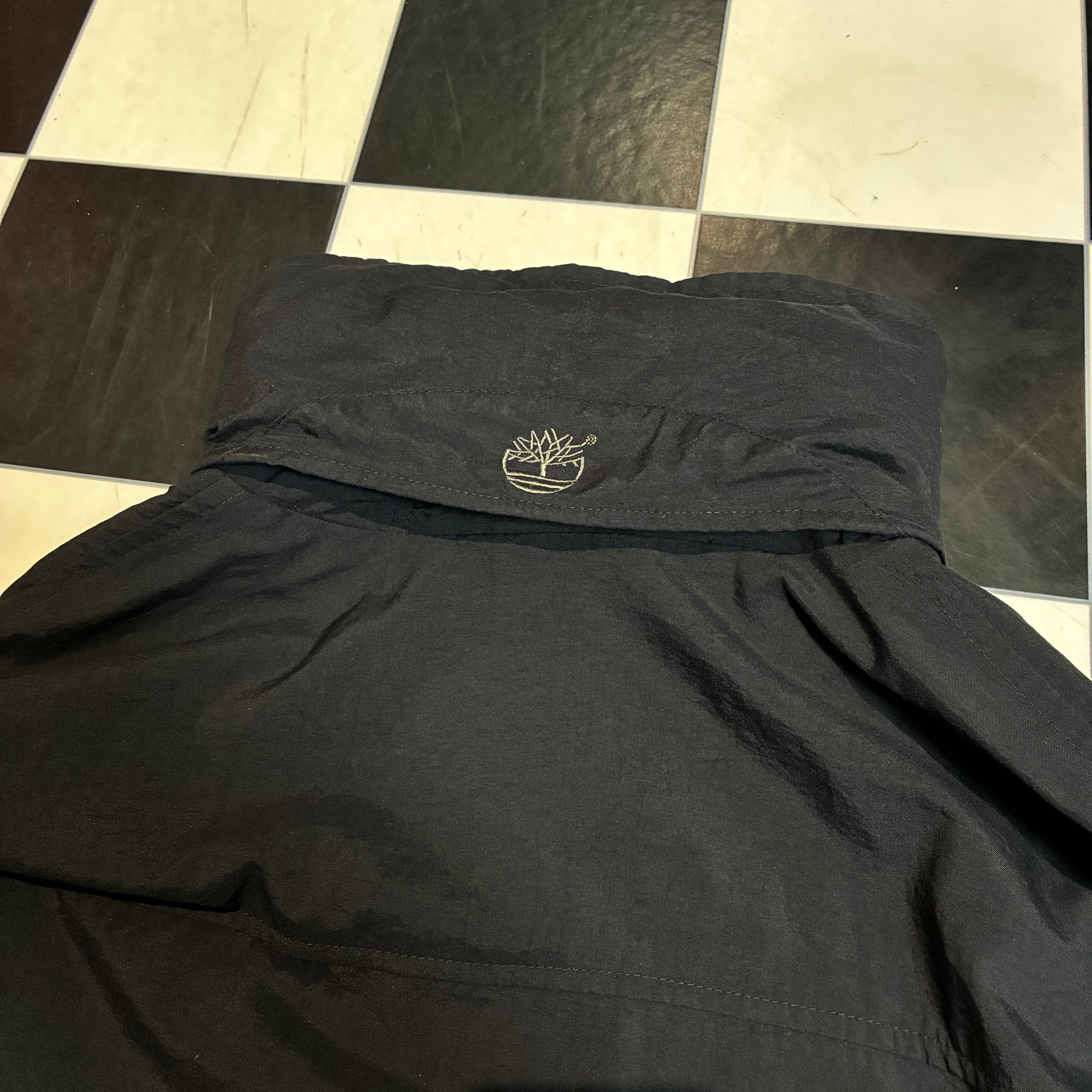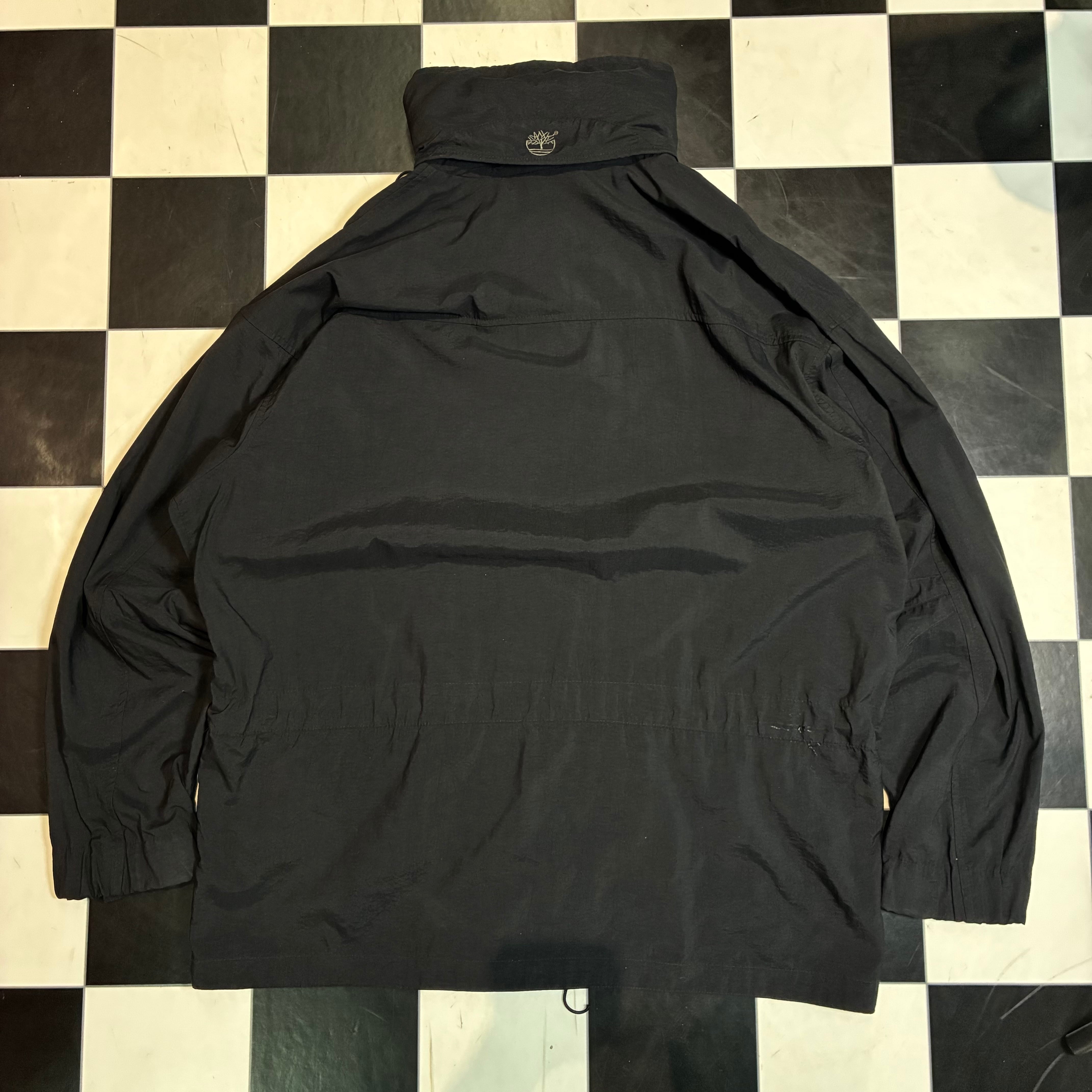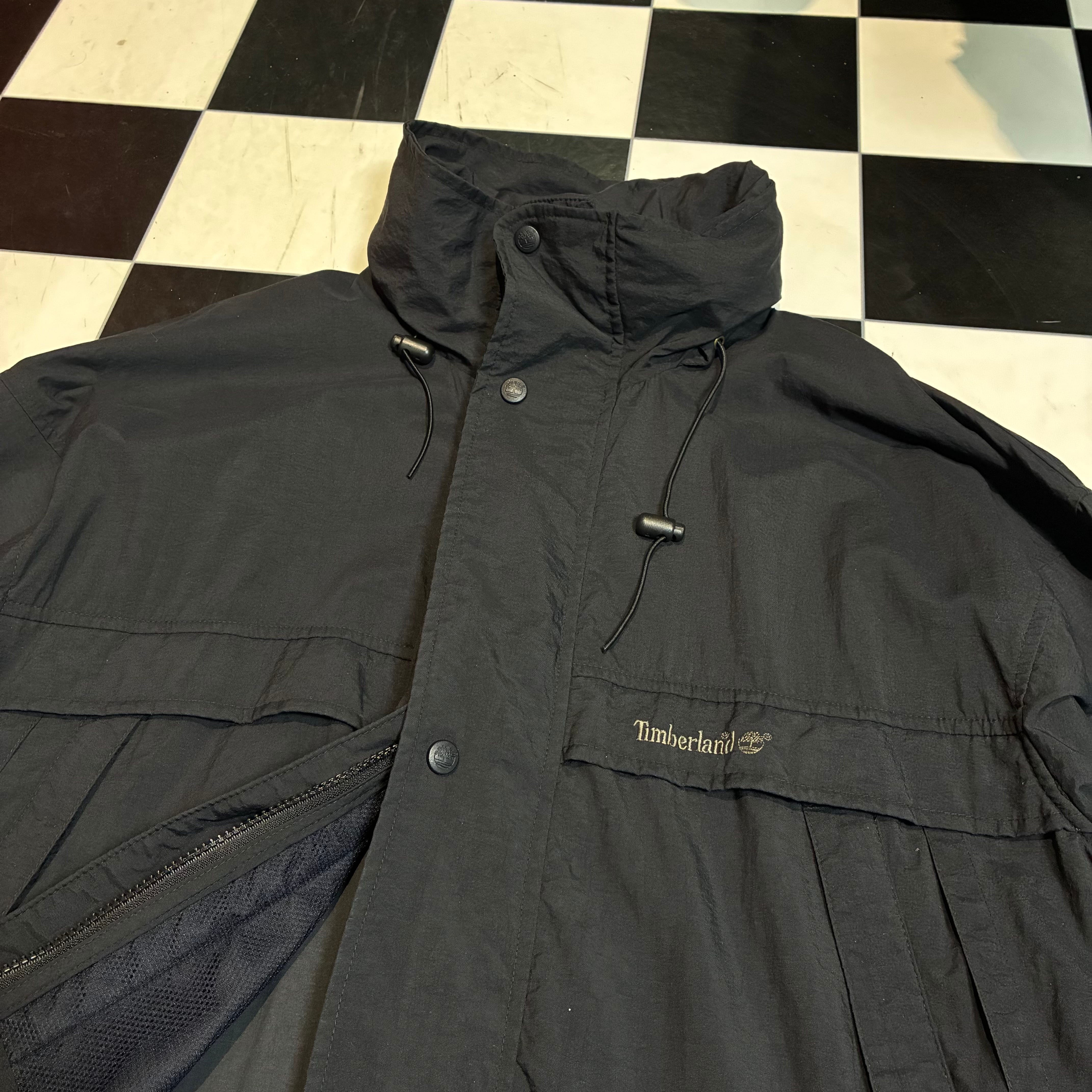 Timberland WEATHERGEAR 90sティンバーランド マウンテンパーカー ブラックジャケット ナイロンジャケット ダブルジップ 格納式フード ドローコード付き テック系古着 メンズ古着 アウトドア古着