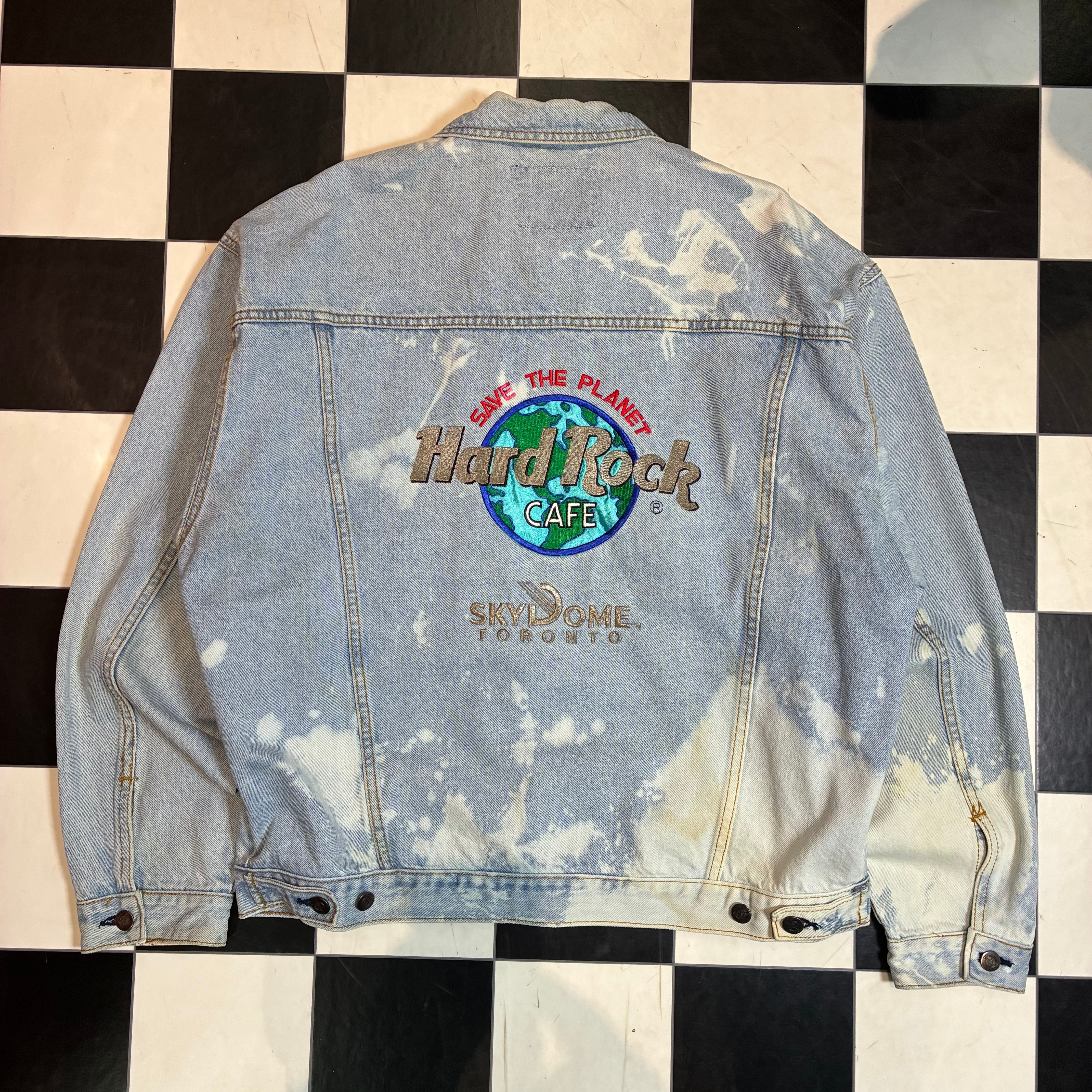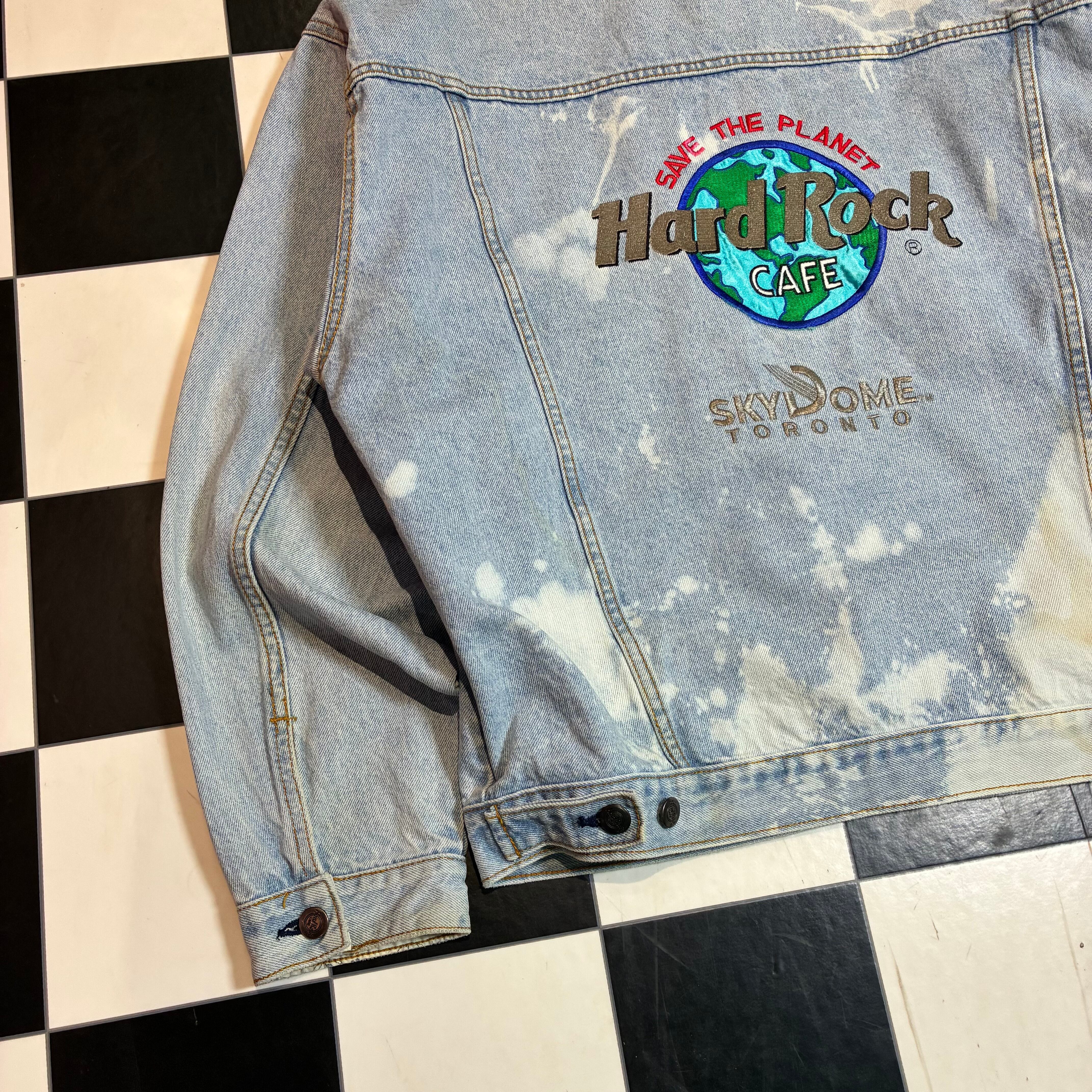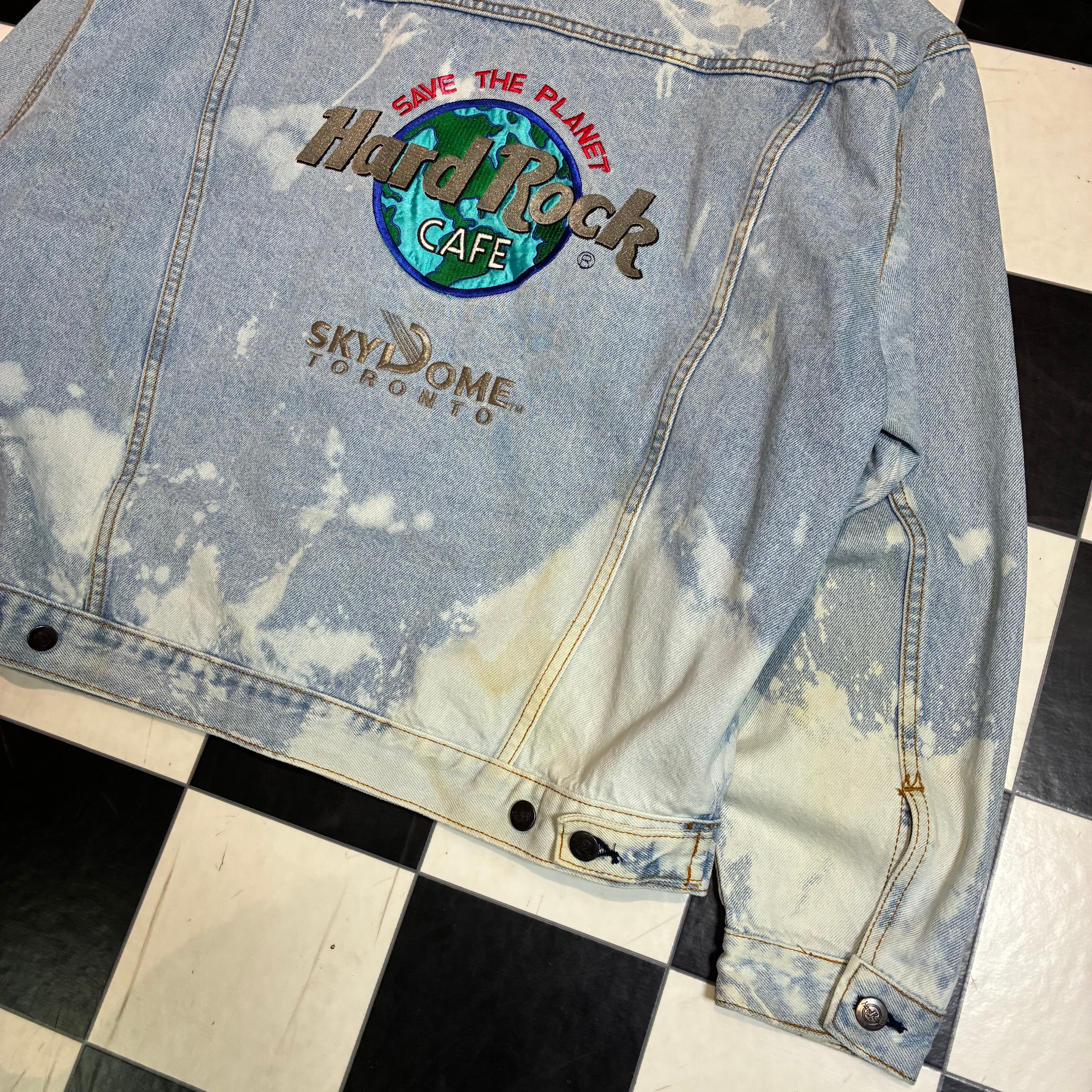 90s Hard Rock CAFE デニムジャケット ハードロックカフェ SKYDOME TORONTO ブリーチ加工 ヴィンテージデニム 刺繍ロゴ バンド 古着 Gジャン