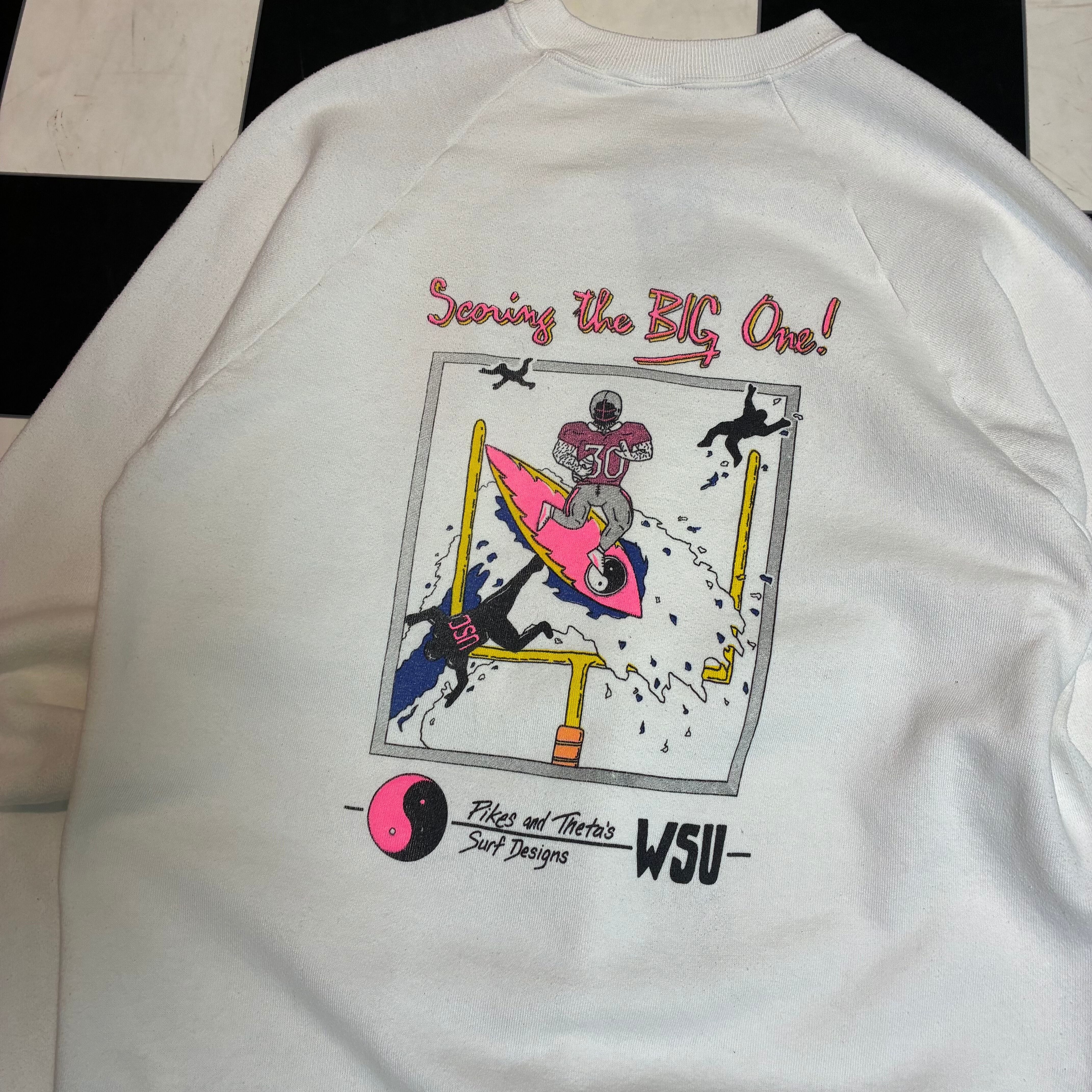 ラガーマンがサーフィンをしている謎のデザインで時代を感じるグラフィックです。