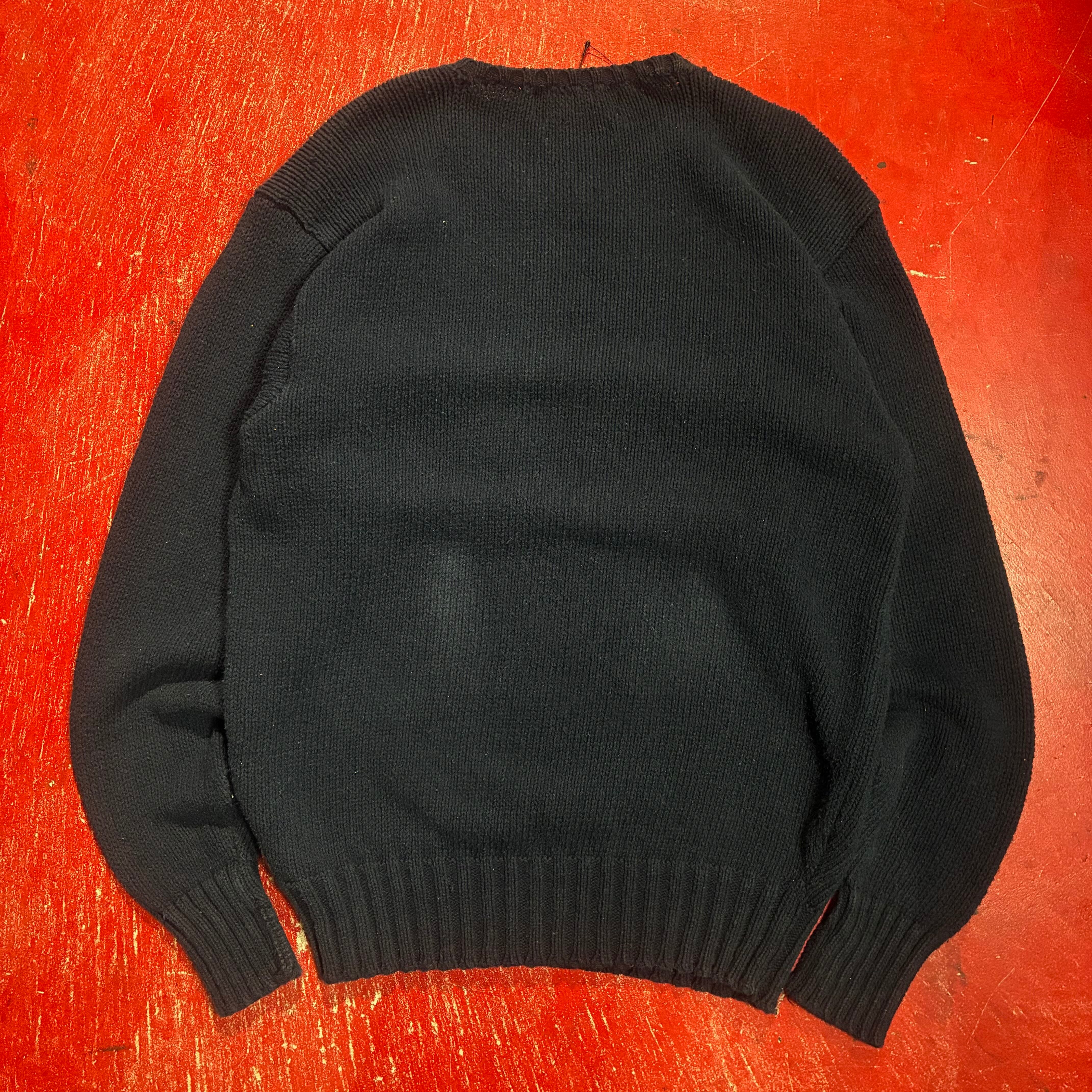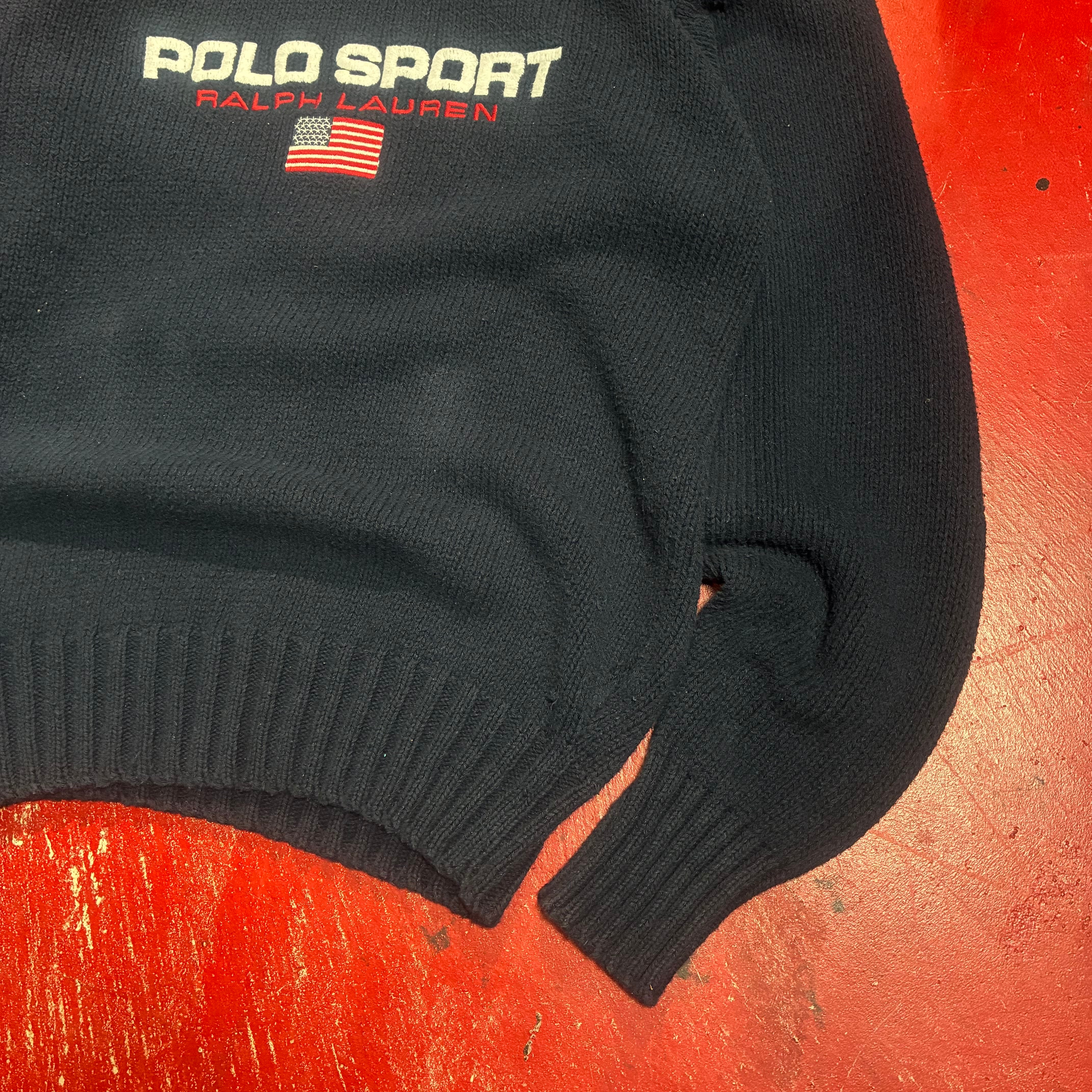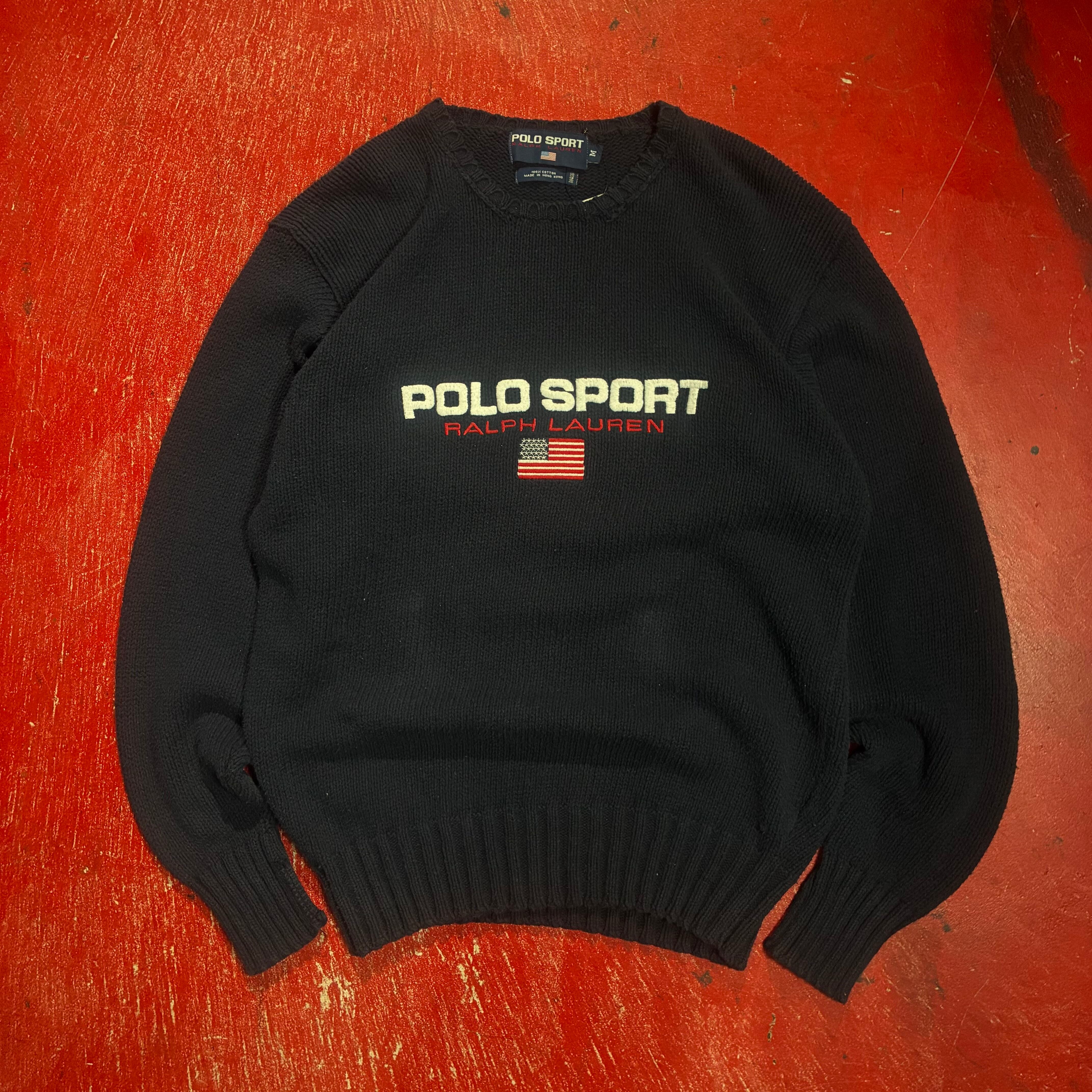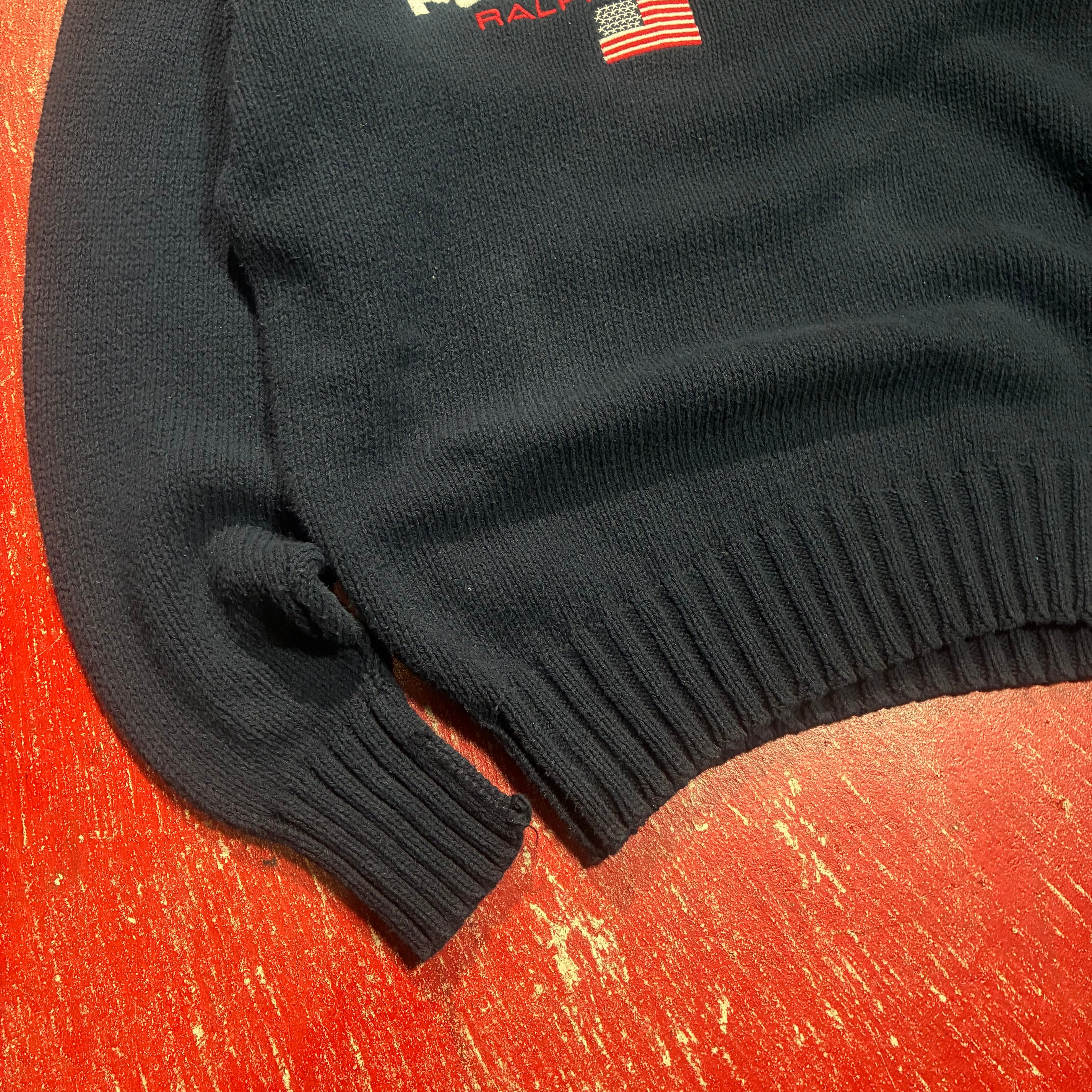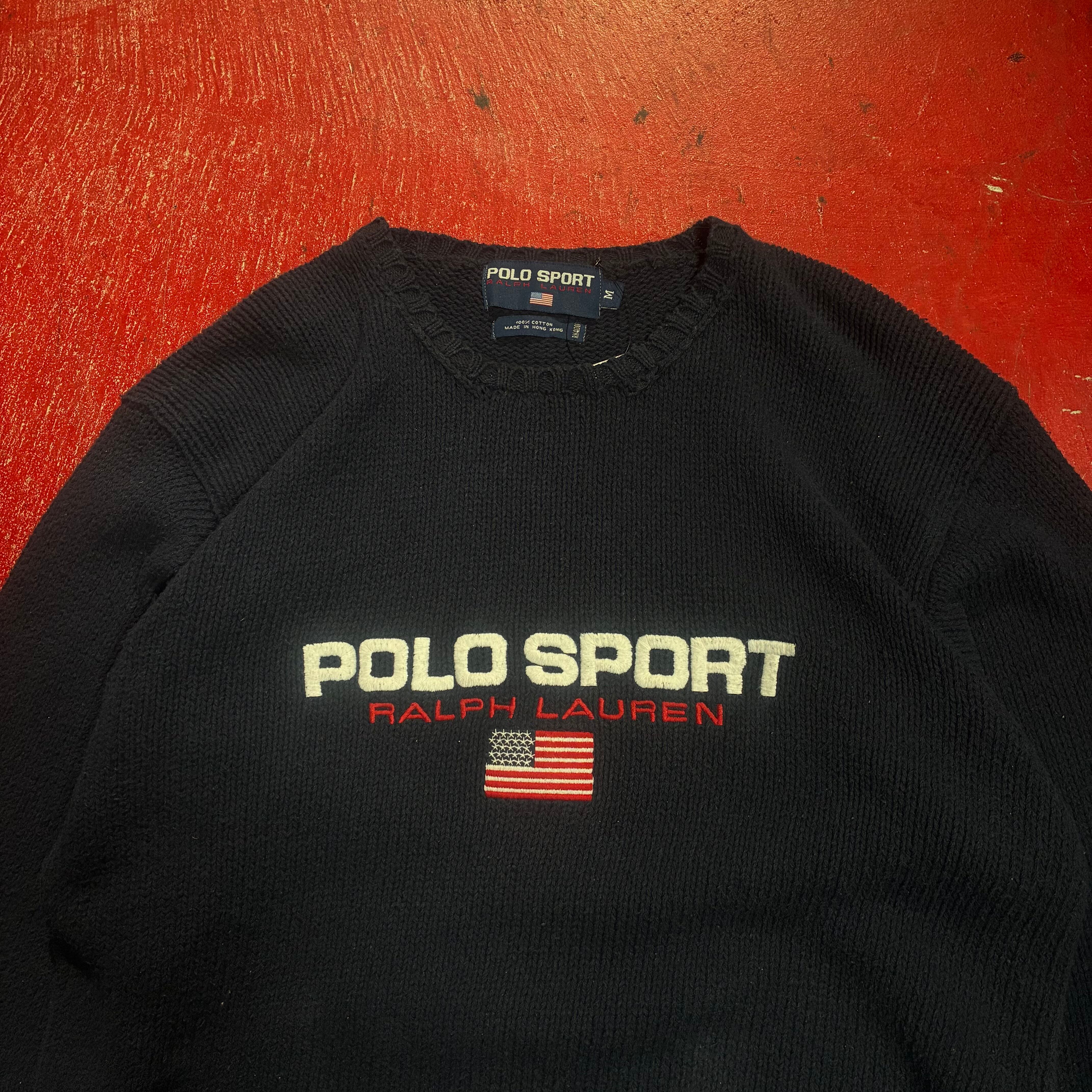 POLO SPORT ポロスポーツ RALPH LAUREN ラルフローレン 90s コットンニット ロゴニット 星条旗ニット ブラックニット ストリート古着 ヒップホップ古着 メンズ