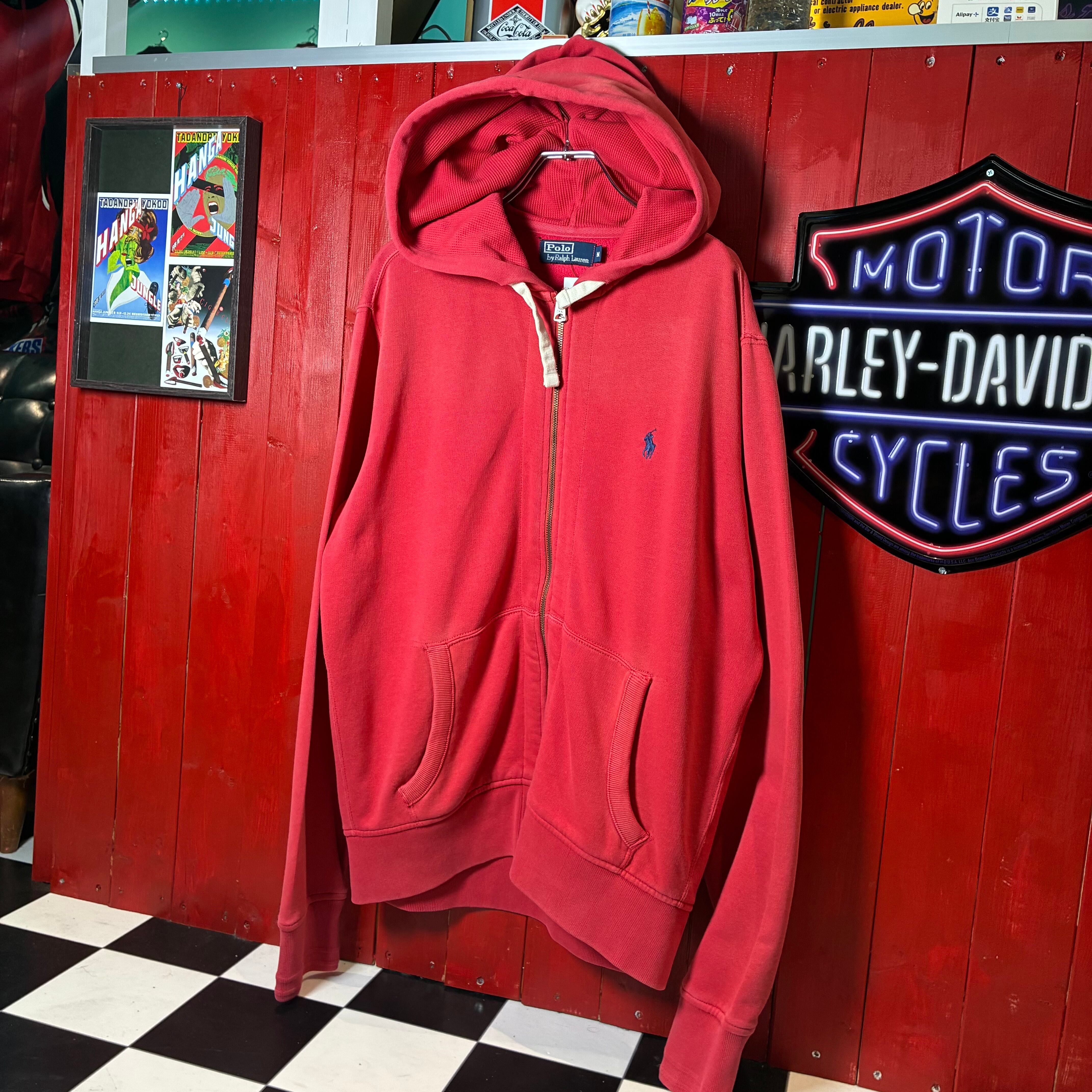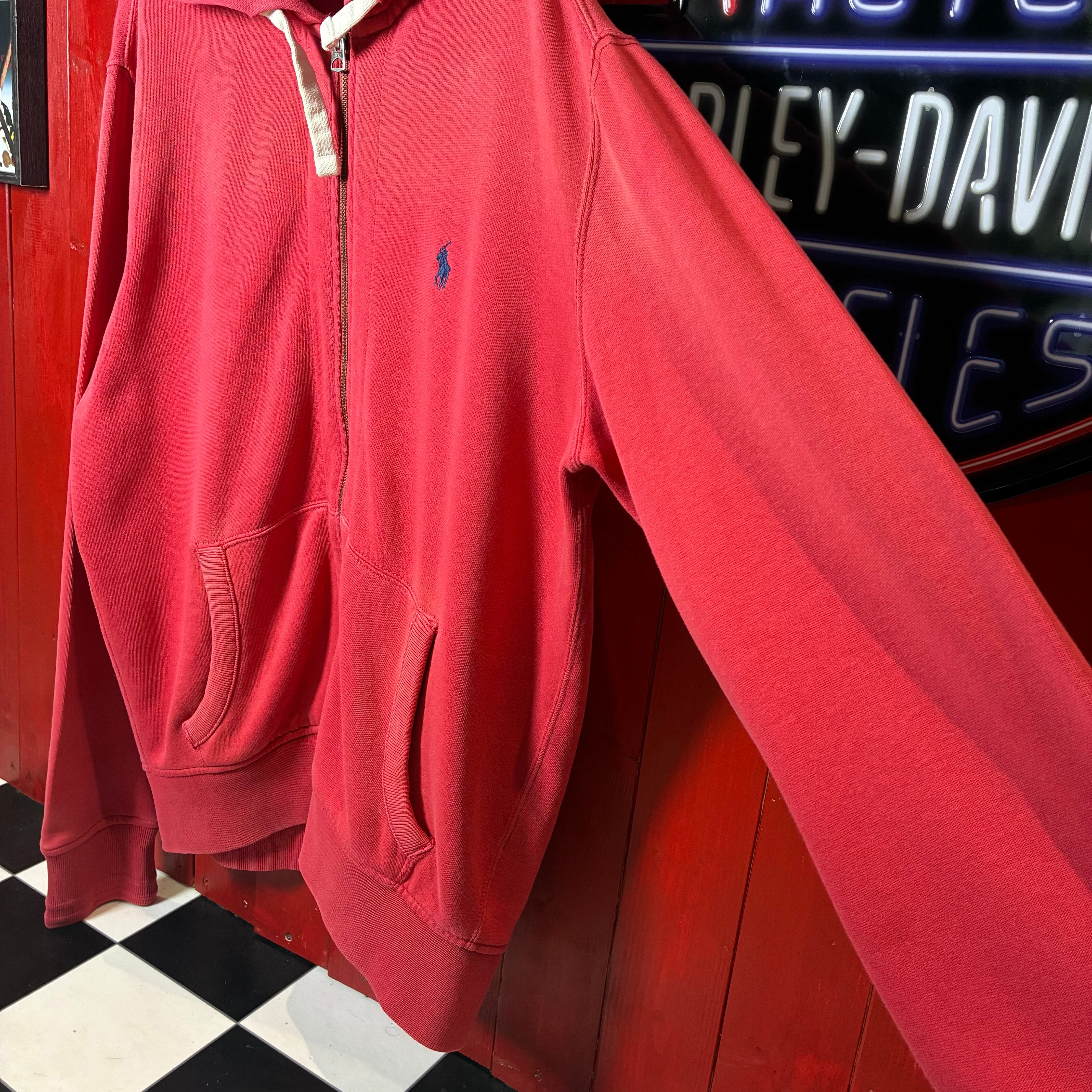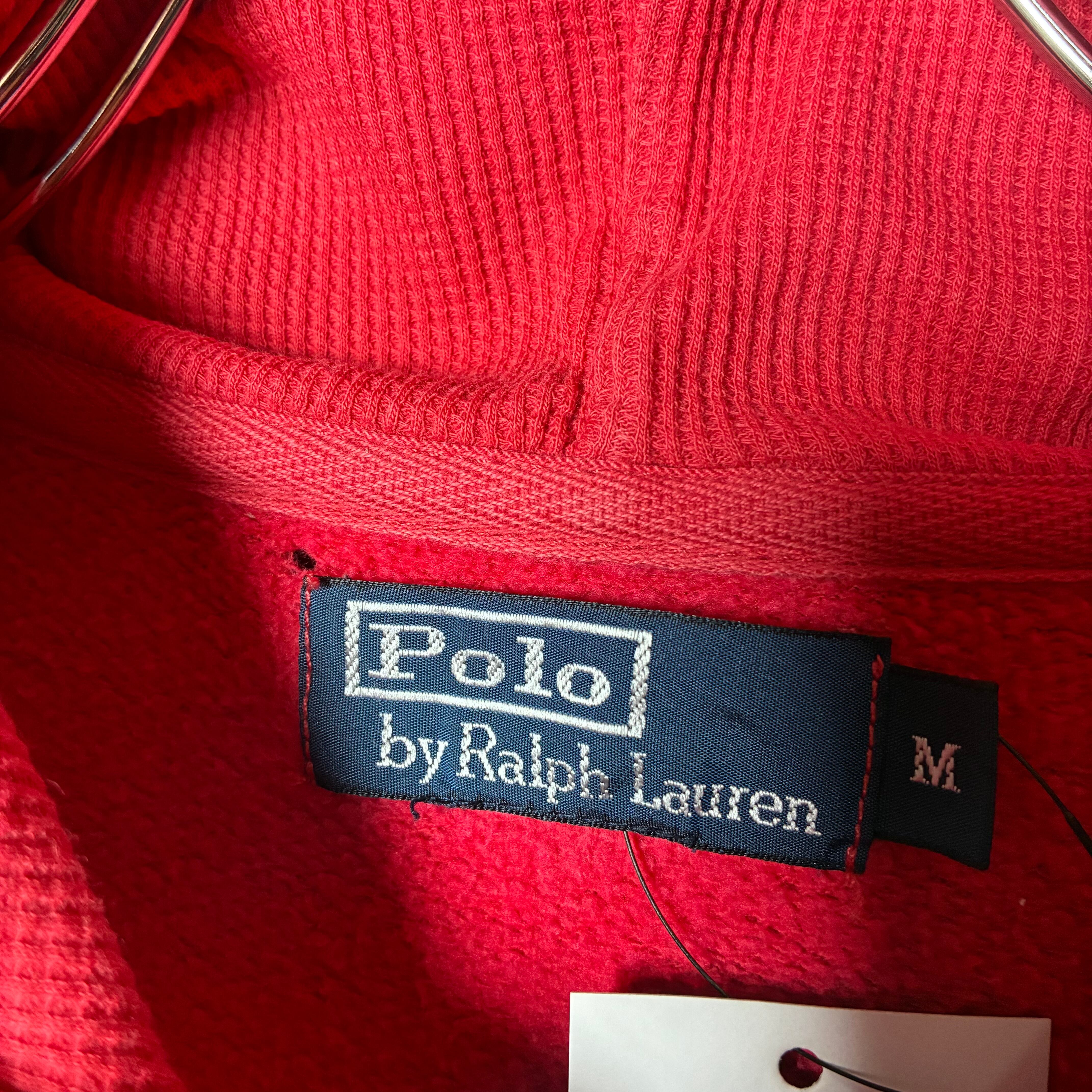 90s POLO RALPH LAUREN ジップパーカー フェードレッド 紺ポニー フード裏サーマル