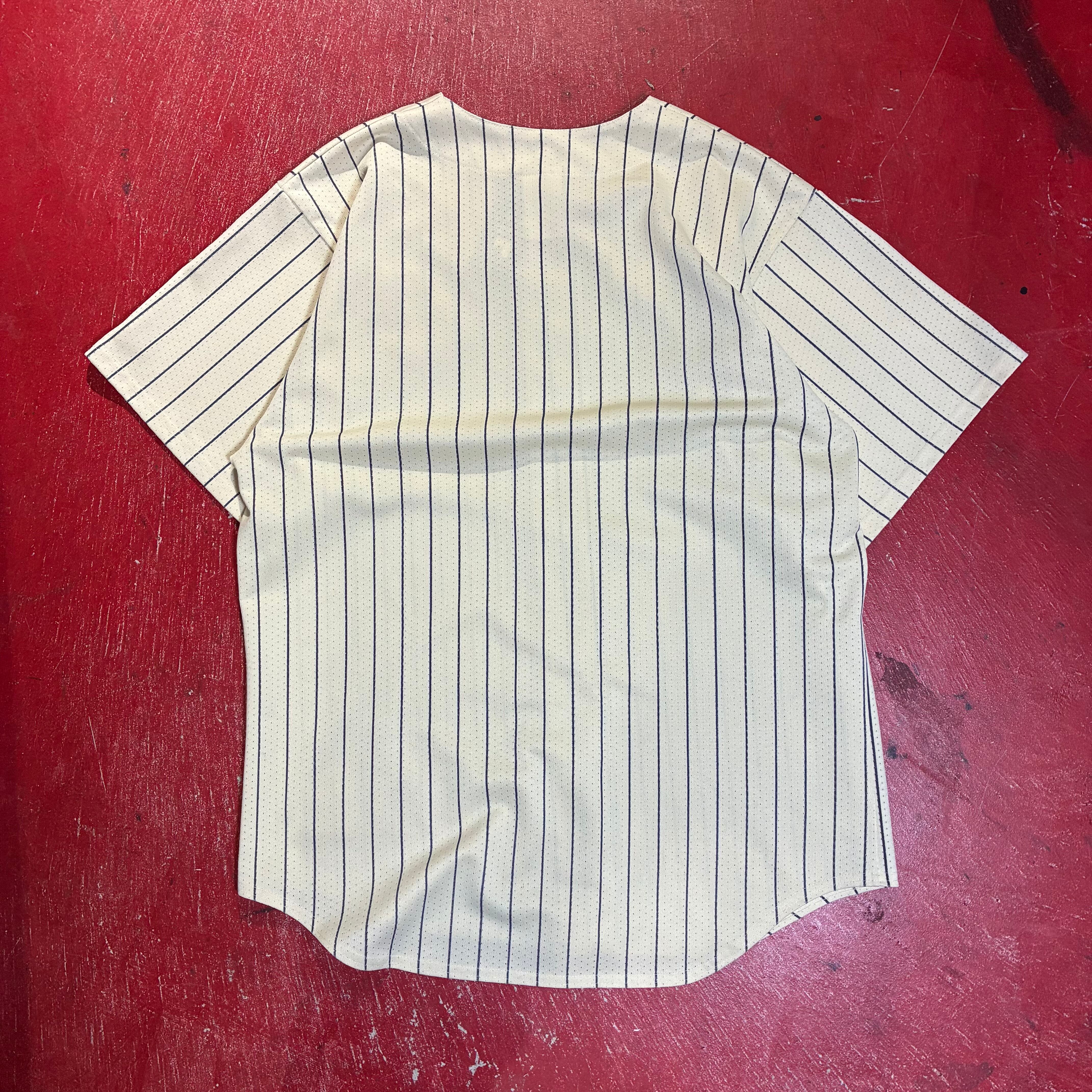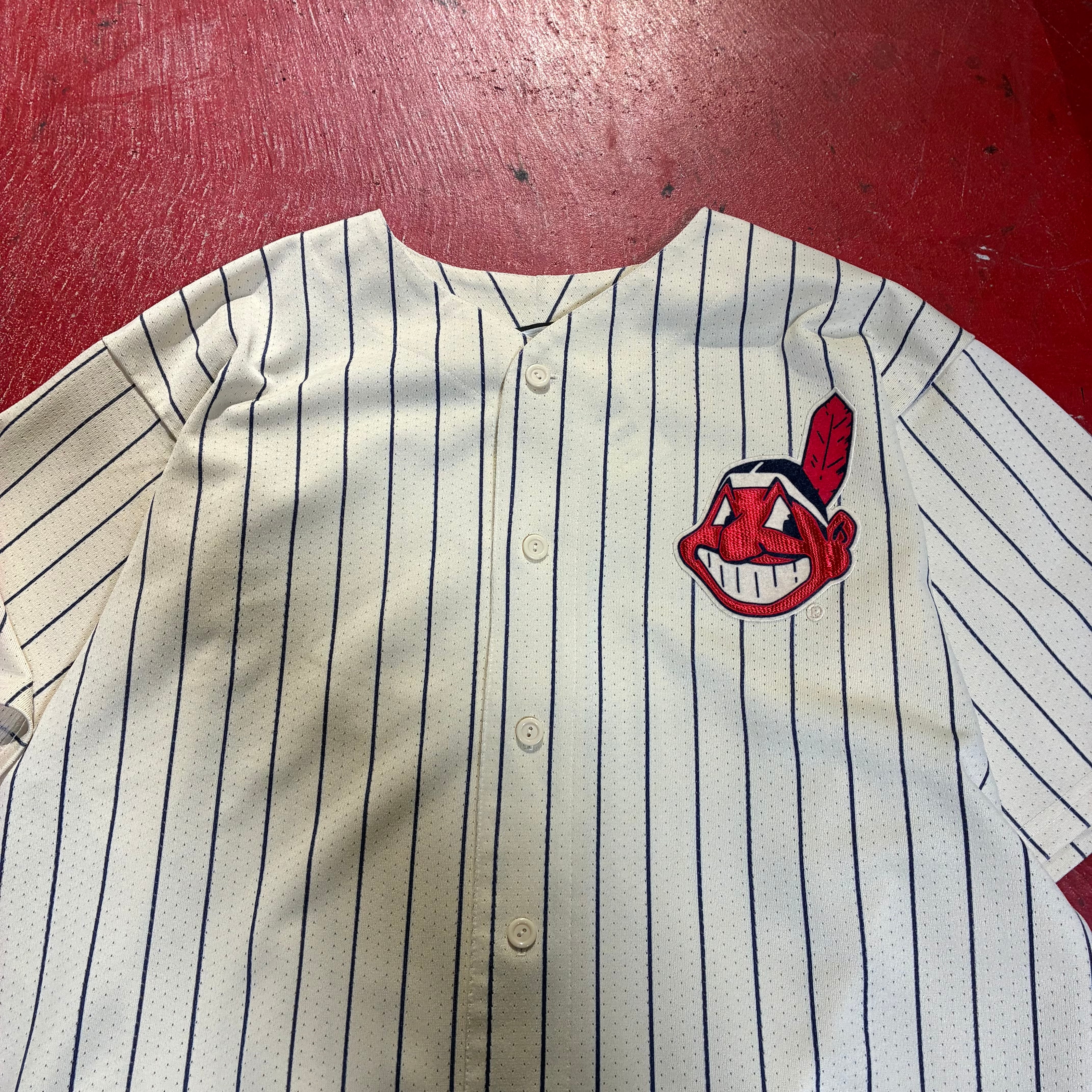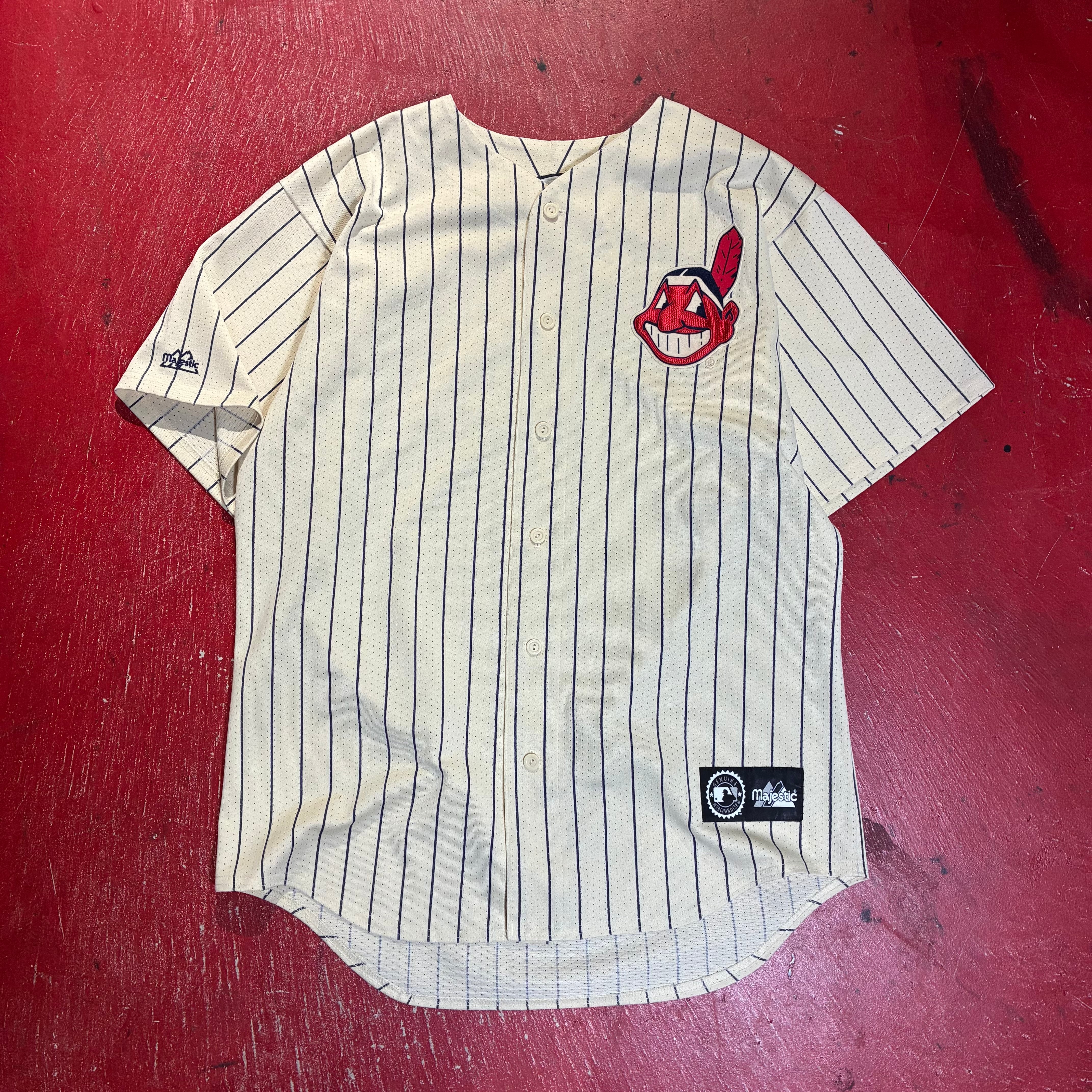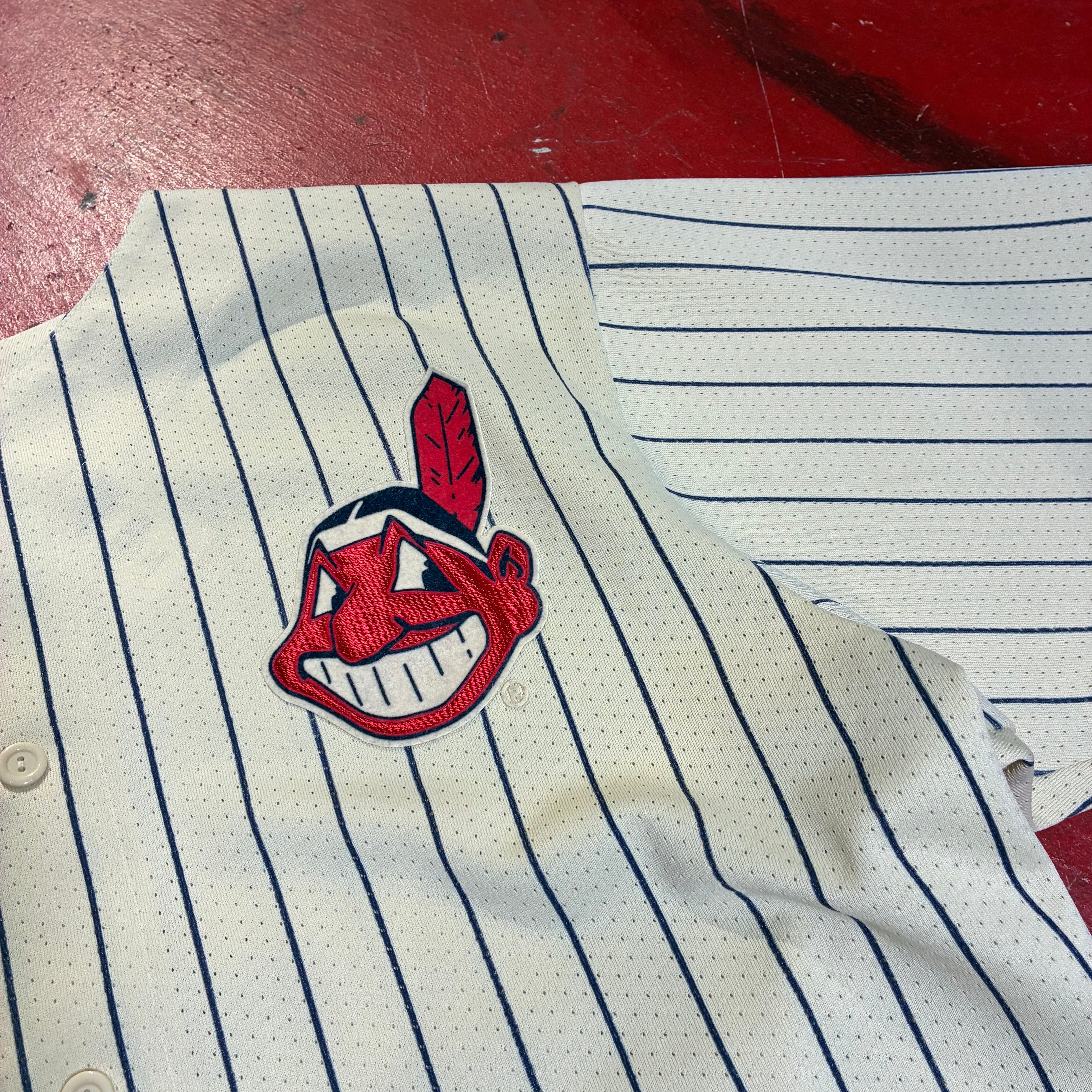 Majestic マジェスティック MLB Cleveland Indians インディアンス ベースボールシャツ ゲームシャツ 90s USA製 ピンストライプ アメカジ ストリート