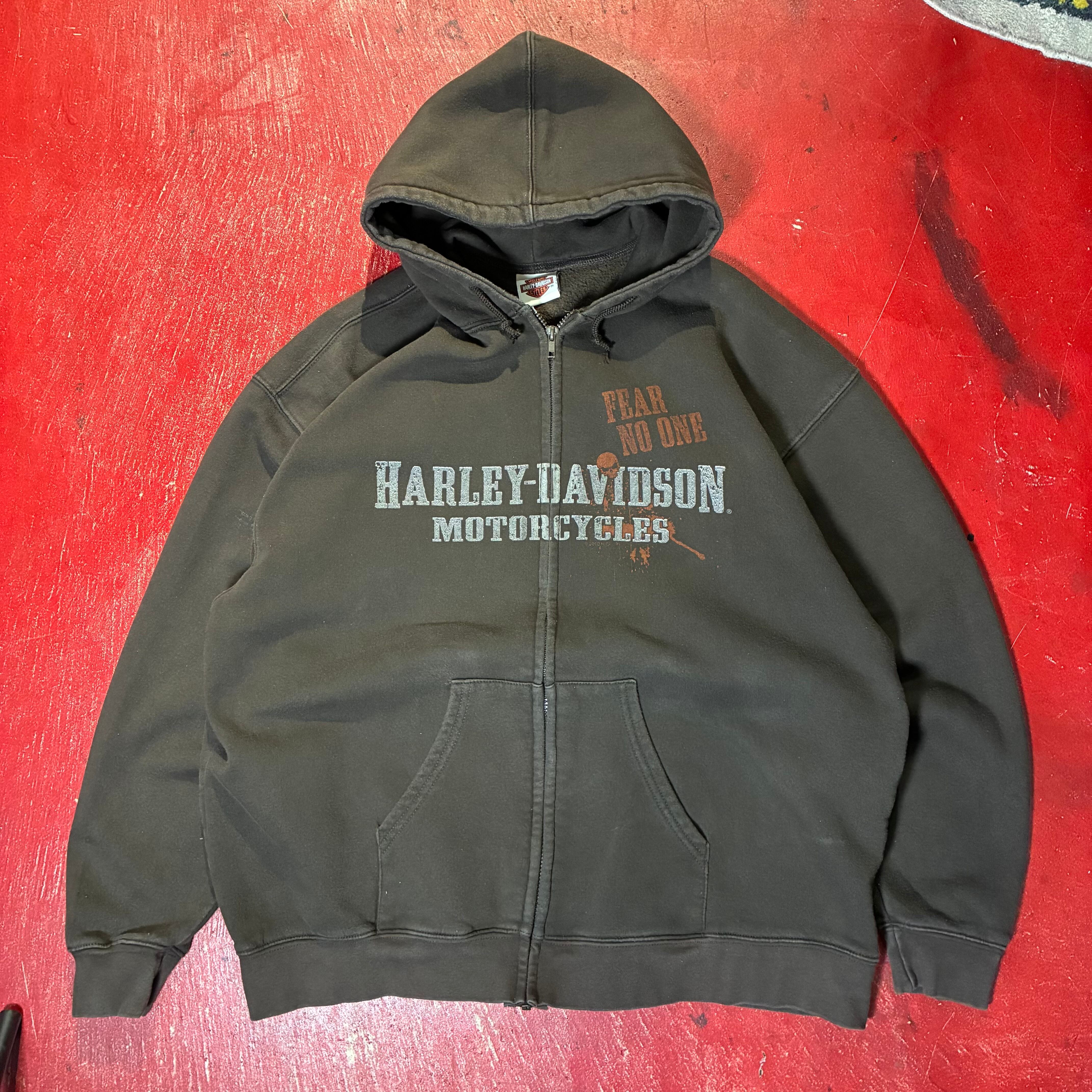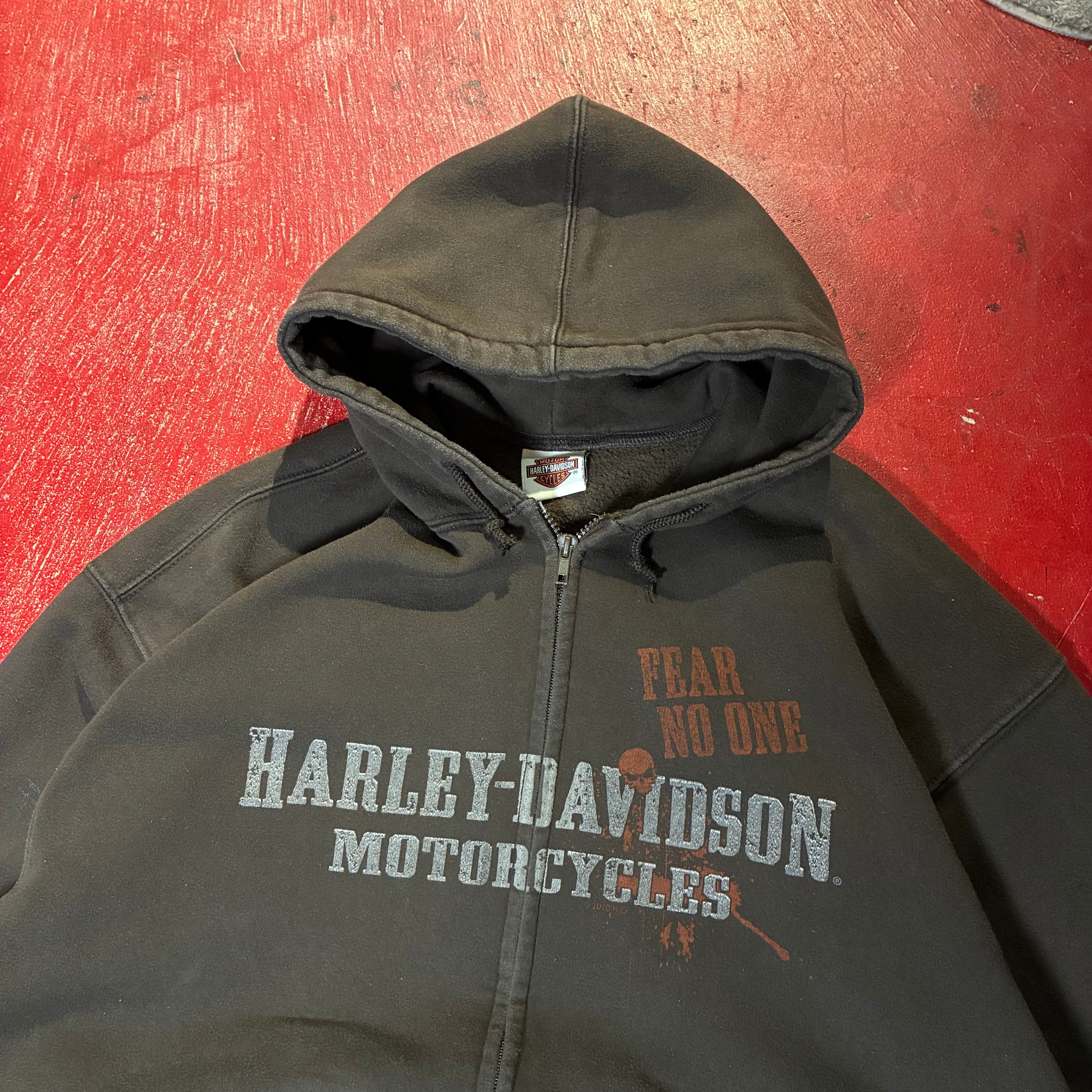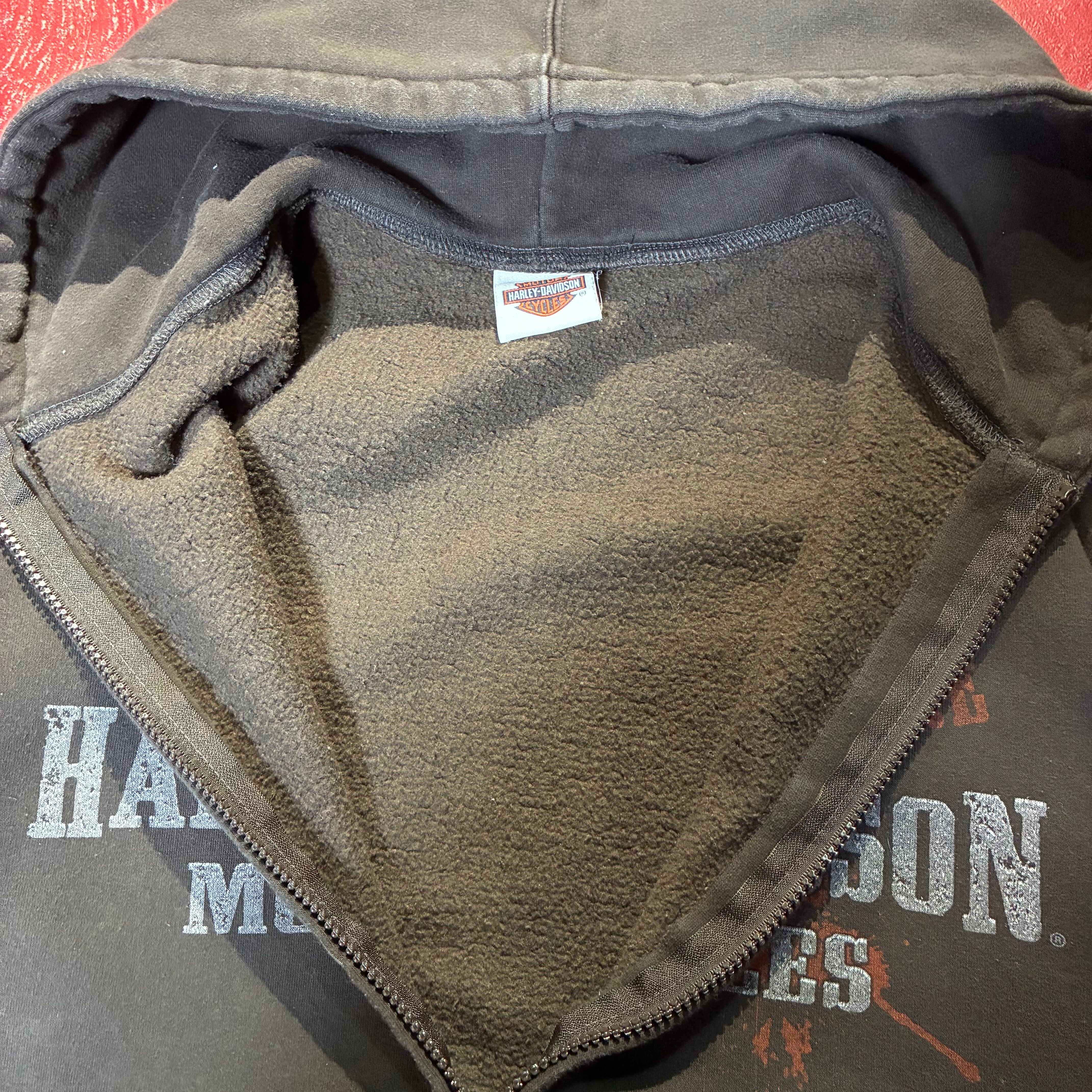 Harley Davidson ハーレーダビッドソン USA製 ジップパーカー スウェットパーカー フーディー フェード ブラウン ローカルプリント アメカジ バイカー 古着 ストリート