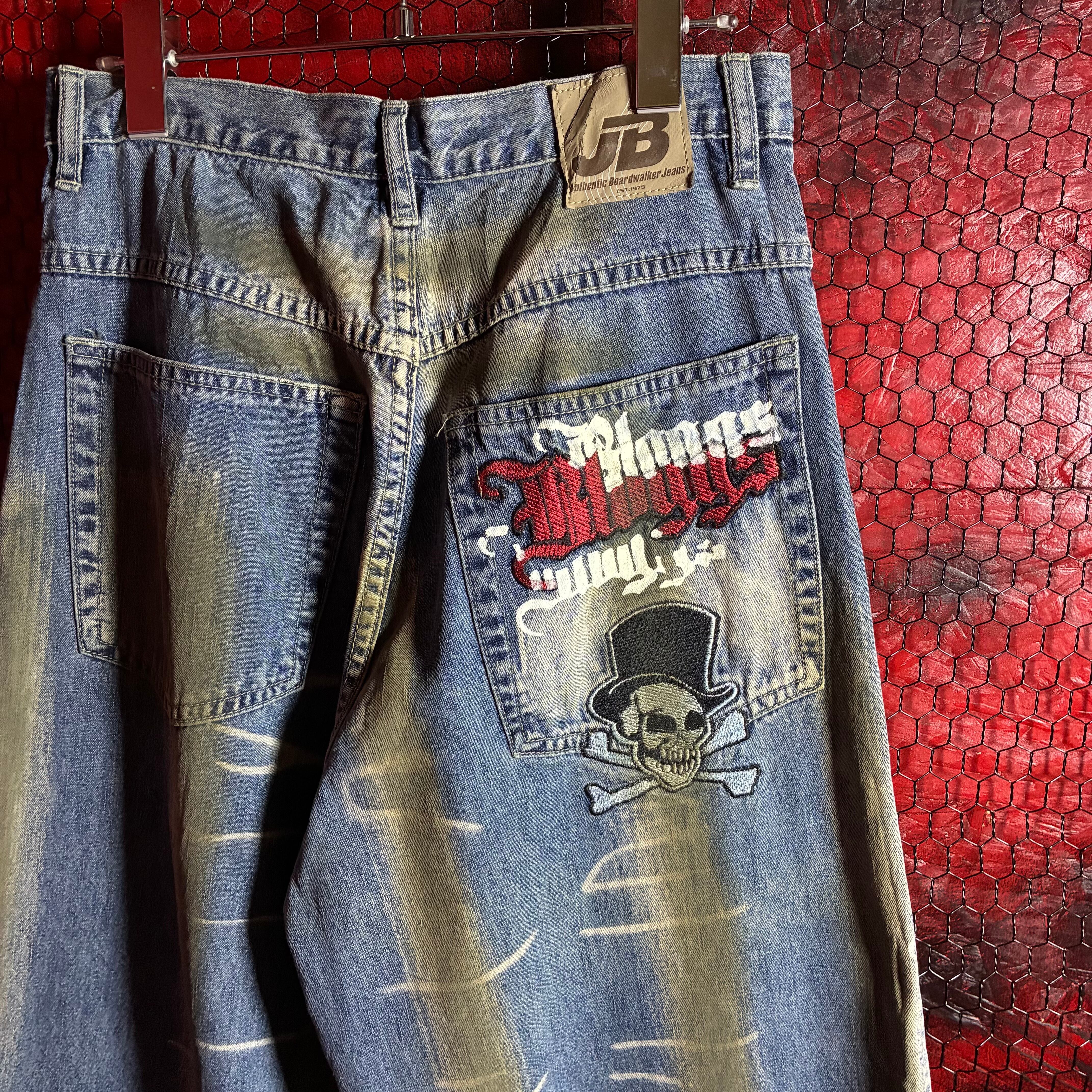 デニムパンツ ワイドデニム フェードデニム グランジ ストリート Y2K スカルデザイン 刺繍デニム バギーパンツ USAストリート 古着
